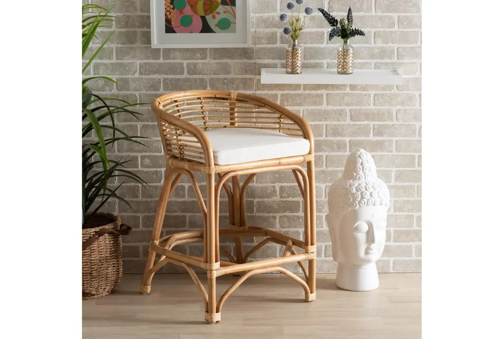 The Mavis Modern White Fabric Upholstered and Natural Brown Rattan Counter Height Stool is a stylish addition to any modern kitchen or dining area. Its sleek design combines the natural beauty of rattan with the comfort of a fabric cushion, making it both functional and aesthetically pleasing.