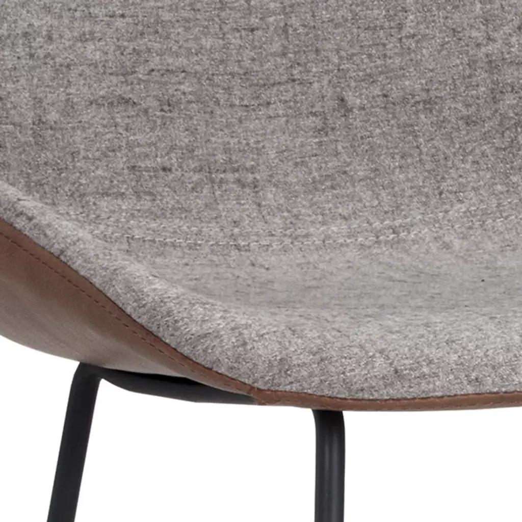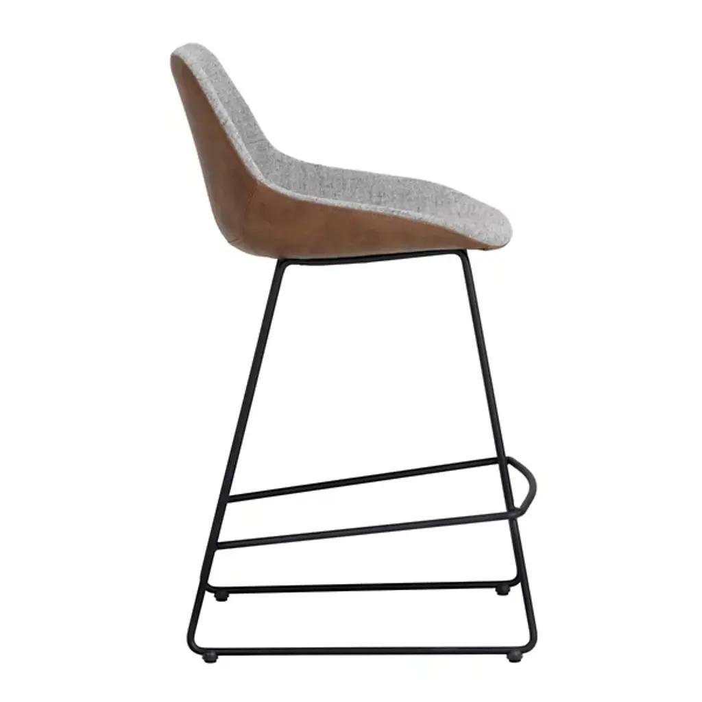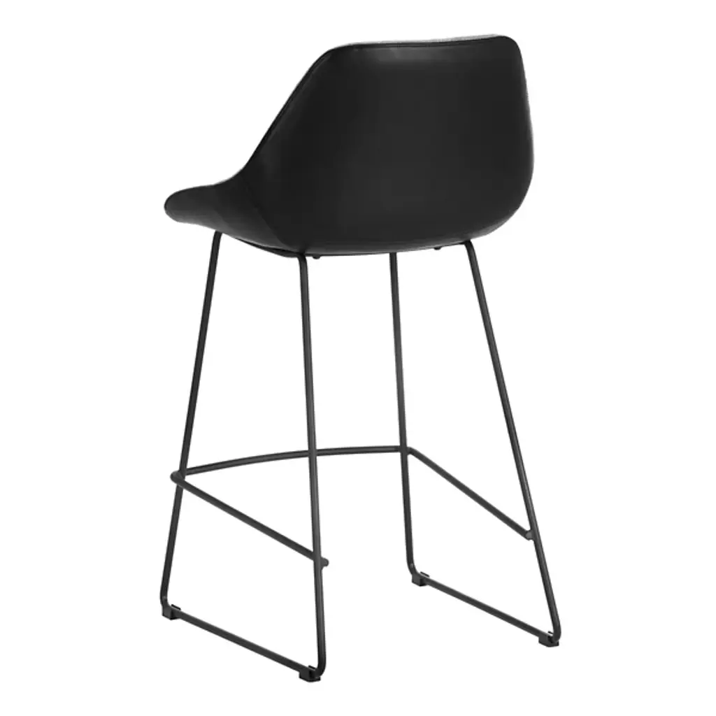 Provide a luxurious retro presence to elevated indoor surfaces with the Mccoy Counter Stool from Sunpan. A slightly flared base of slender steel legs that narrow slightly towards their endpoints steadies each stool, reinforced by a doubled cross brace in a contrasting hue, set partway up the inner leg structure. The design is completed by a comfortable wood seat and back frame with curving sides that offers both style and stability, with each panel upholstered in faux leather stitched into a diamond pattern and accented by a zig-zag stitch around its upper and lower edges.