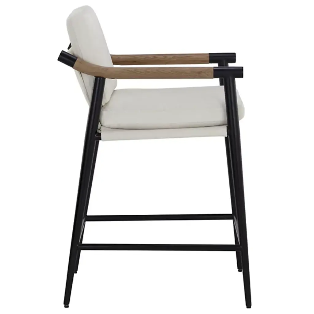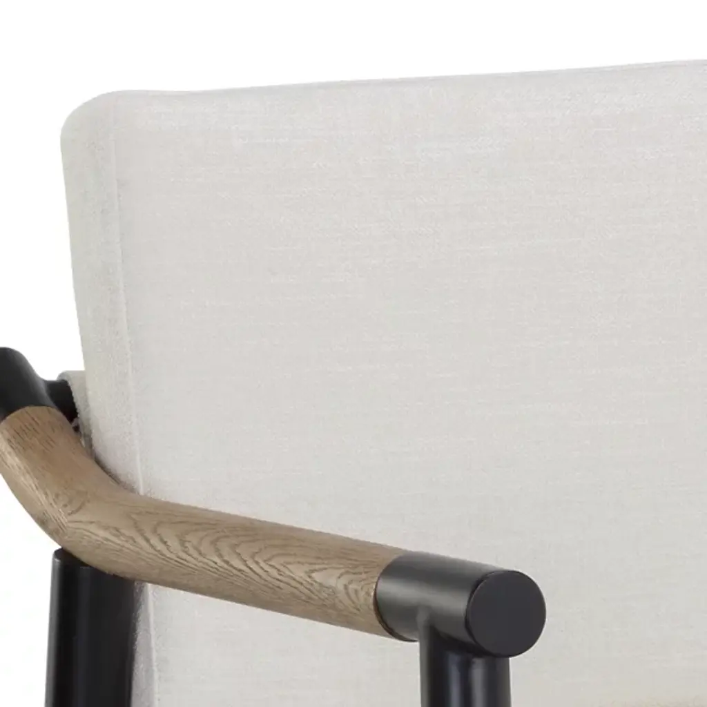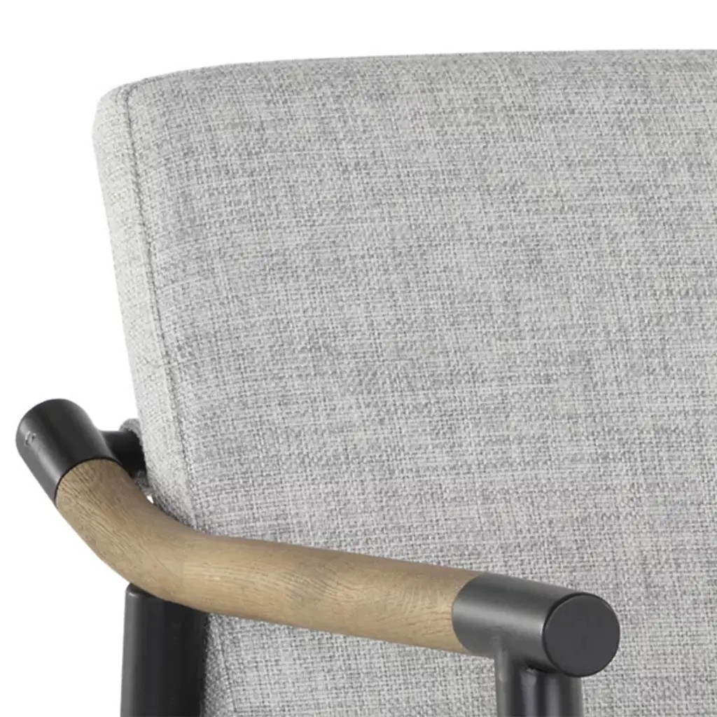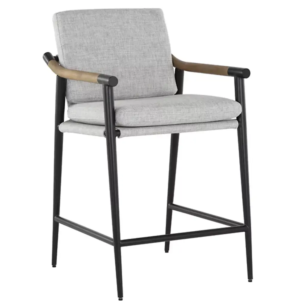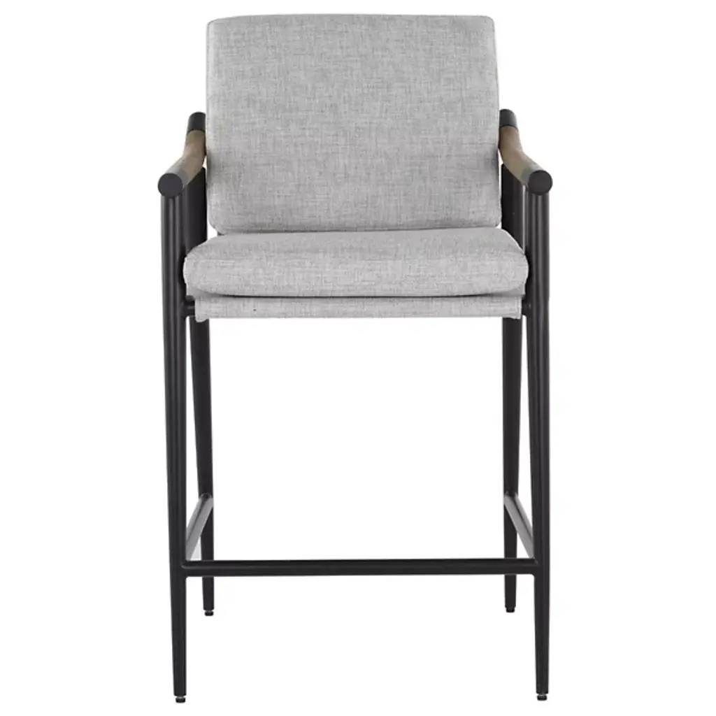 Elevate your seating arrangements with the Meadow Counter Stool from Sunpan, where timeless design intersects with everyday practicality. Each stool is upholstered in soft performance fabric, able to resist stains and moisture, ensuring lasting beauty and easy care. Its black iron frame is accented by solid oak wood armrests, blending natural warmth with industrial edge. The tall seat and integrated footrest offer both style and support, while the wood's unique grain and organic variations make each piece unique.