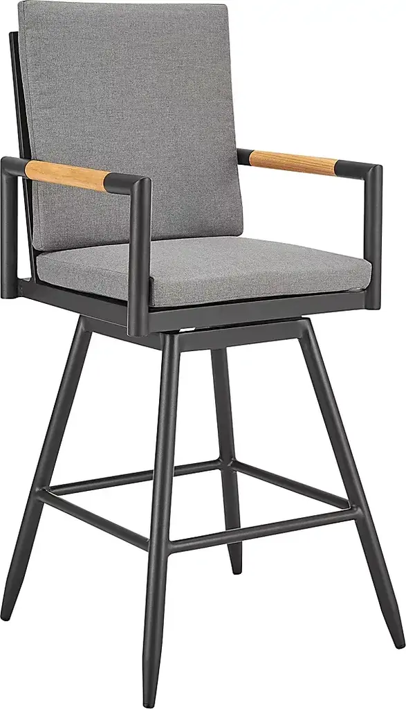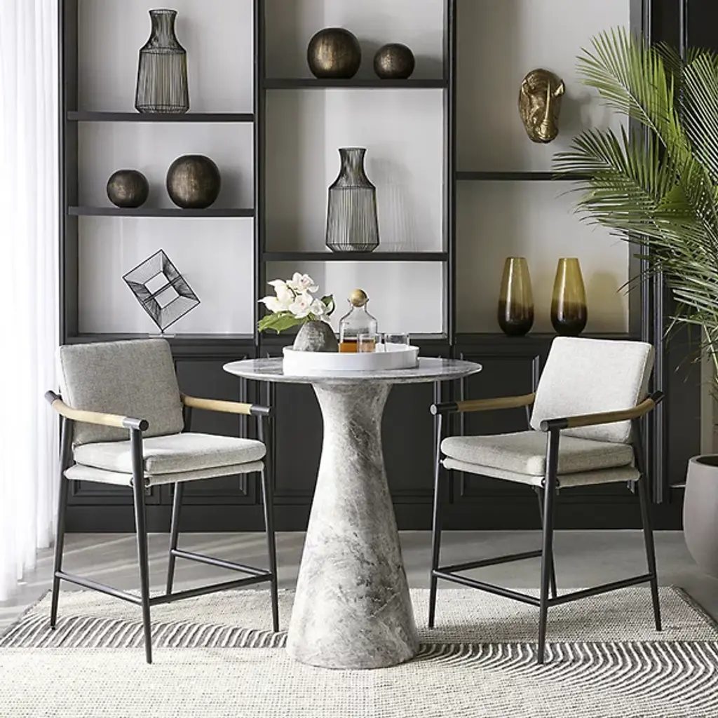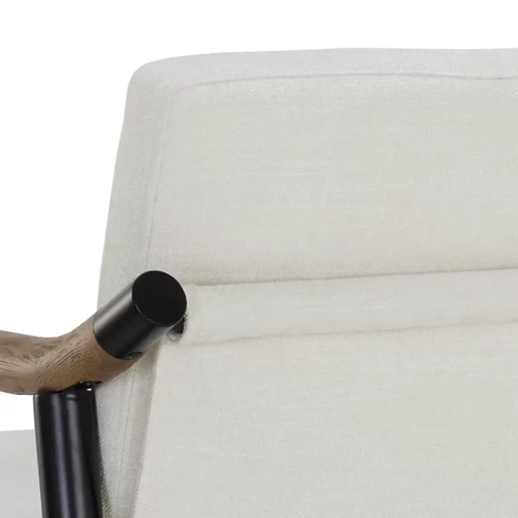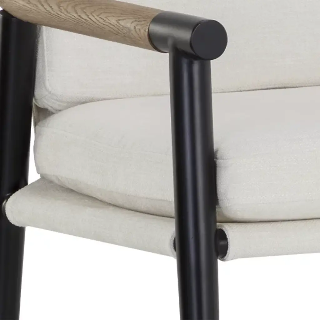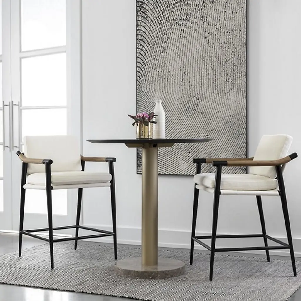 Elevate your seating arrangements with the Meadow Counter Stool from Sunpan, where timeless design intersects with everyday practicality. Each stool is upholstered in soft performance fabric, able to resist stains and moisture, ensuring lasting beauty and easy care. Its black iron frame is accented by solid oak wood armrests, blending natural warmth with industrial edge. The tall seat and integrated footrest offer both style and support, while the wood's unique grain and organic variations make each piece unique.
