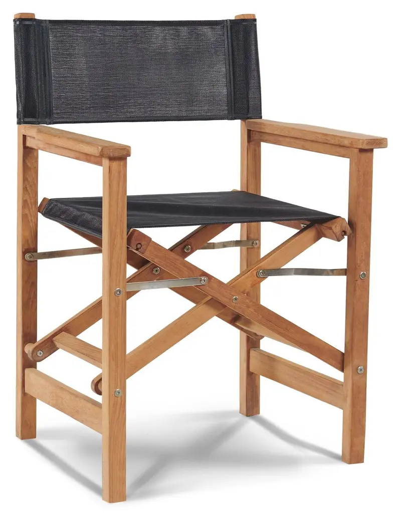 The frame of this director's chair is crafted of sustainably sourced plantation teak, which resists moisture, warping, and cracking. (It even repels termites!) The seat and back are made of weather-resistant texteline, which provides an ideal balance of support and give. The chair is lightweight and foldable for easy storage.