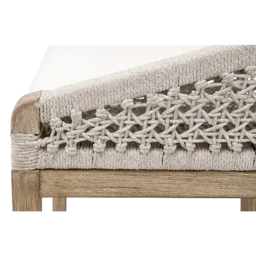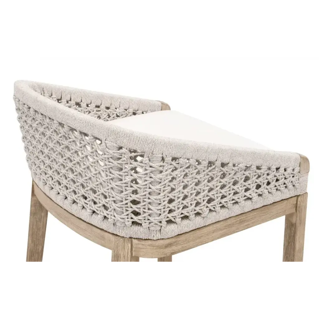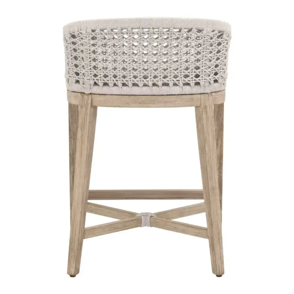 The Montecito Counter Stool by Essentials For Living offers a contemporary take on coastal style, perfect for transitional spaces. With a sturdy solid mahogany base in natural gray and aluminum frame supporting the rope seat, this stool stands at 21†wide, 21.5†deep, 32.25" high, with a seat height of 27". The handwoven white speckle rope seat adds a unique textural element. The fixed seat cushion is upholstered with high-performance LiveSmart Peyton-Pearl fabric, which makes cleaning easy. The legs are designed with extra support in mind, as it is crafted with an X-brace with rope detail at the center. The footrest features a metal cover to provide durability and support. This beach-inspired counter stool will be a lasting addition to any bar or dining space.