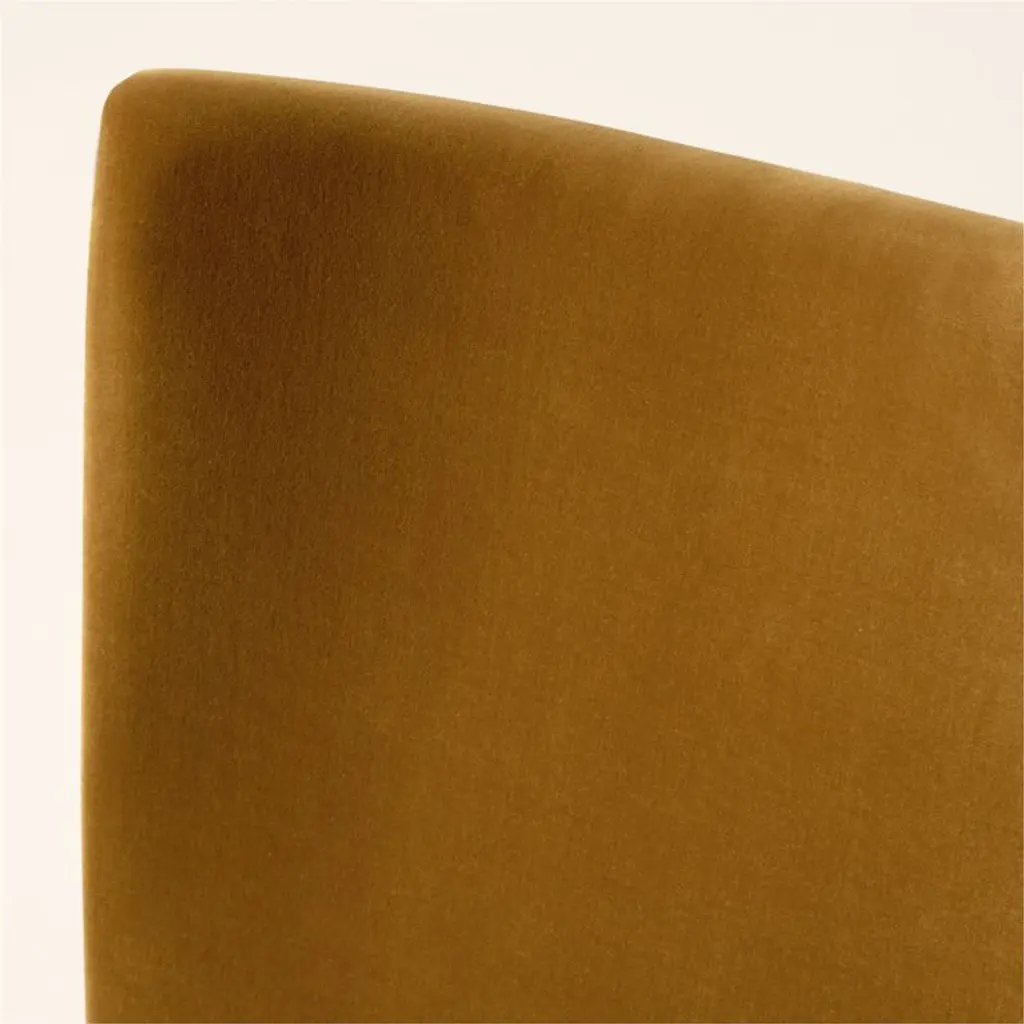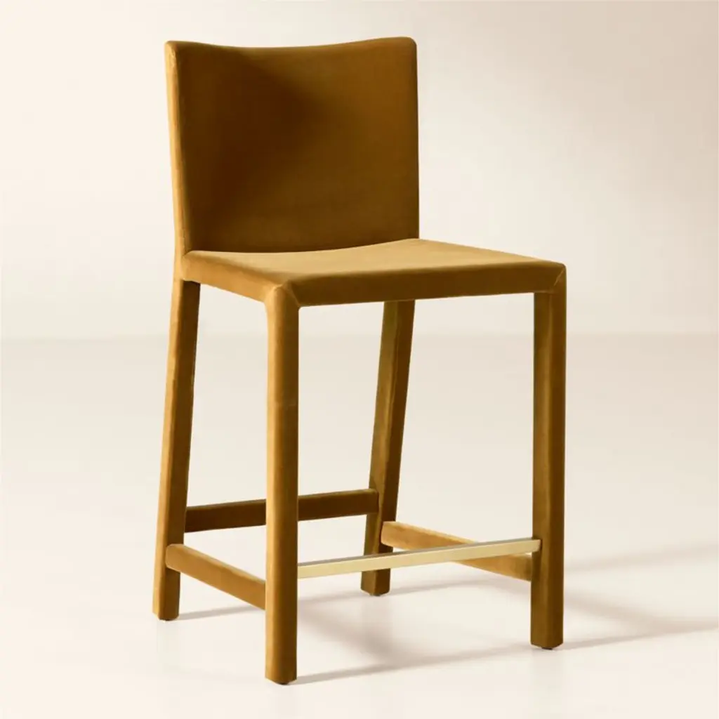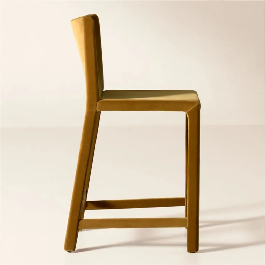 Sleek lines and tailored detailing elevate modern counter stool by Caleb Zipperer. Fully upholstered in luxe cotton-rich velvet in a saturated turmeric hue, stool features crisp mitered corners and stitching for a clean, structured look. CB2 exclusive.