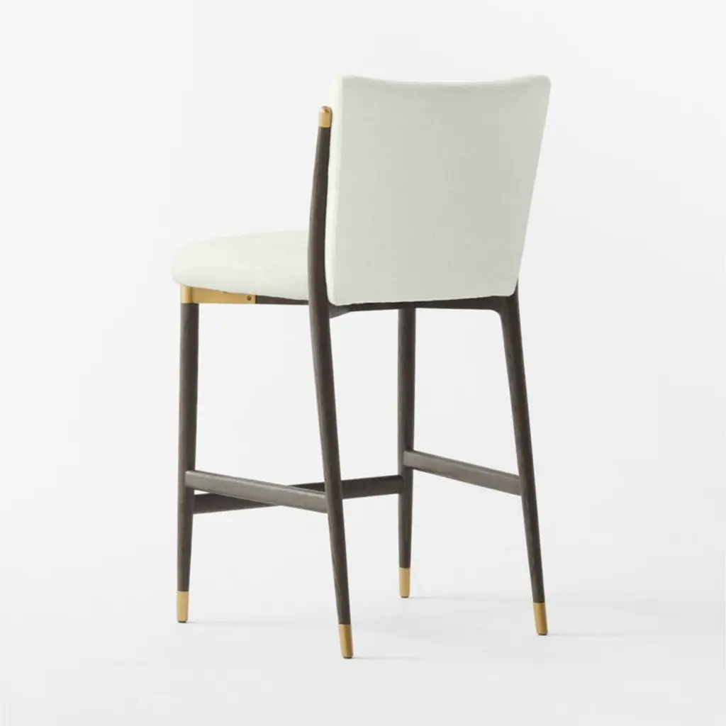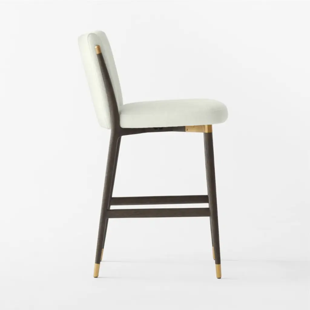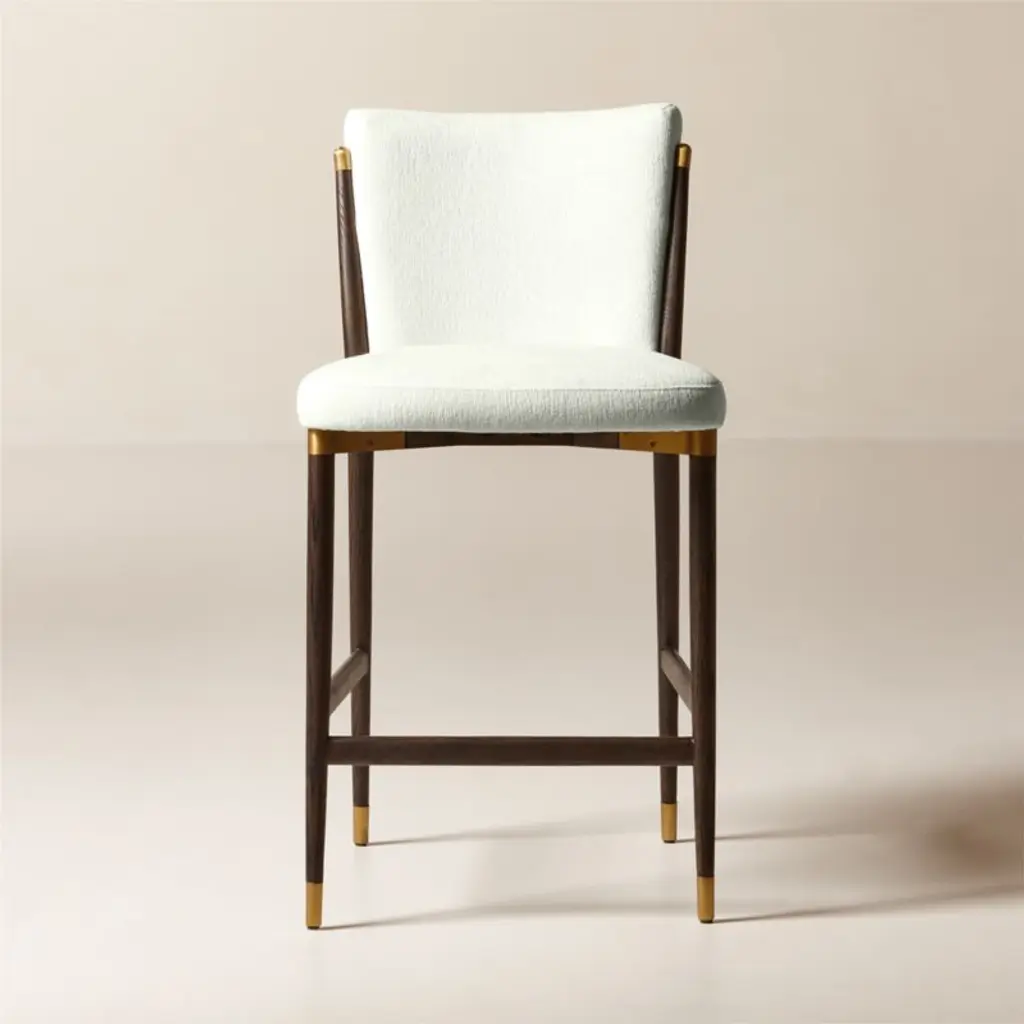 Refined armless counter stool designed by Caleb Zipperer is crafted from solid red oak certified sustainable by the Forest Stewardship Council (FSC). The wood is turned on a special lathe to create a remarkably thin frame rarely seen outside of bespoke designs. To master the complex process, a team of skilled craftspeople make a small number of stools each day in three stages, finishing the look with warm brass accents to dress it up. White upholstery is full of soft, touchable texture with a performance finish that resists stains and spills with ease. CB2 exclusive.