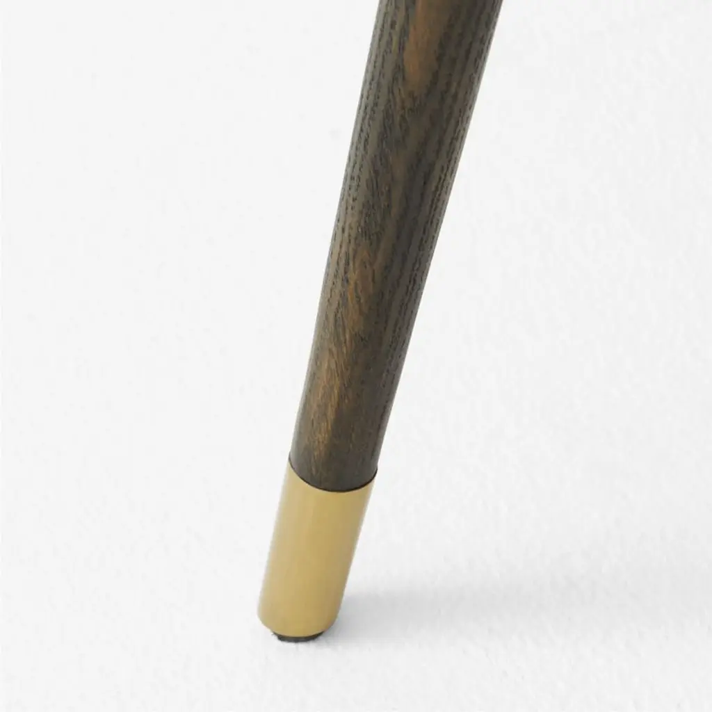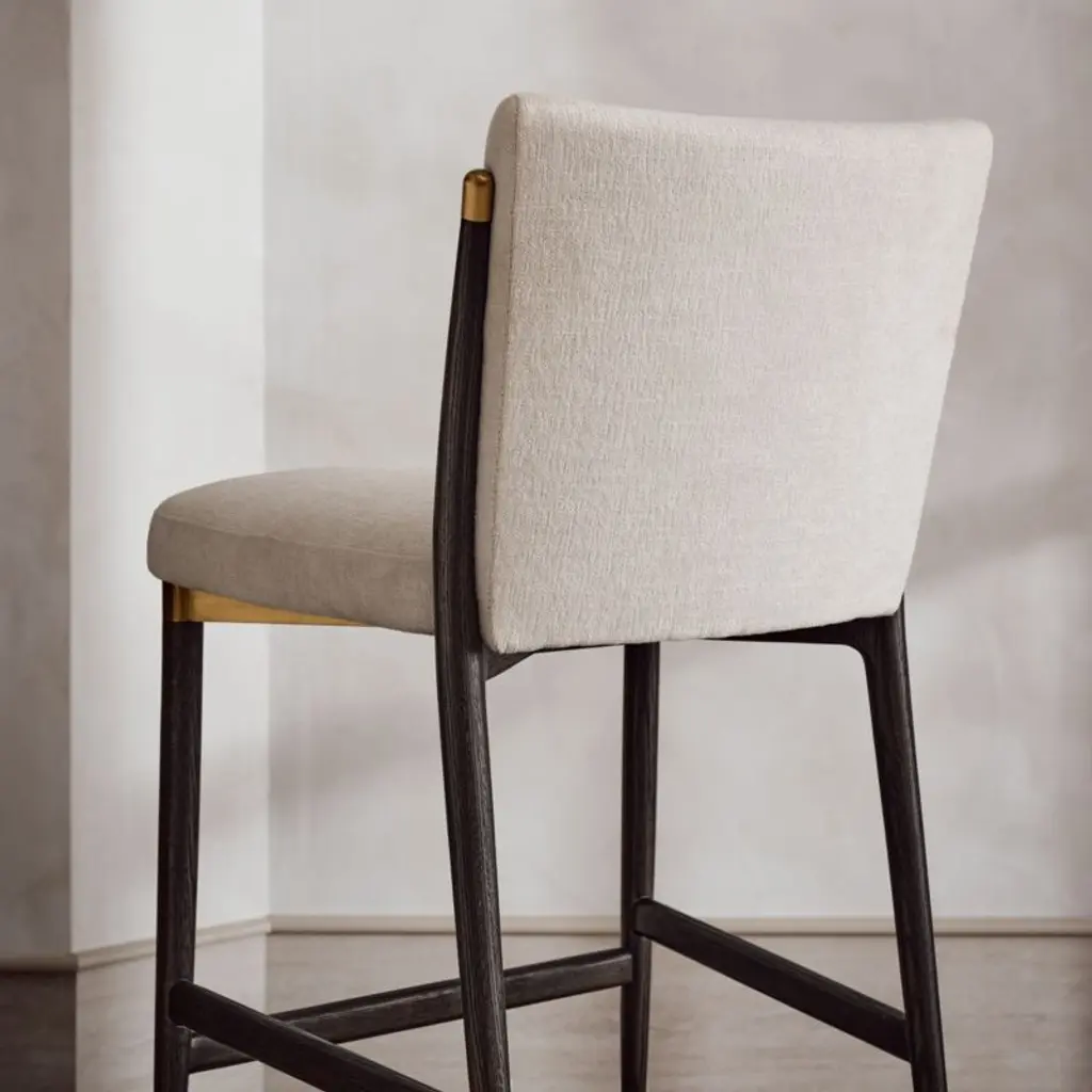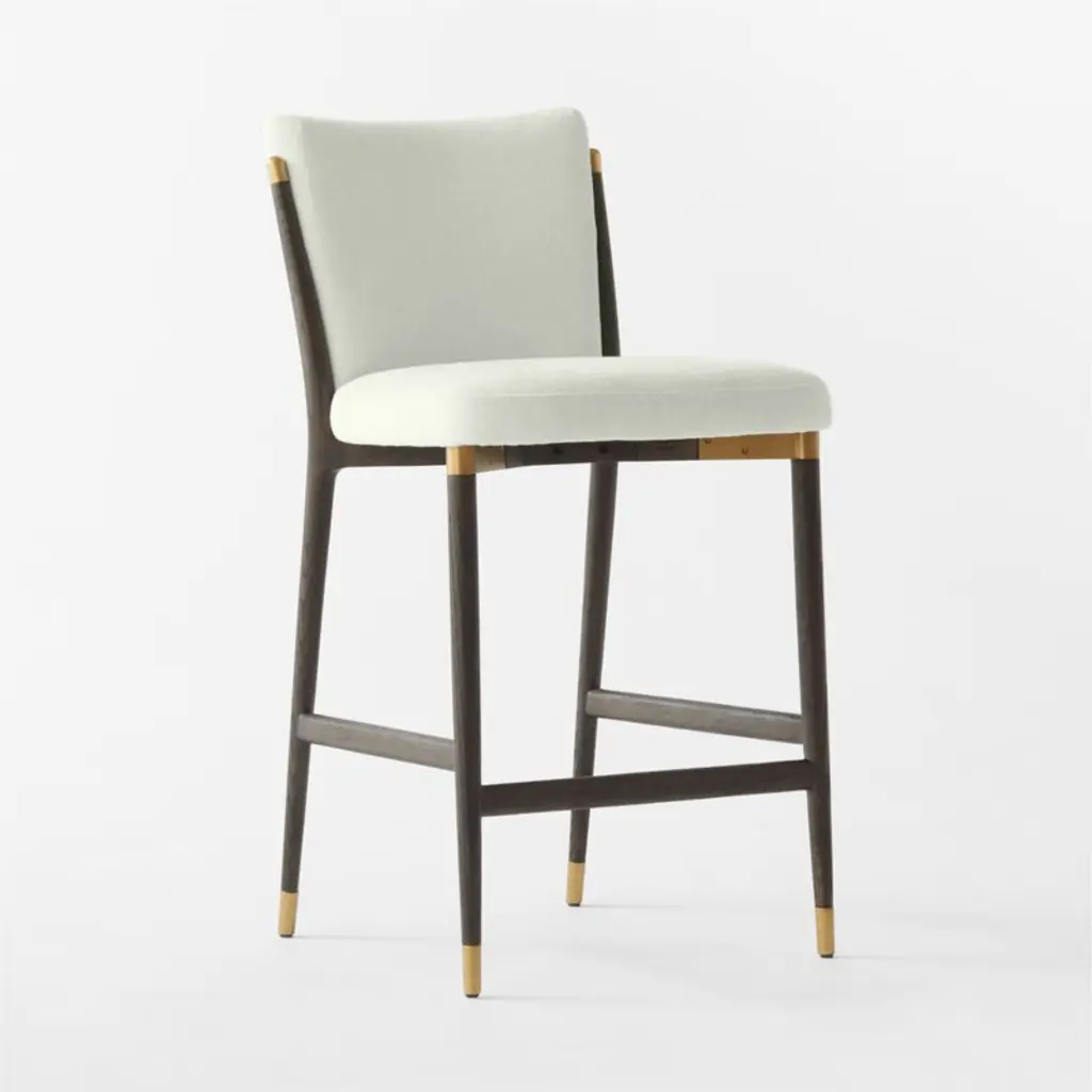 Refined armless counter stool designed by Caleb Zipperer is crafted from solid red oak certified sustainable by the Forest Stewardship Council (FSC). The wood is turned on a special lathe to create a remarkably thin frame rarely seen outside of bespoke designs. To master the complex process, a team of skilled craftspeople make a small number of stools each day in three stages, finishing the look with warm brass accents to dress it up. White upholstery is full of soft, touchable texture with a performance finish that resists stains and spills with ease. CB2 exclusive.