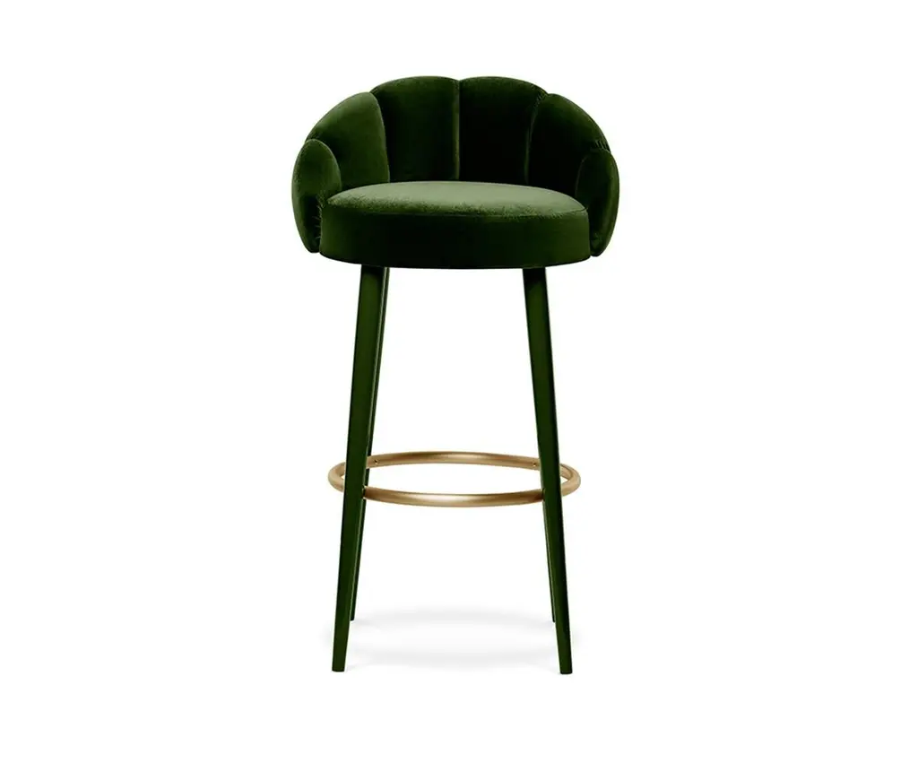 Olympia Counter Stool by MunnaDimensions: D 55 x W 58 x H 90 cm. SH: 70 cm.Materials: Solid wood, foam, brass, and upholstery.Finish: Upholstery: Cotton Velvet, ref. Emerald, CV09. Ring: Brushed brass. Legs: Emerald gloss lacquer.Available in all Munna fabrics except Wild Silk. Available in client’s ownmaterial. Legs are available in solid Walnut, Wengé stain or lacquer in all RAL colors, in matt or gloss. The ring is available in Brass, Nickel or Copper in polished or brushed. Handmade in Porto. Please contact us.Established in Porto in 2008, Munna is a furniture design brand renowned for creating handmade upholstery with unmatched craftsmanship, seamlessly blending noble materials and timeless design, for both commercial and residential projects.Made by hand in Porto, Munna’s pieces honor the profound heritage of craftsmanship, while drawing inspiration from history’s most influential artistic periods. Munna’s pieces are made of the finest fabrics such as cotton velvet, twill, leather, and silk; the finest wood veneers, such as ebony, walnut, and rosewood; sumptuous gold, silver, and copper leaves, metal details in brass, nickel, and copper, and superior lacquers.