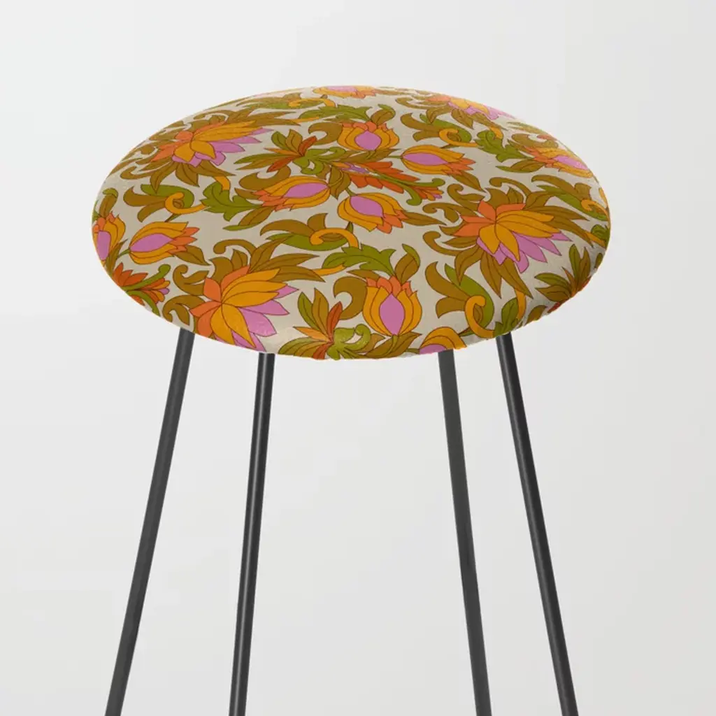 Orange, Pink Flowers And Green Leaves 1960s Retro Vintage Pattern Stool