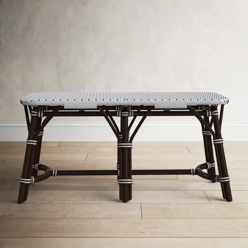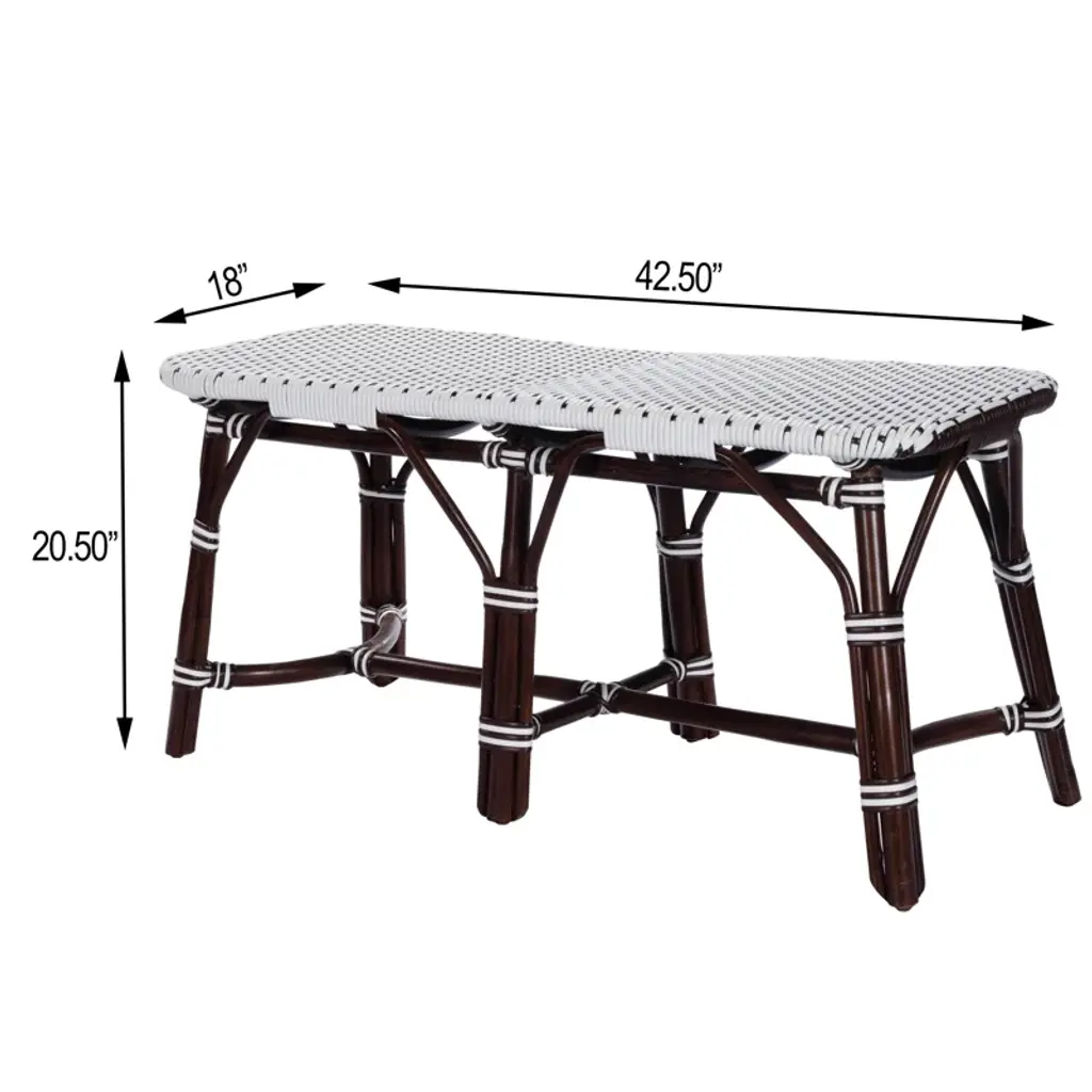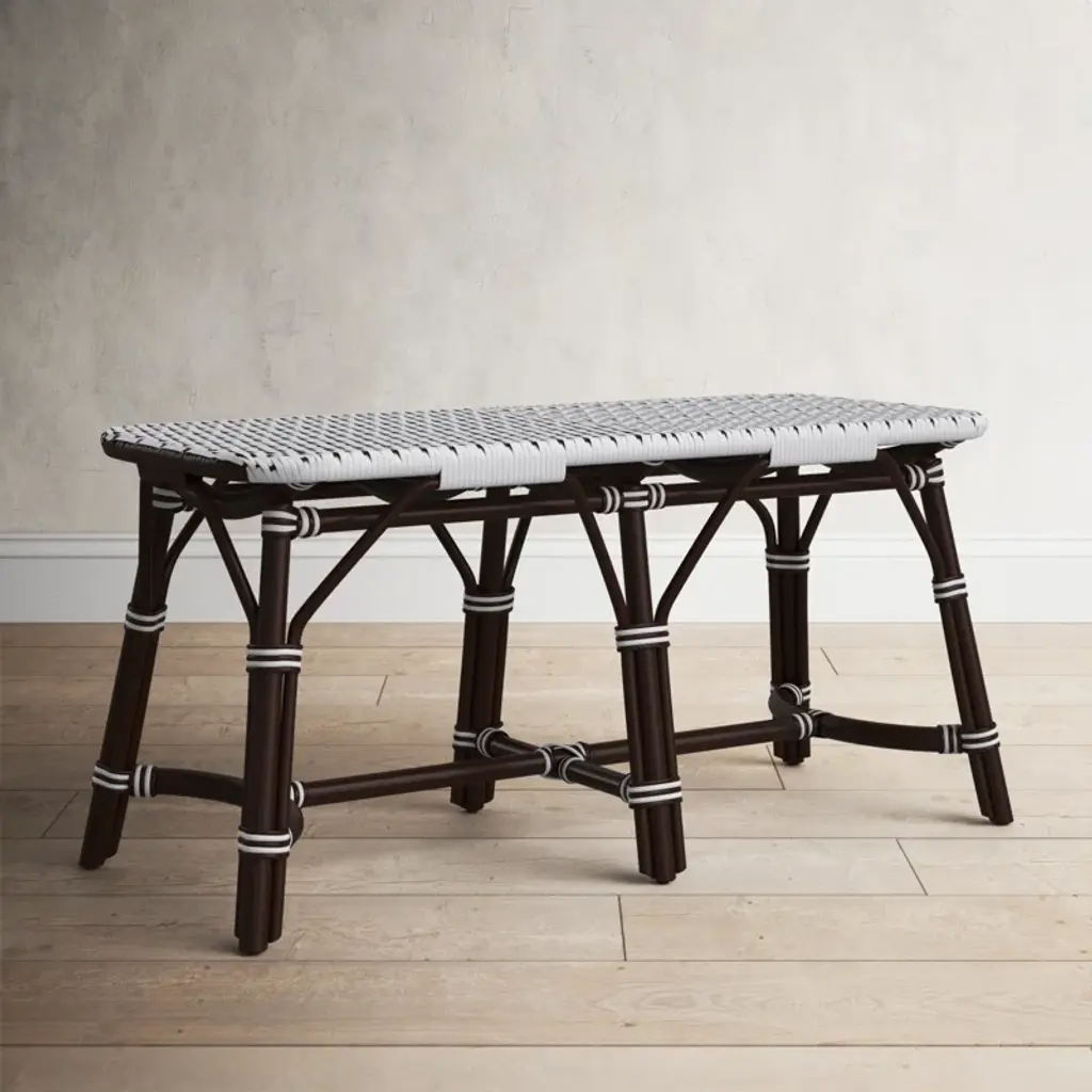 This distinctive coastal-inspired bench will provide years of beauty and function in an entryway, kitchen, living room, bedroom, or sunroom. It features a water resistant polyethylene plastic seat in a stylish white and black basket weave pattern. Finished in a rich chocolate brown stain, its solid rattan base provides exceptional strength and durability. Consider pairing with matching counter stool style number 5399354 to expand the coastal them of this bench and to further transform you space.