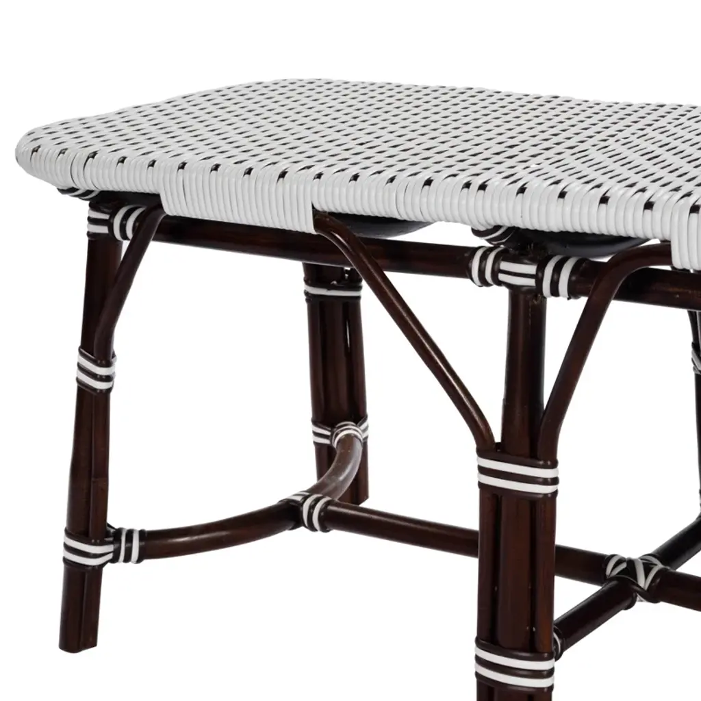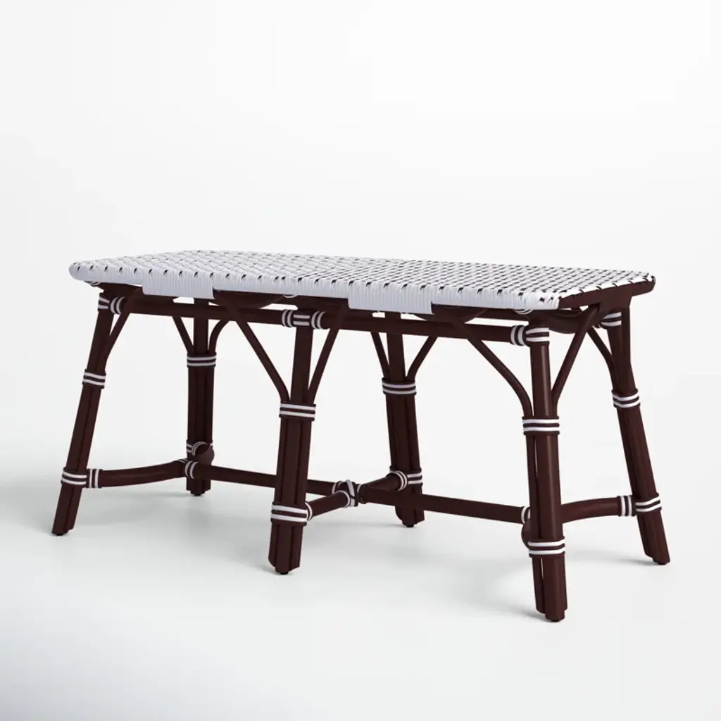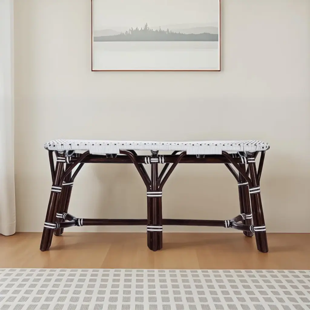 This distinctive coastal-inspired bench will provide years of beauty and function in an entryway, kitchen, living room, bedroom, or sunroom. It features a water resistant polyethylene plastic seat in a stylish white and black basket weave pattern. Finished in a rich chocolate brown stain, its solid rattan base provides exceptional strength and durability. Consider pairing with matching counter stool style number 5399354 to expand the coastal them of this bench and to further transform you space.