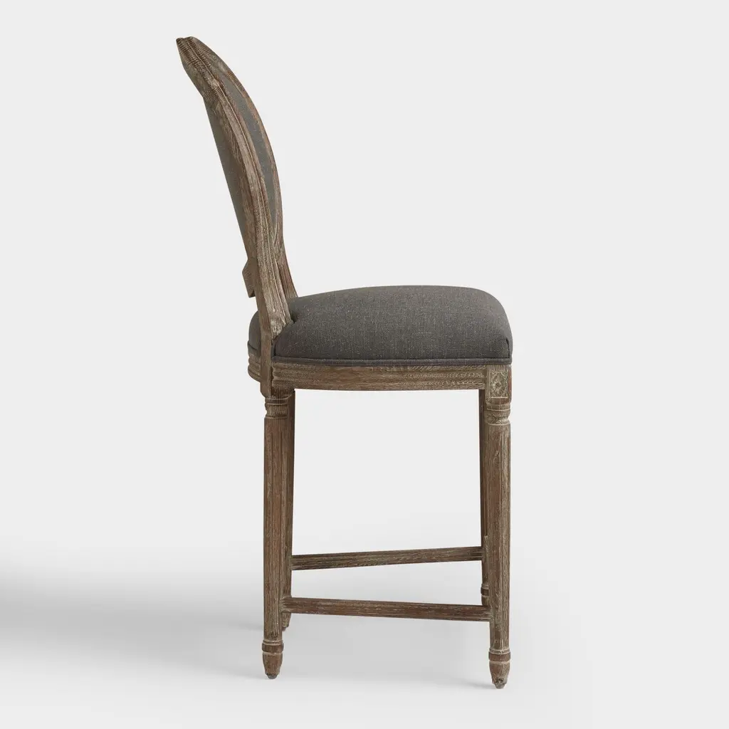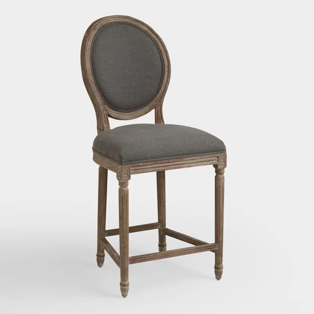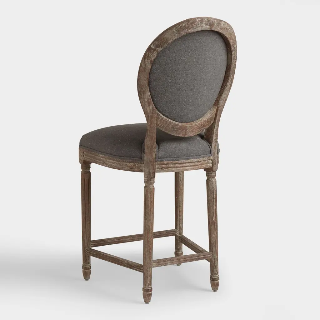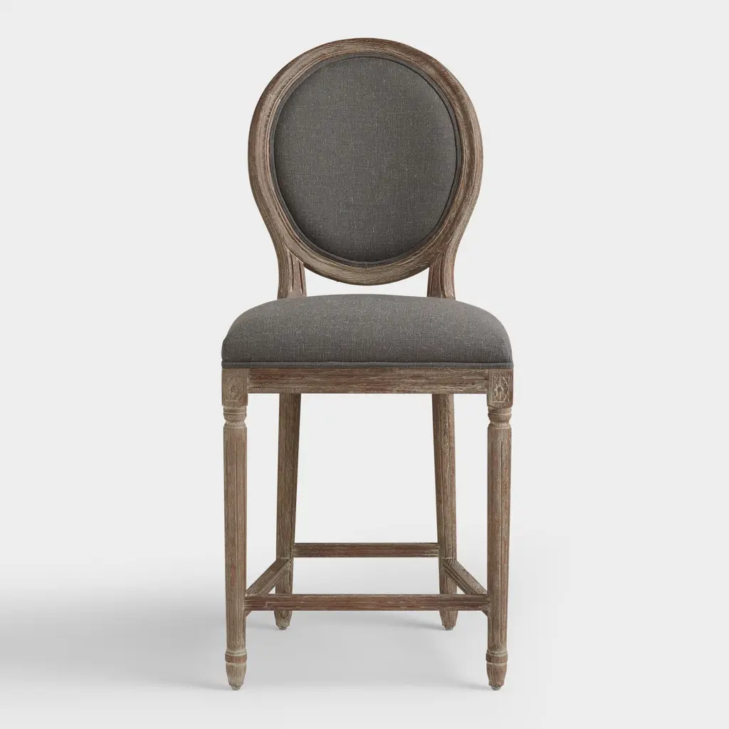 A classic with a round back silhouette, our Paige counter stool is crafted of oak with carved details and a distressed finish. The rich upholstery comes in linen or velvet and an array of colors that allows you to stylishly update your seating area or kitchen.