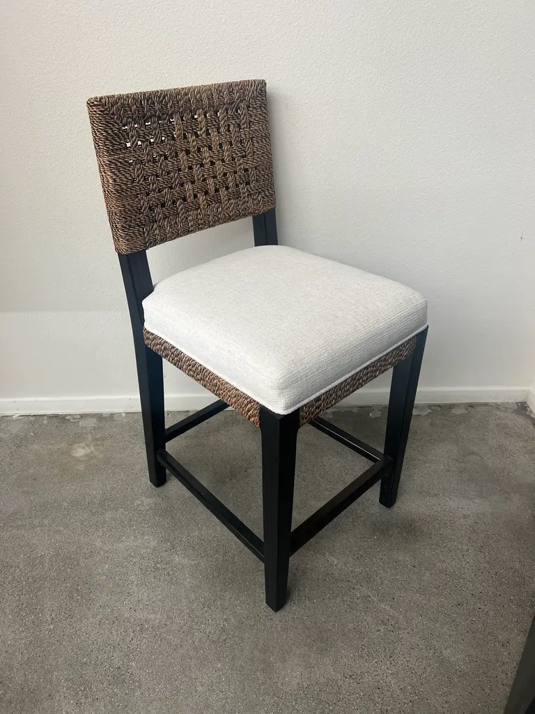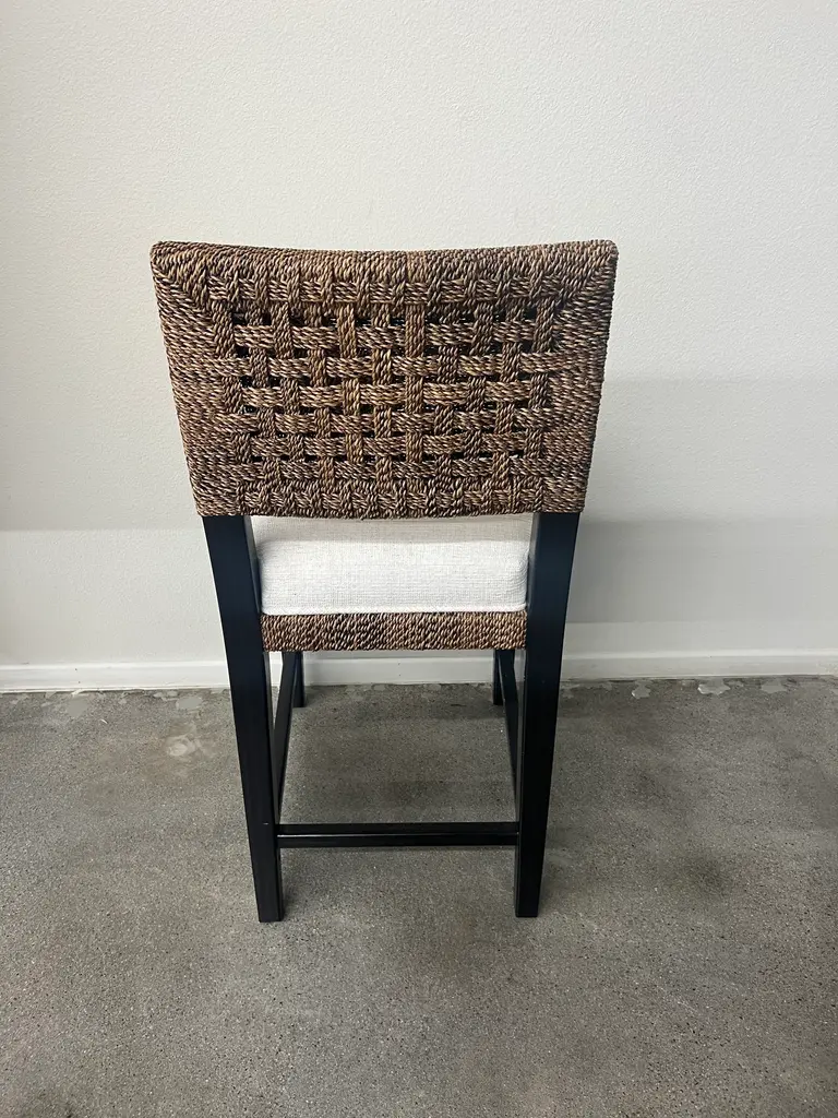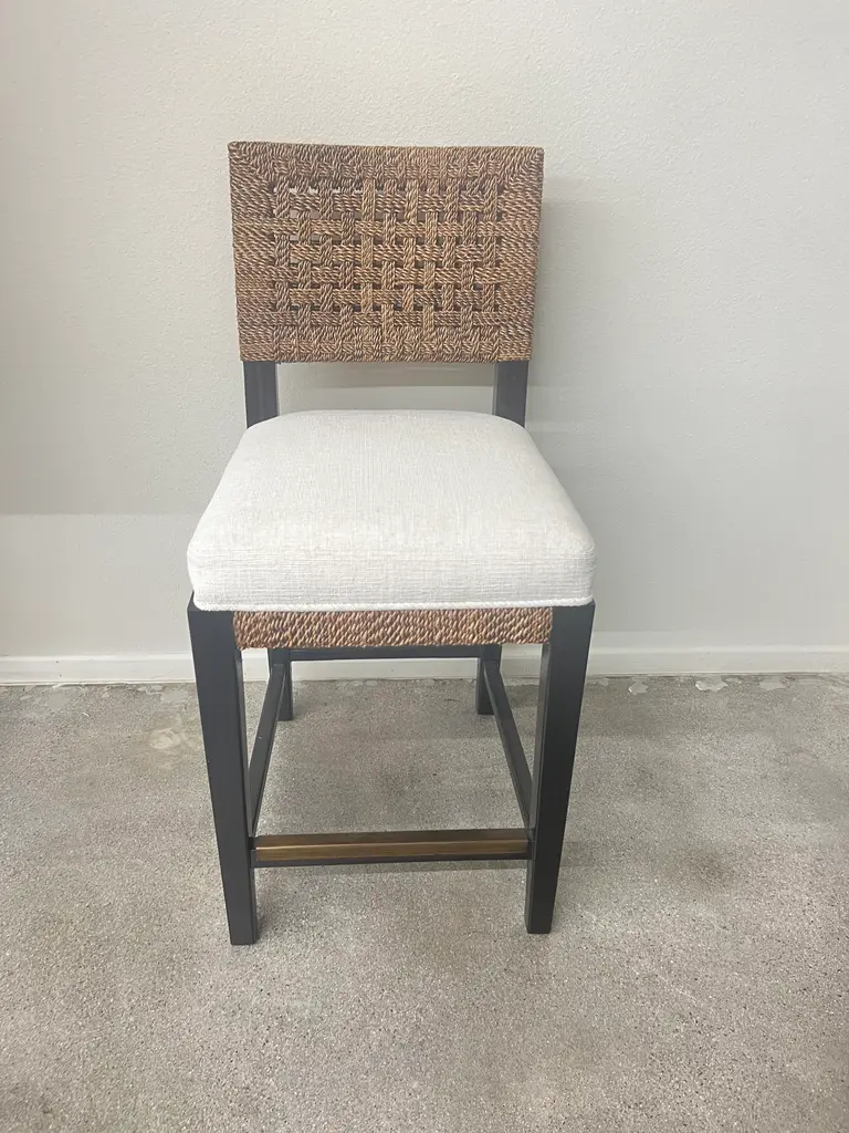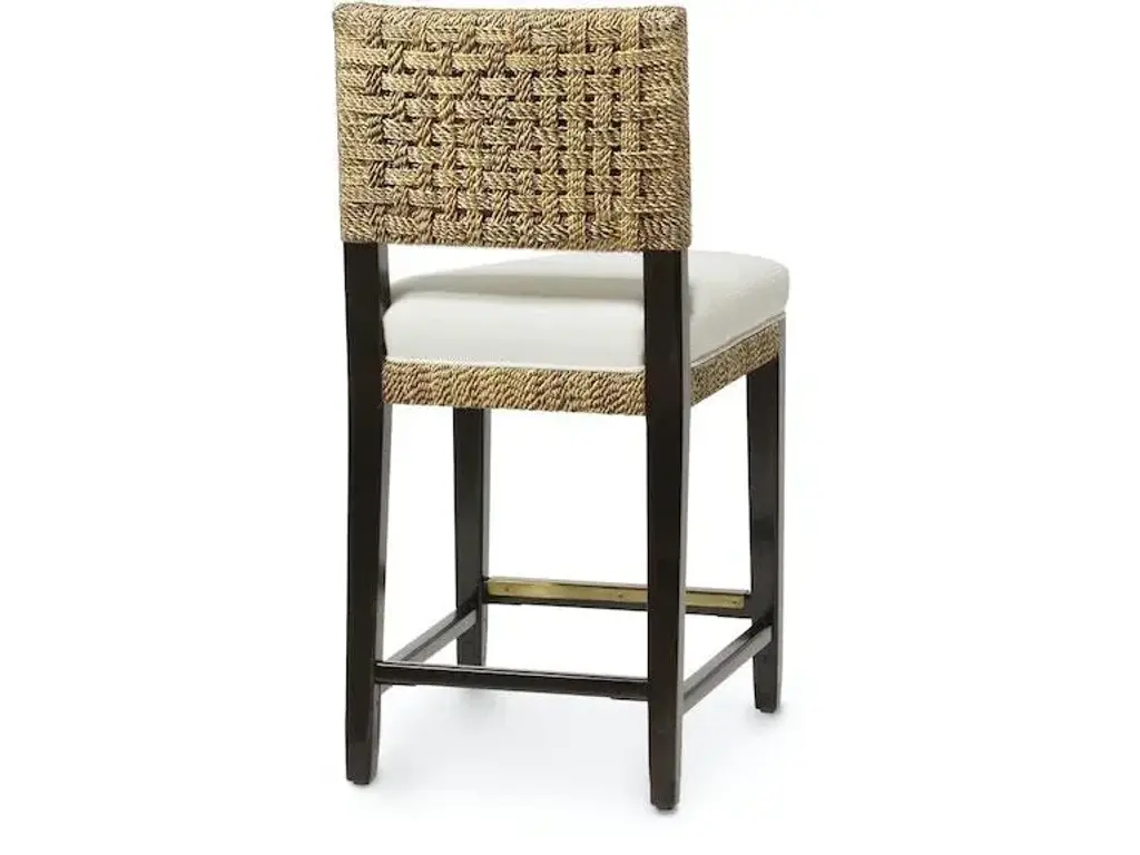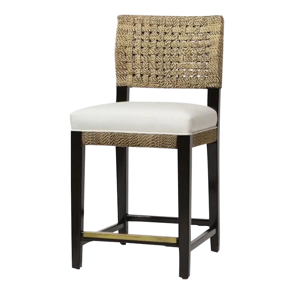 New Panamawood Counter Stool by Palecek. There are a total of two stools available, each sold separately. These are showroom samples in excellent condition. Hardwood frame and legs in dark brown finish with a double wall back and apron woven in natural seagrass. Stool comes with a fixed upholstered seat and a brass metal footrest on front stretcher.