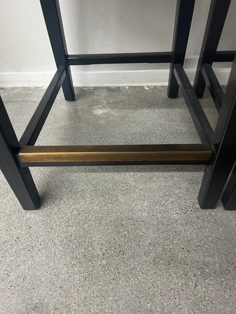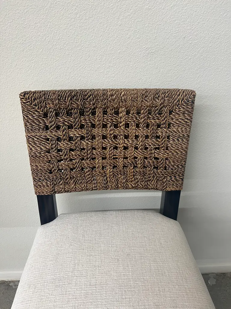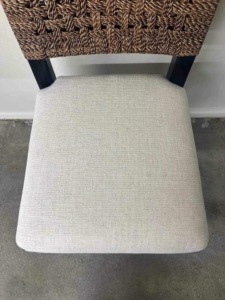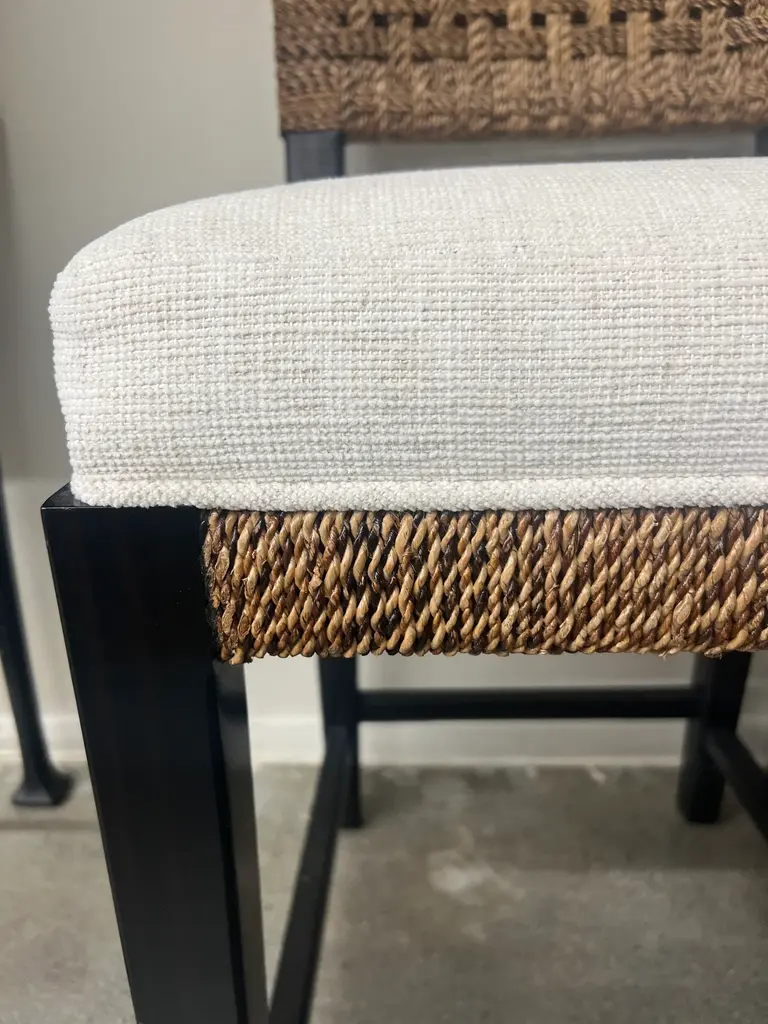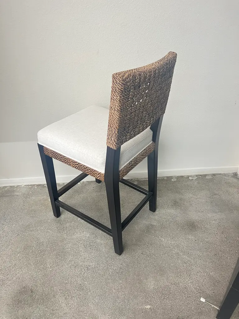 New Panamawood Counter Stool by Palecek. There are a total of two stools available, each sold separately. These are showroom samples in excellent condition. Hardwood frame and legs in dark brown finish with a double wall back and apron woven in natural seagrass. Stool comes with a fixed upholstered seat and a brass metal footrest on front stretcher.