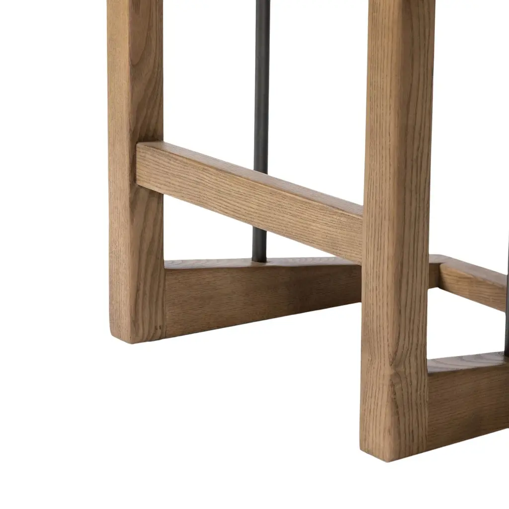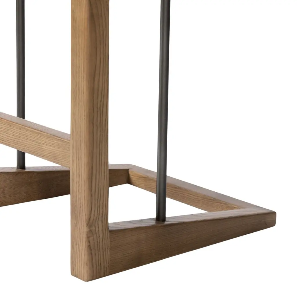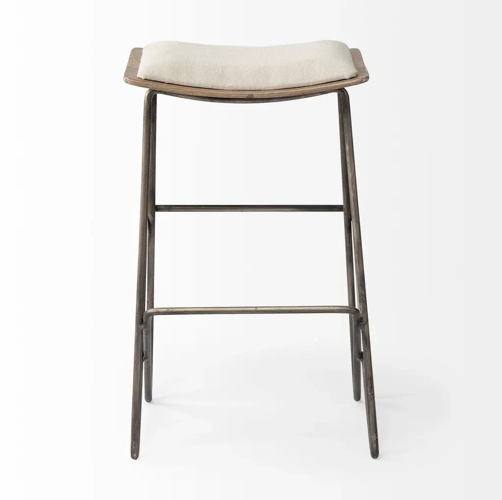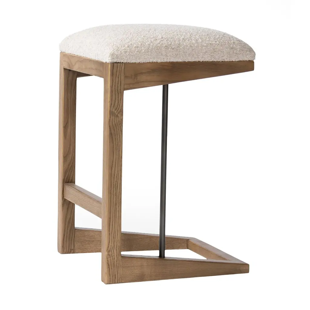 A stunner from every angle, this architecturally inspired counter stool features an angular base crafted from solid wood with two iron rods for added support and visual interest. The seat is upholstered in a linen/cotton/poly blend performance fabric with subtle texture throughout. Performance fabrics are specially created to withstand spills, stains, high traffic, and wear, ensuring long-term comfort and unmatched durability.