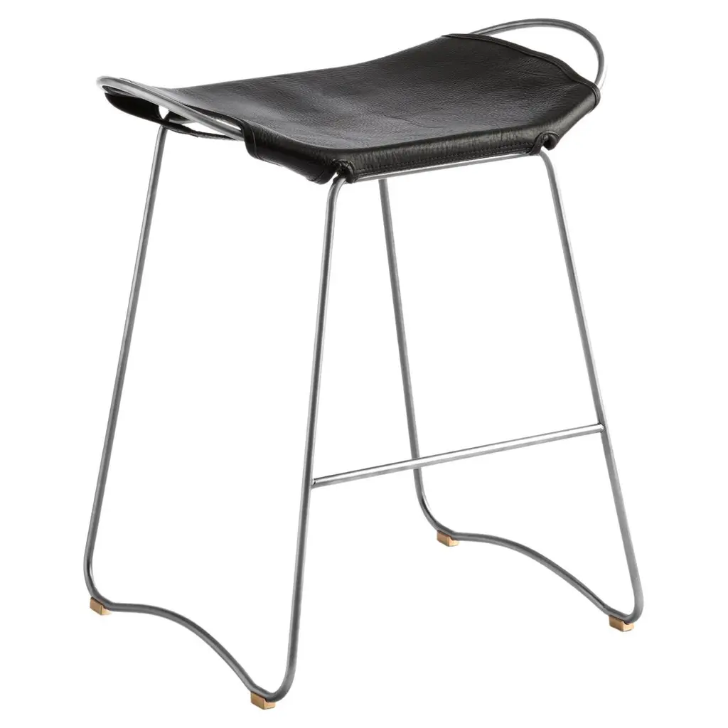 Pampa Leather Counter Stool by Cuero DesignDimensions: D 47 x W 47 x H 65 cm.Materials: Leather and metal.Finish: Ocean Blue leather and black frame.Available in different leather and metal color options and finishes. Prices may vary. Available in two different height options: 65 cm and 82 cm. Please contact us.Deep in the Swedish forests, where steel items have been crafted by proud workers for more than 1000 years. The leather is sourced from one of the finest tannery in Italy and shipped to Sweden where we select the best pieces and hand make these comfortable seats for the barstools.Cuero DesignWe make furniture that we want to have in our own homes. Everything has to be comfortable, beautiful, and very high quality. Second-generation family business. Since 1986 - My father started importing luxury leather goods from South America to Sweden. He eventually discovered the butterfly chair which is a classical design from Argentina and became obsessed. 15 years of his life were dedicated to improving its shape and quality. Agustina is from Patagonia and Nils is from Sweden.