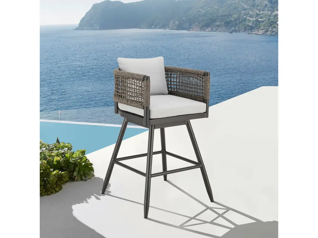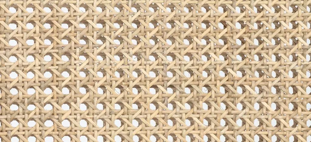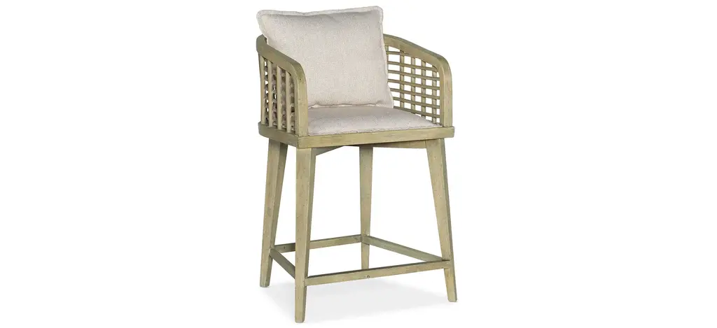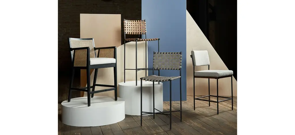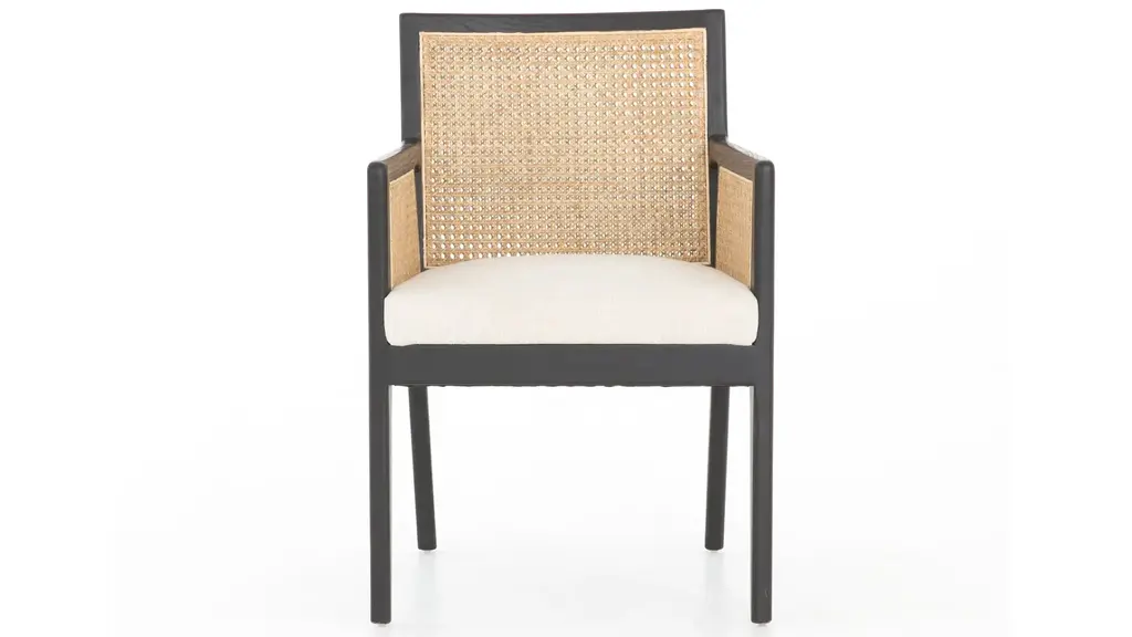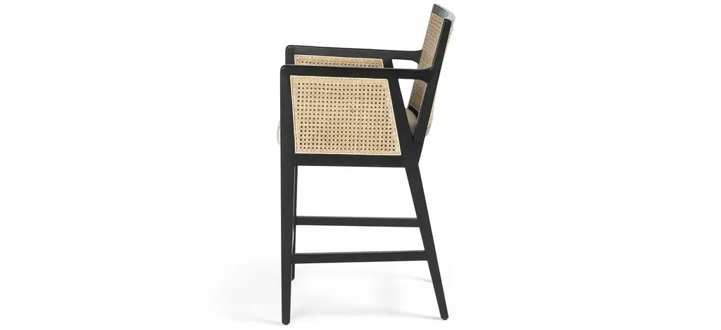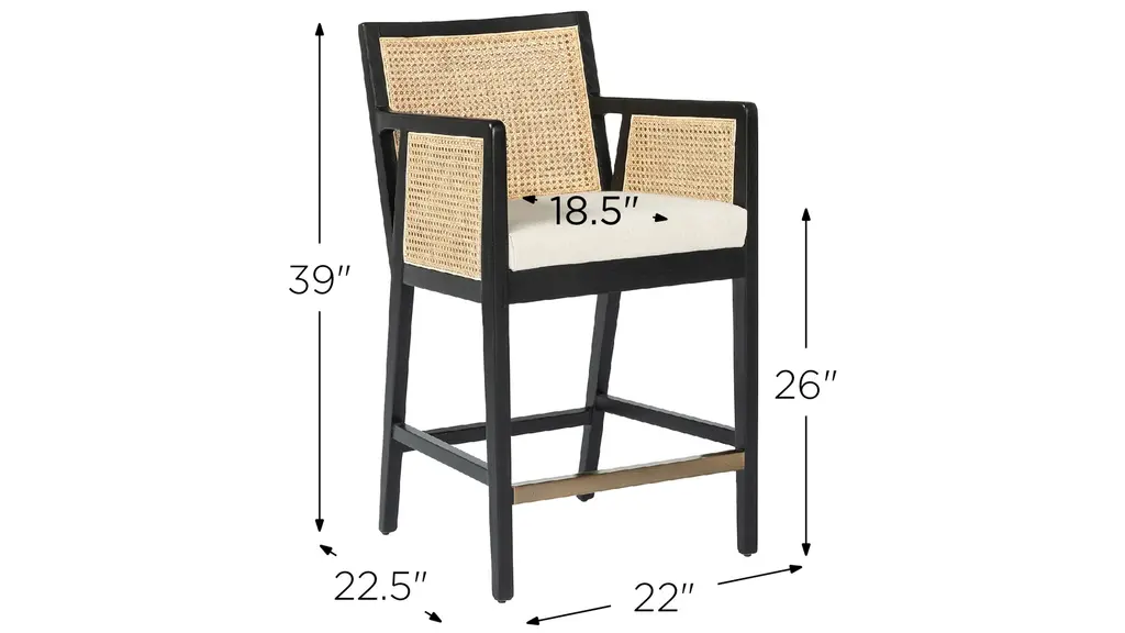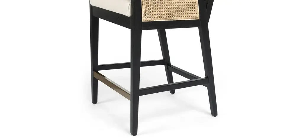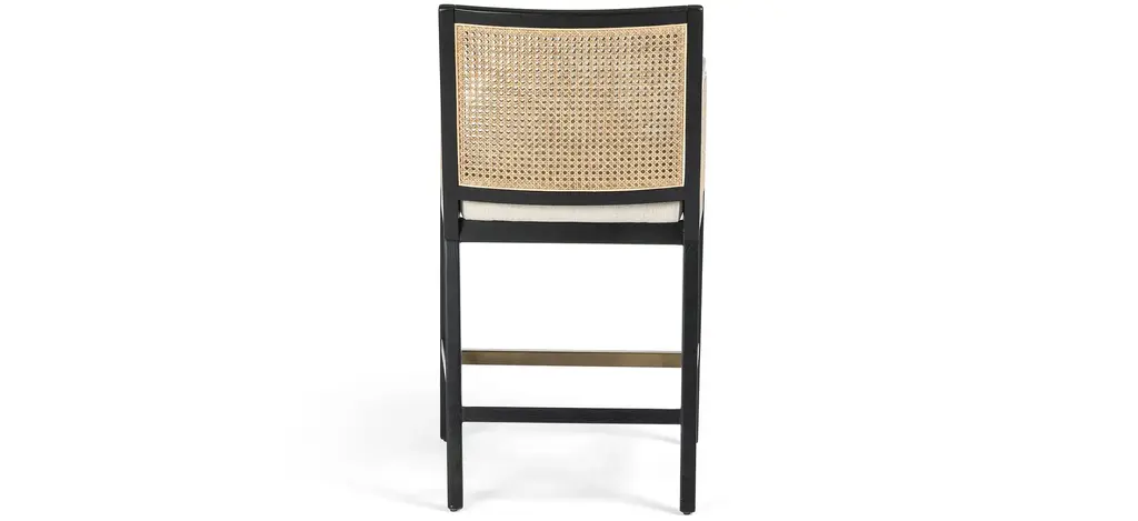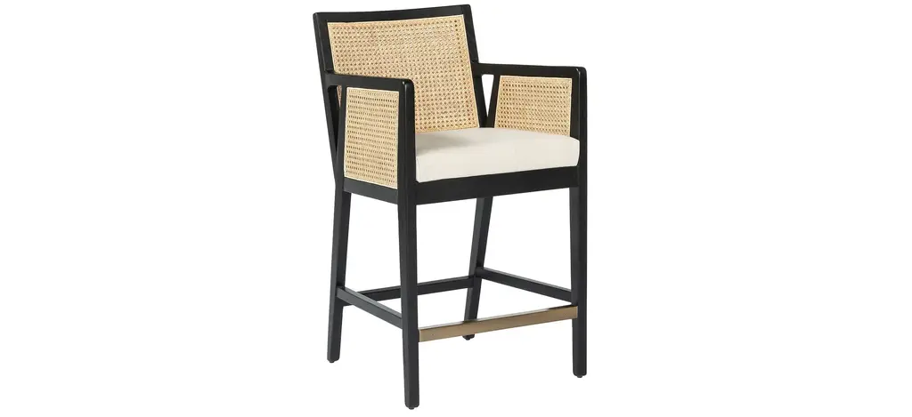 Mixed materials refresh retro dining style. Brushed ebony nettle wood frames a textural inlay of natural cane, for perfect contrast. Neutral linen-blend seating of high-performance fabric brings modern sensibility to stool-style counter seating.