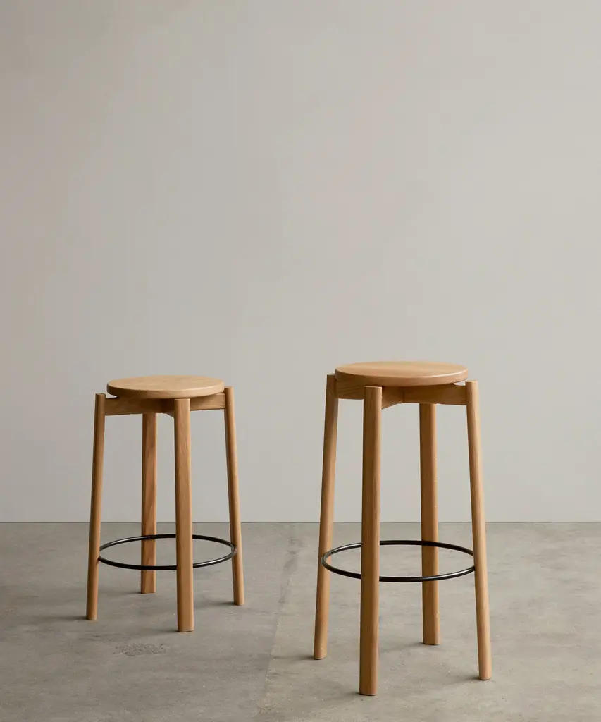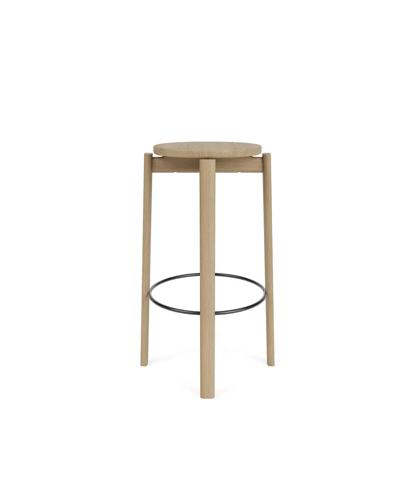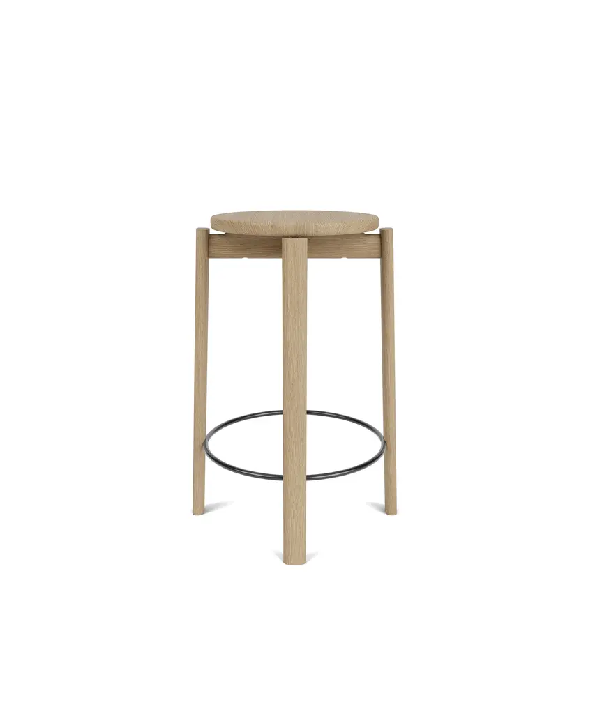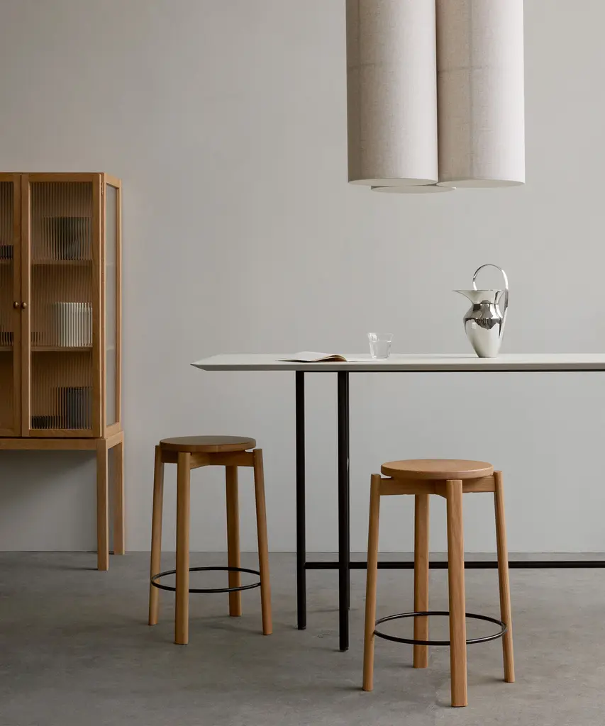 The Passage Collection takes its cues from Danish cabinetmaking traditions, devoted to woodworking skills using age-old techniques. Made in solid oak, the Passage Counter Stool is given a modern edge thanks to its clever flat-pack construction – reducing its footprint and allowing its owner to actively engage in the crafting process. Offered in a natural or dark lacquered finish, the warm expression and organic silhouette of the stool invite touch. A carefully placed foot ring ensures a comfortable sitting position for prolonged periods and its bar height aligns perfectly with countertops, making the versatile design the ideal blend of function and comfort. Designed by Kroyer-Saetter-Lassen for Danish design company Audo Copenhagen.
