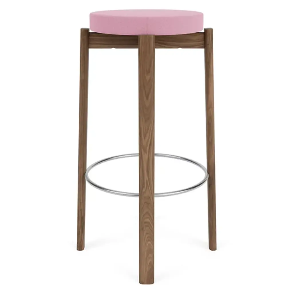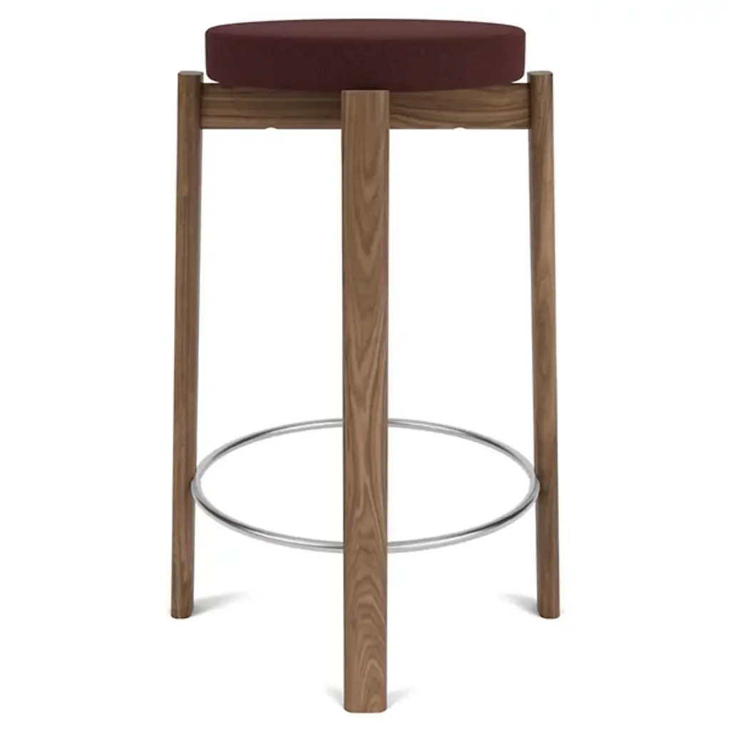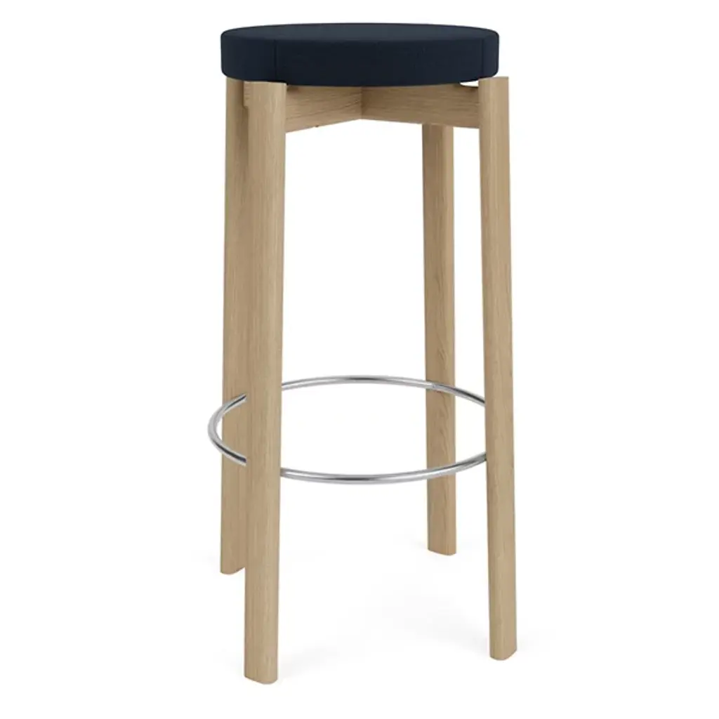 The Passage Bar / Counter Stool, Upholstered Seat from Audo Copenhagen adds a refined salute to age-old Danish cabinetry techniques. Designed by Kroeyer-Saetter-Lassen and fashioned from solid and high-quality hardwood with its smooth finish lacquered for display, it contrasts a soft cushion with a plush cloth surface with the open wooden structure below. The airy contrast between the open construction and solid, though slender construction elements create a striking and unique character that salutes simple Scandinavian appeal and puts its versatile design on full display.