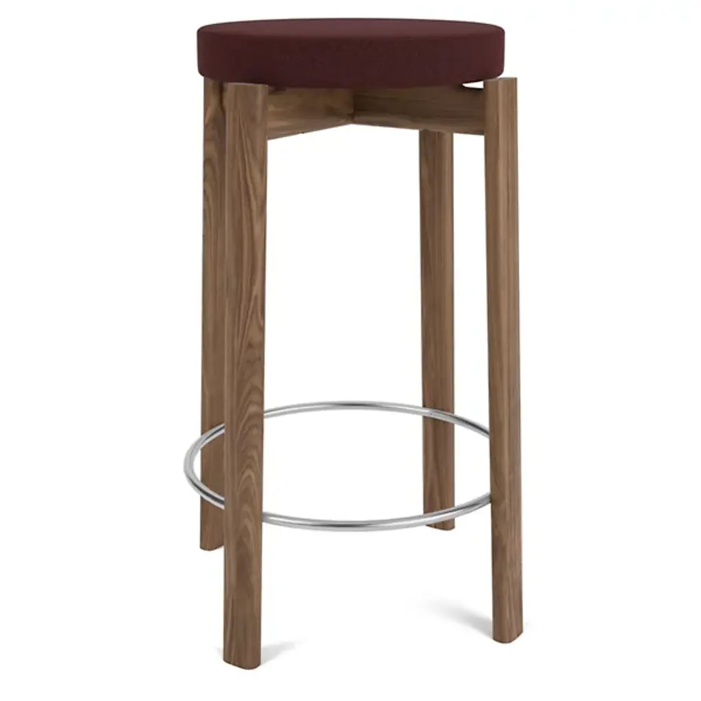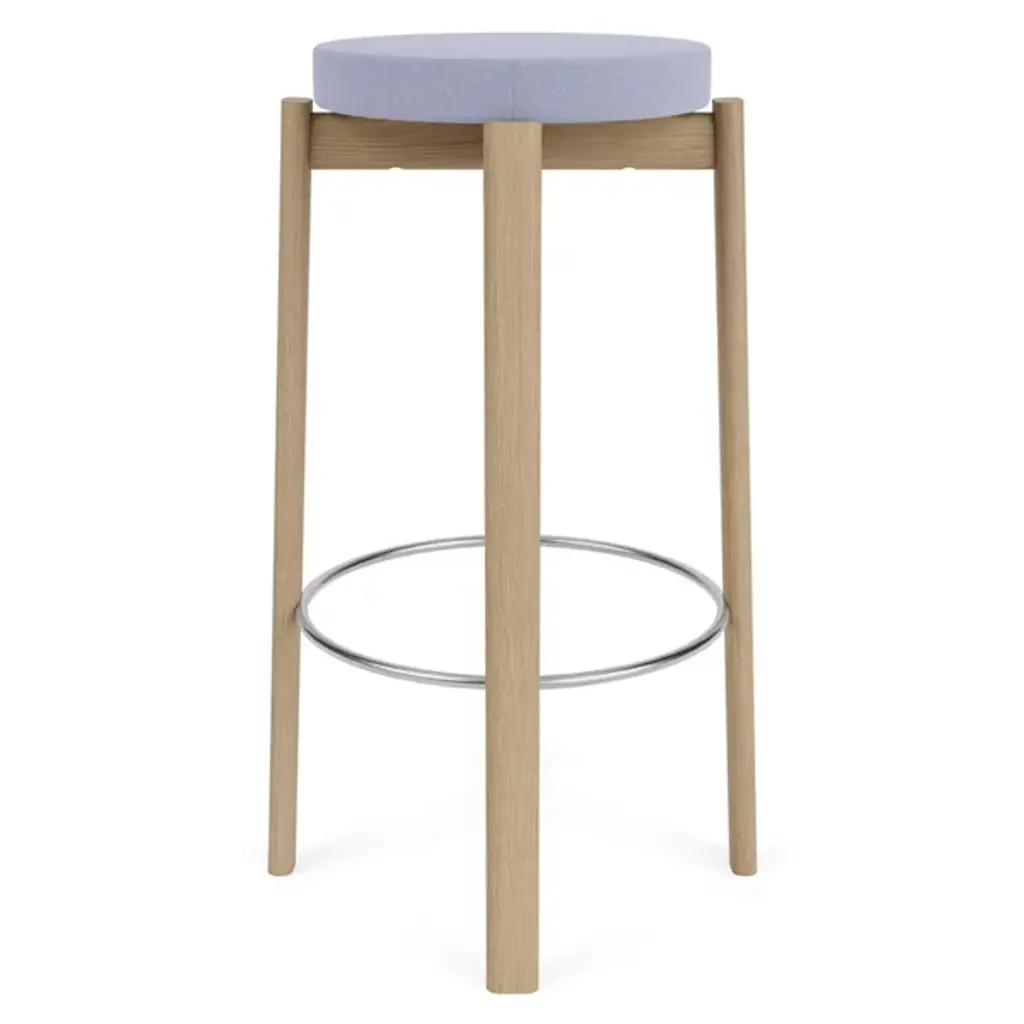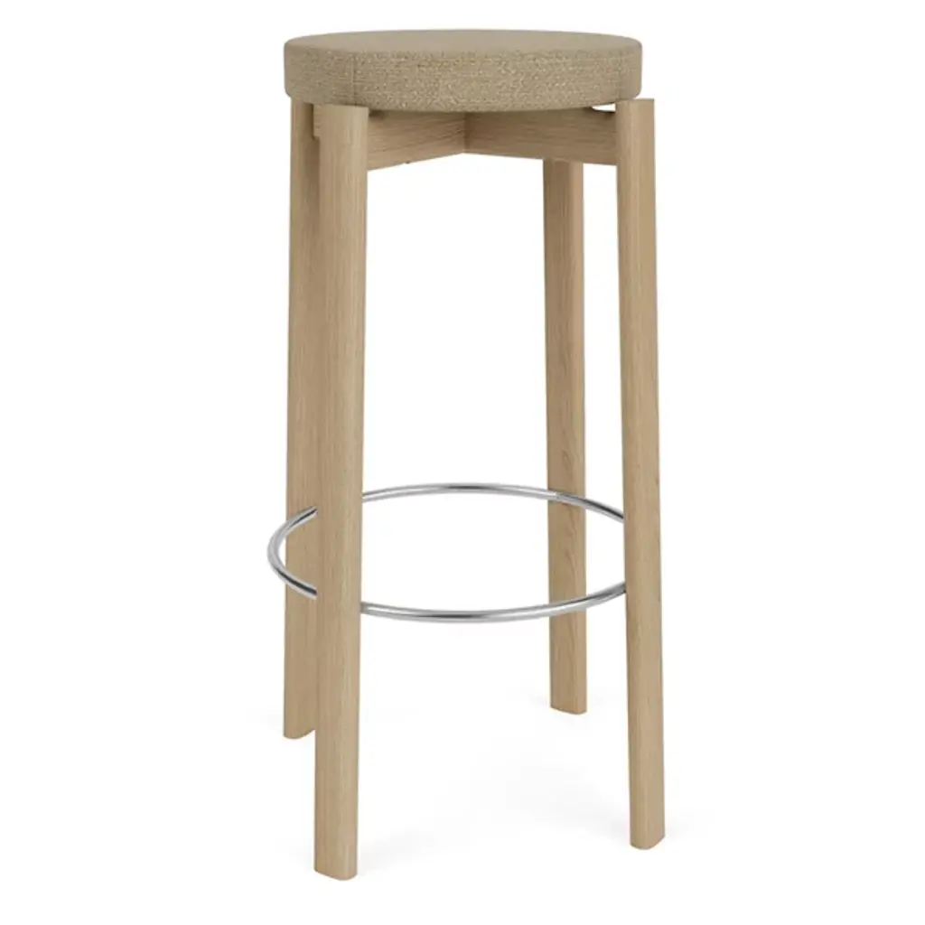 The Passage Bar / Counter Stool, Upholstered Seat from Audo Copenhagen adds a refined salute to age-old Danish cabinetry techniques. Designed by Kroeyer-Saetter-Lassen and fashioned from solid and high-quality hardwood with its smooth finish lacquered for display, it contrasts a soft cushion with a plush cloth surface with the open wooden structure below. The airy contrast between the open construction and solid, though slender construction elements create a striking and unique character that salutes simple Scandinavian appeal and puts its versatile design on full display.