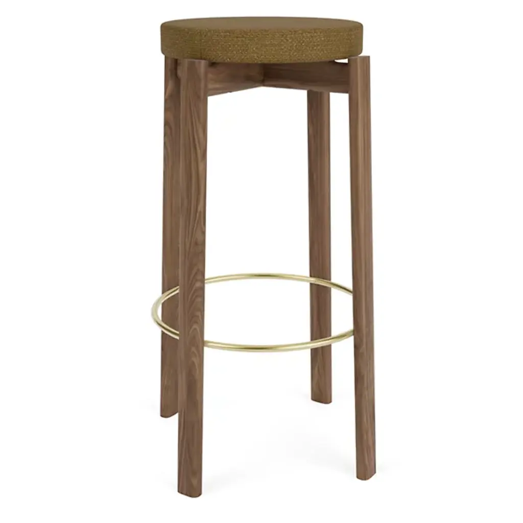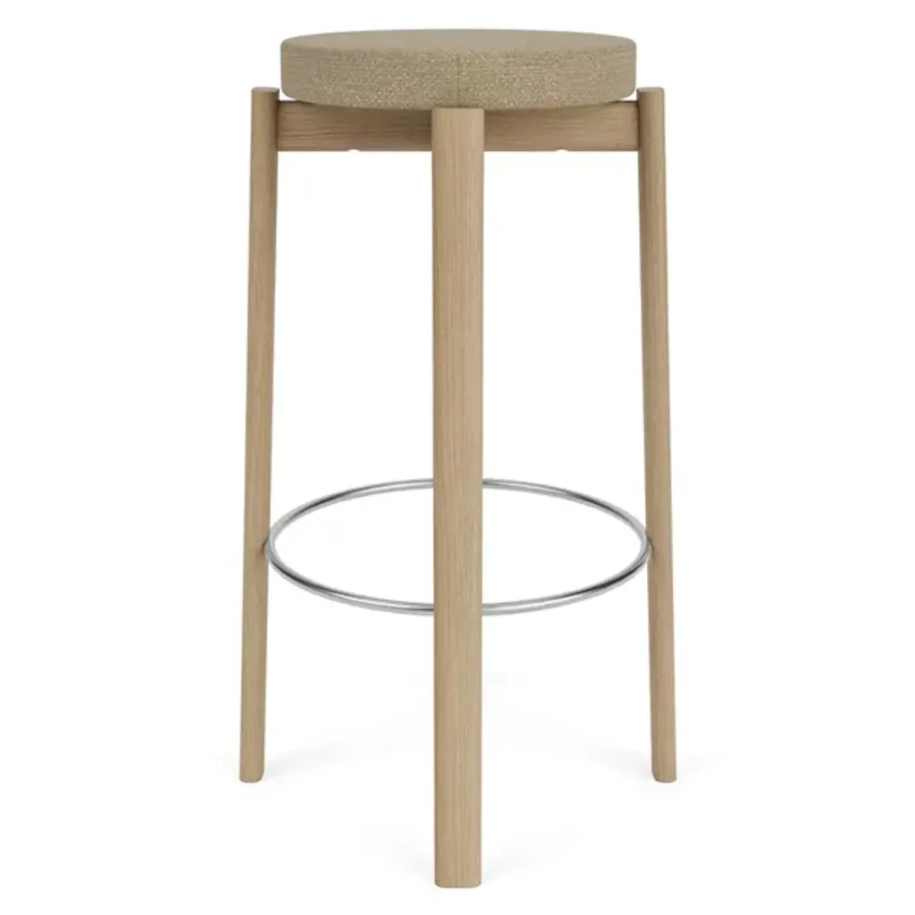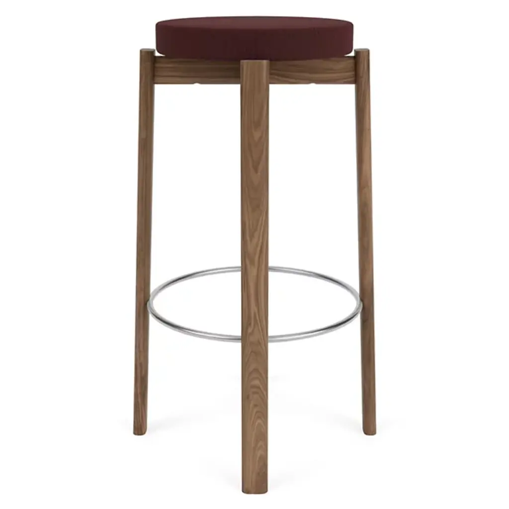 The Passage Bar / Counter Stool, Upholstered Seat from Audo Copenhagen adds a refined salute to age-old Danish cabinetry techniques. Designed by Kroeyer-Saetter-Lassen and fashioned from solid and high-quality hardwood with its smooth finish lacquered for display, it contrasts a soft cushion with a plush cloth surface with the open wooden structure below. The airy contrast between the open construction and solid, though slender construction elements create a striking and unique character that salutes simple Scandinavian appeal and puts its versatile design on full display.