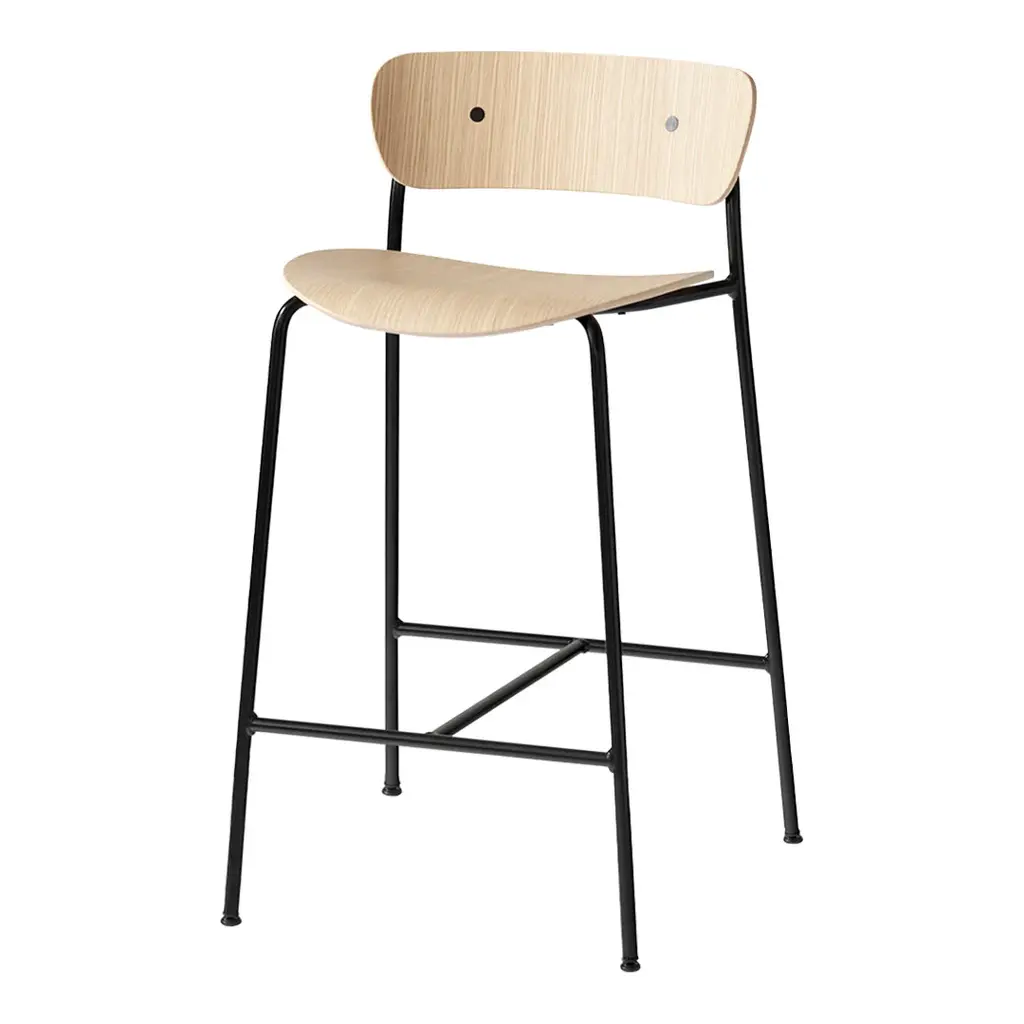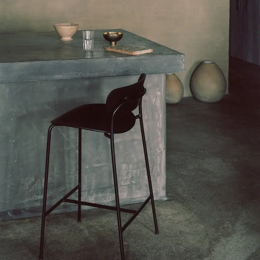 The Pavilion bar & counter stool has an airy feeling, with fluid curves for the wood veneer seat and back which continue as lyrical lines in the steel tubes of the legs. The result is a silhouette that's barely there. Ideal for furnishing an expansive bar or a kitchen counter without appearing crowded, they can easily fill a space without the space appearing full. "Tube chairs had their start in early modernism, but they were usually constructed at fixed angles," notes Anderssen & Voll. "We wanted to explore a more open construction, a freer form of expression." Brass fittings are available upon request.