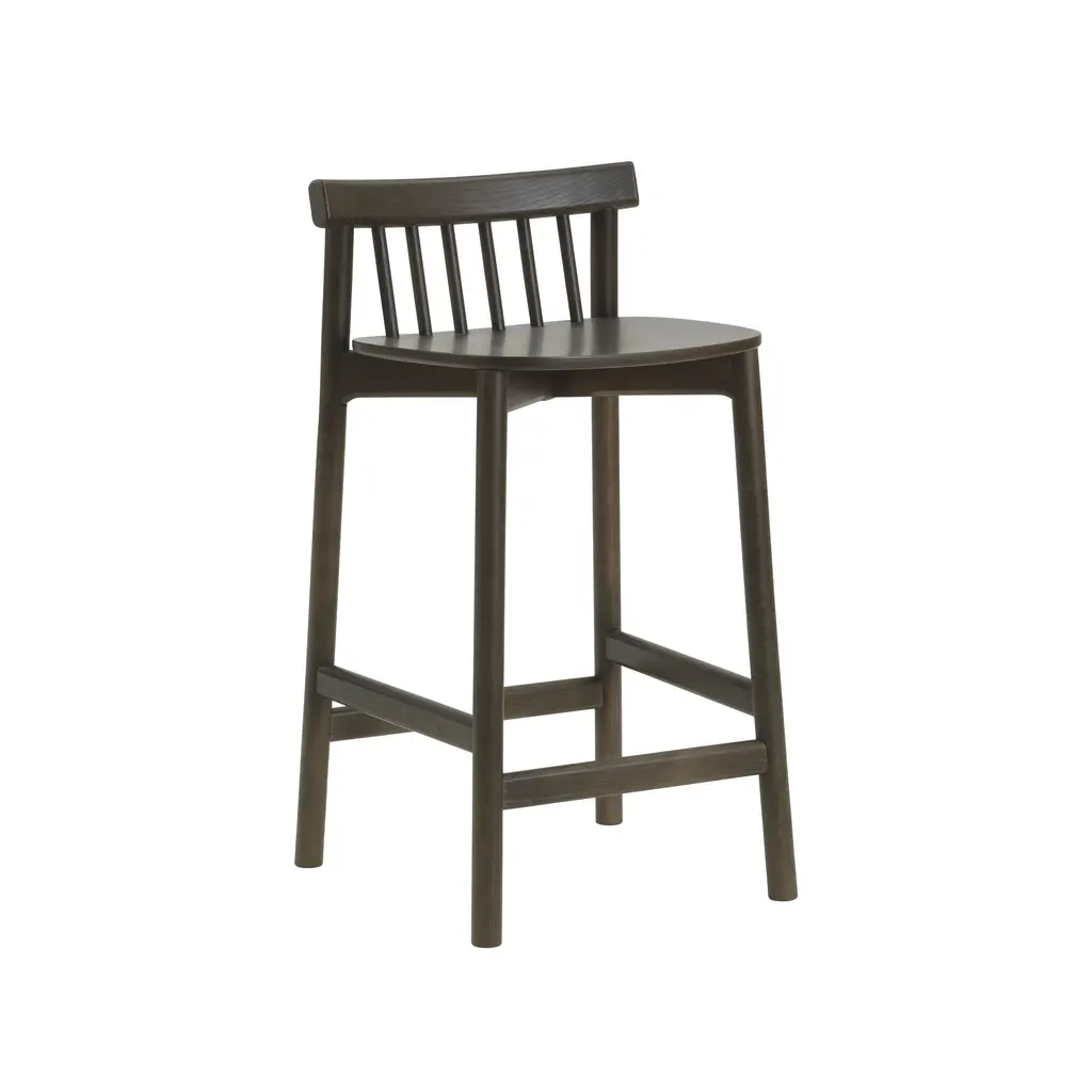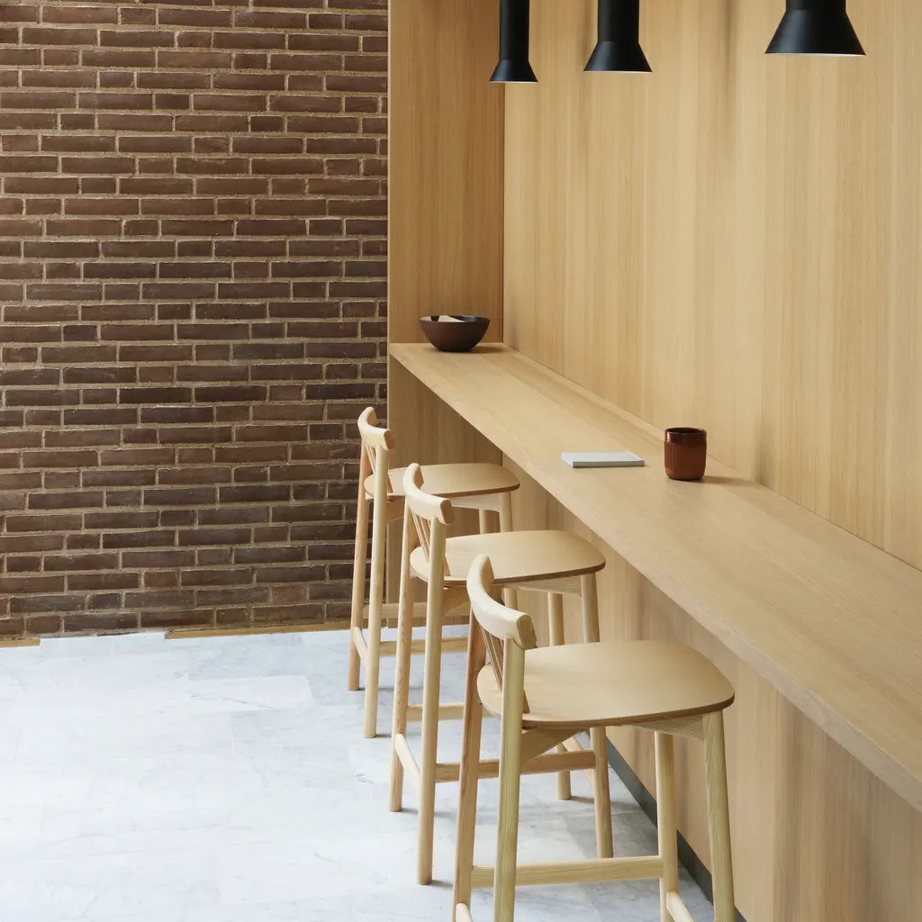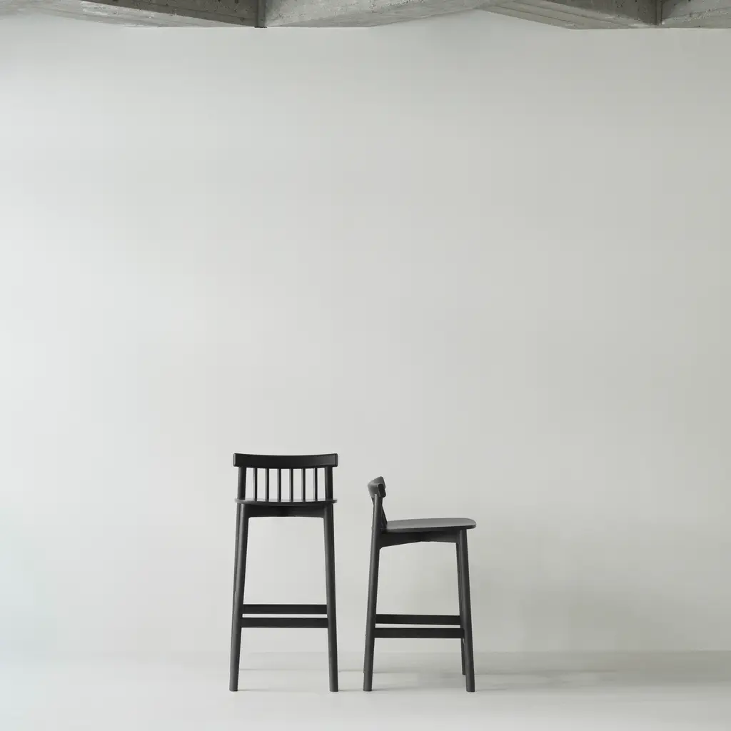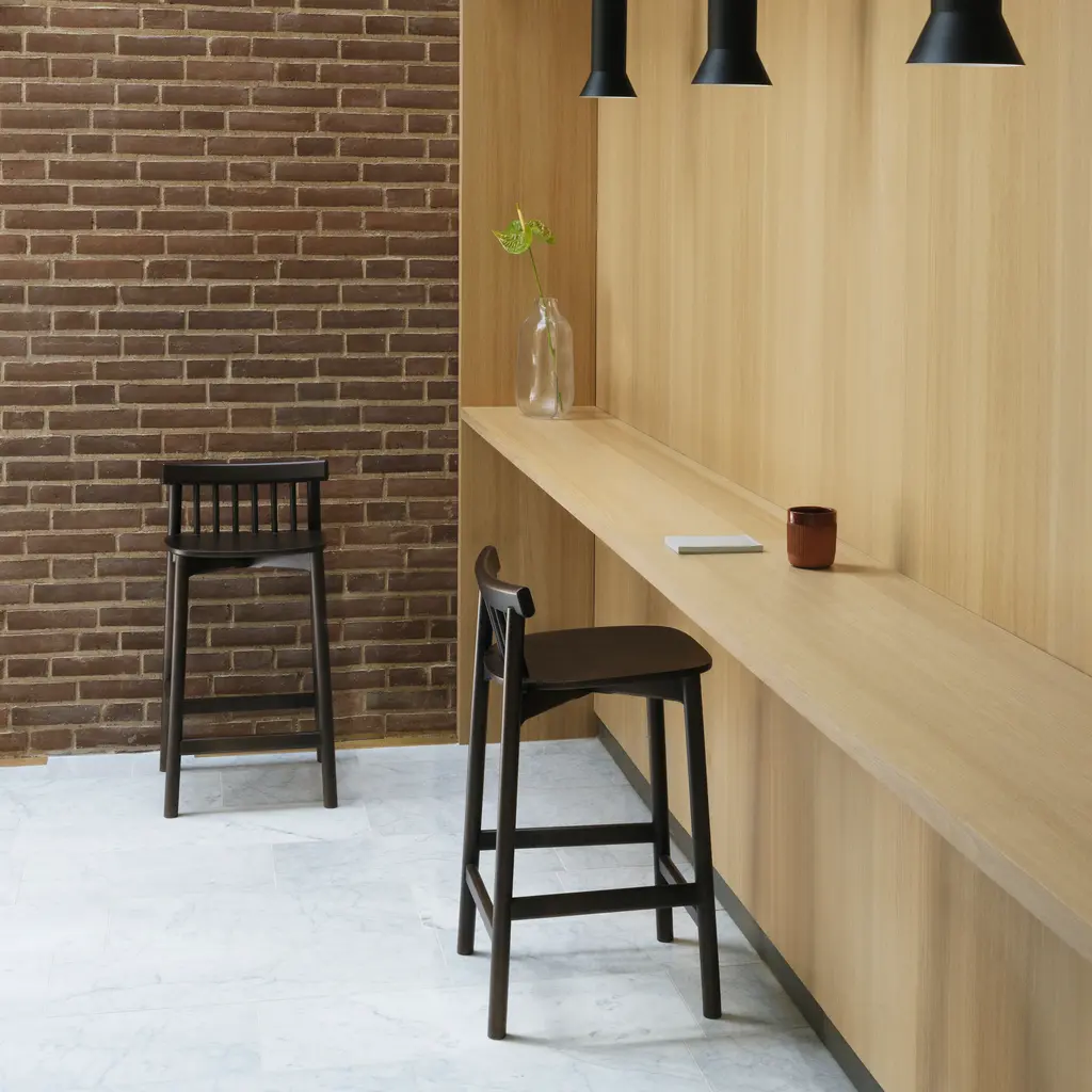 An updated take on the classic Shaker chair style, named for the Danish word for wooden “stick,” Normann Copenhagen’s Pind collection adds a companion low-back stool in bar and counter heights. Crafted in solid ash with a veneer seat, Simon Legald’s design comes in various finishes and features comfortably roomy proportions and an integrated footrest.