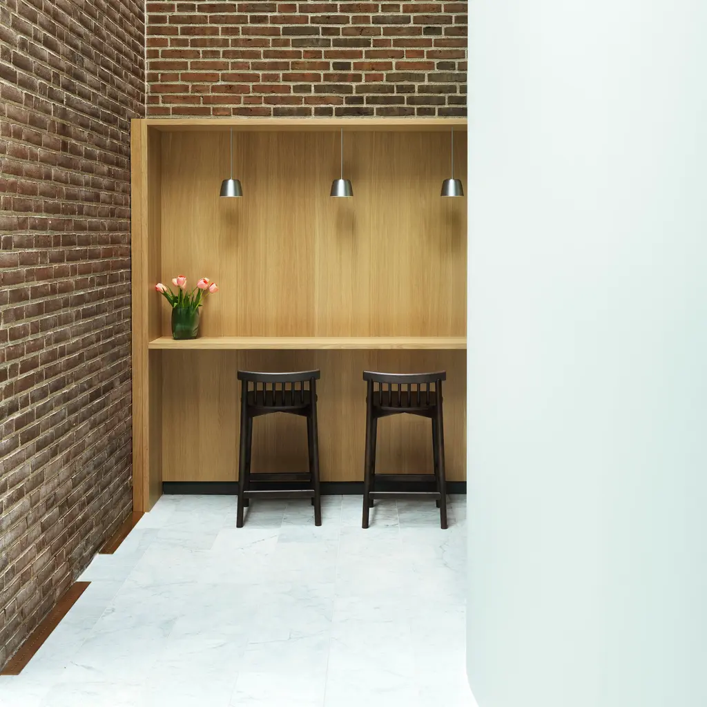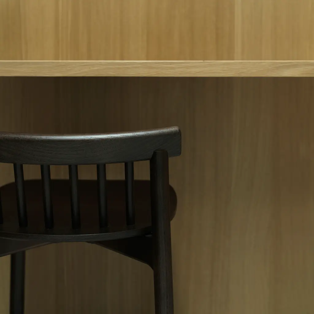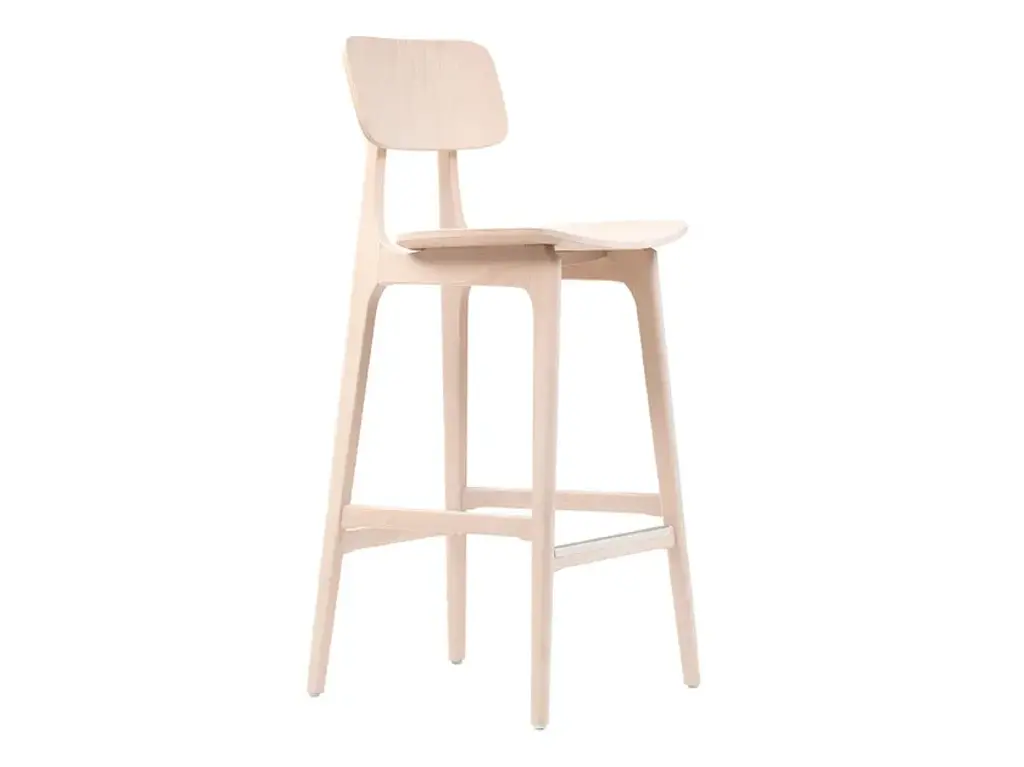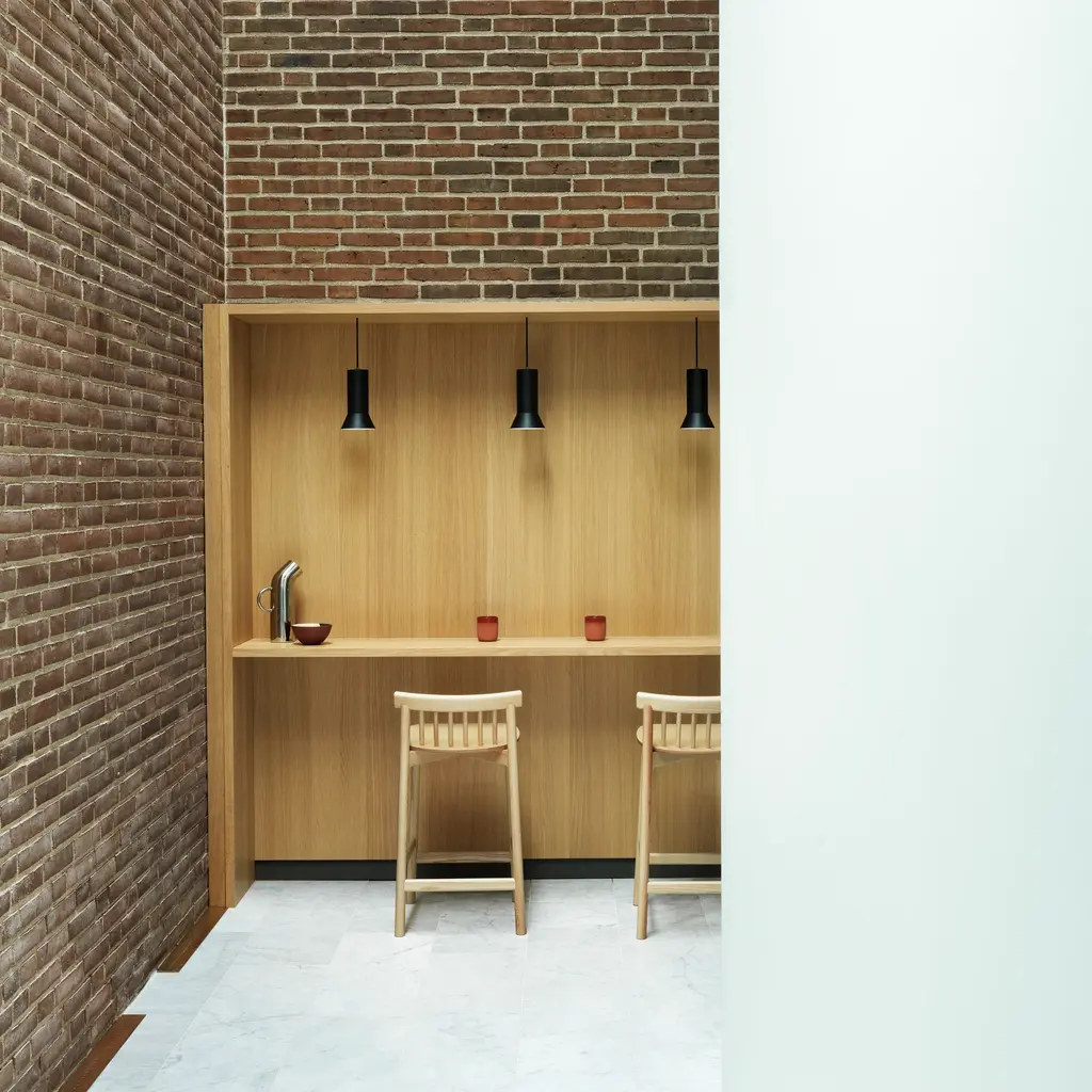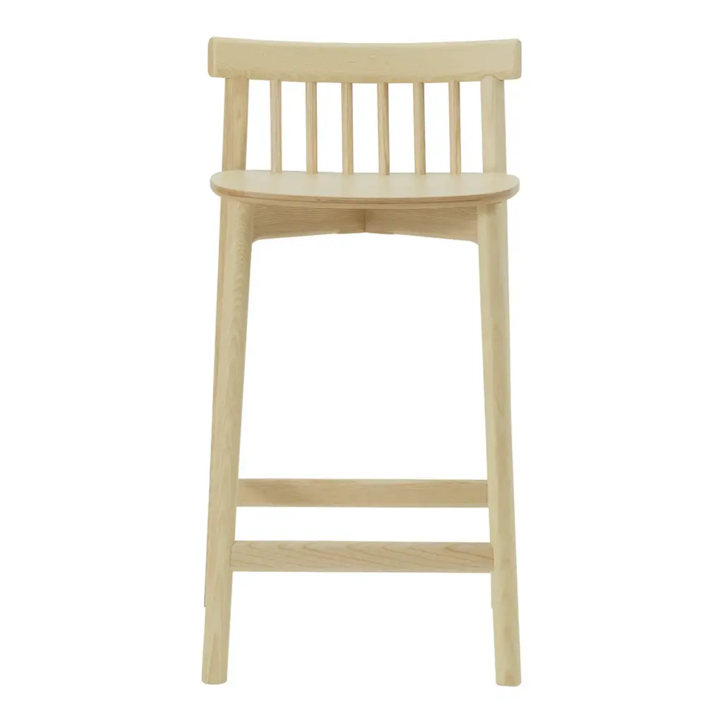 An updated take on the classic Shaker chair style, named for the Danish word for wooden “stick,” Normann Copenhagen’s Pind collection adds a companion low-back stool in bar and counter heights. Crafted in solid ash with a veneer seat, Simon Legald’s design comes in various finishes and features comfortably roomy proportions and an integrated footrest.