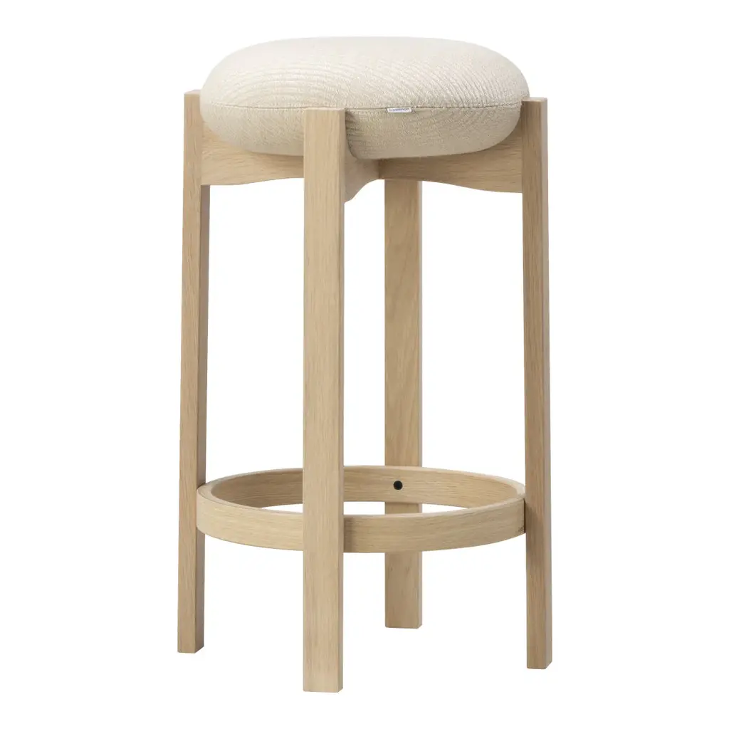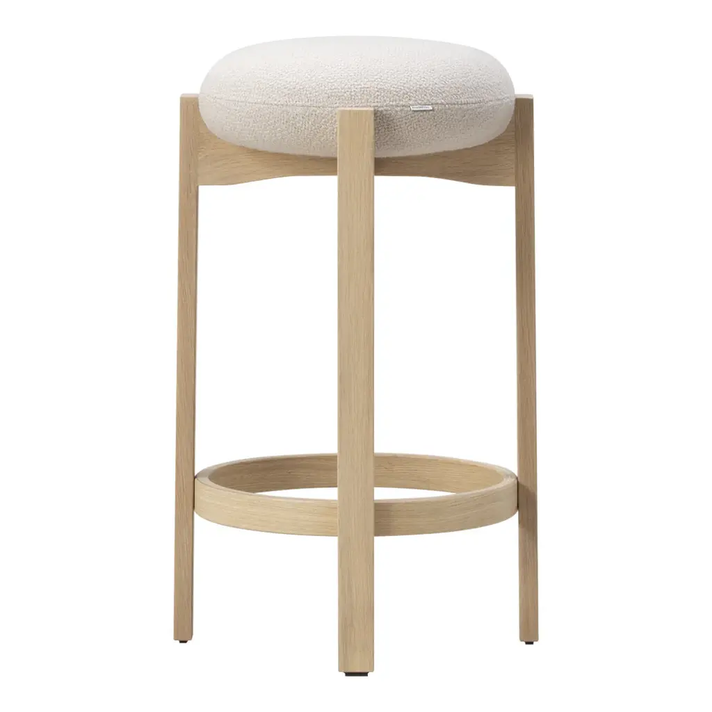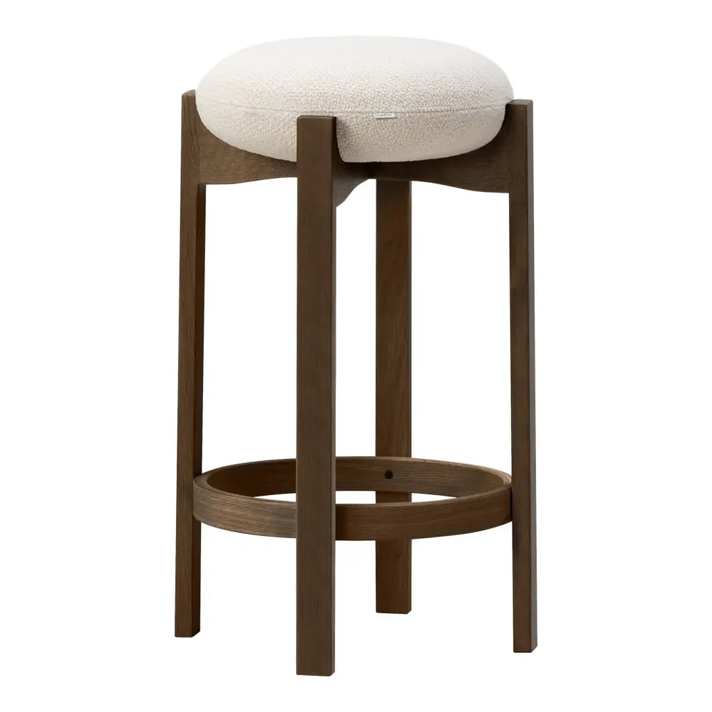 The sculptural Pioneer stools combine good seating comfort, functionality and a sculptural design language that elegantly combines the seat's soft and round design with the wooden frame's sensuality. The chair's simple, unique and distinctive combination of shapes and materials is a modern take on Scandinavian design that combines functionality with Bruun's recognisable sculptural minimalism. The four vertical legs of the wooden frame are united in a cross composition with elegant indentations, where the light, the upholstered seat cushion, is placed on top. In contrast, the detailed indentation on the underside completes the overall artistic impression.