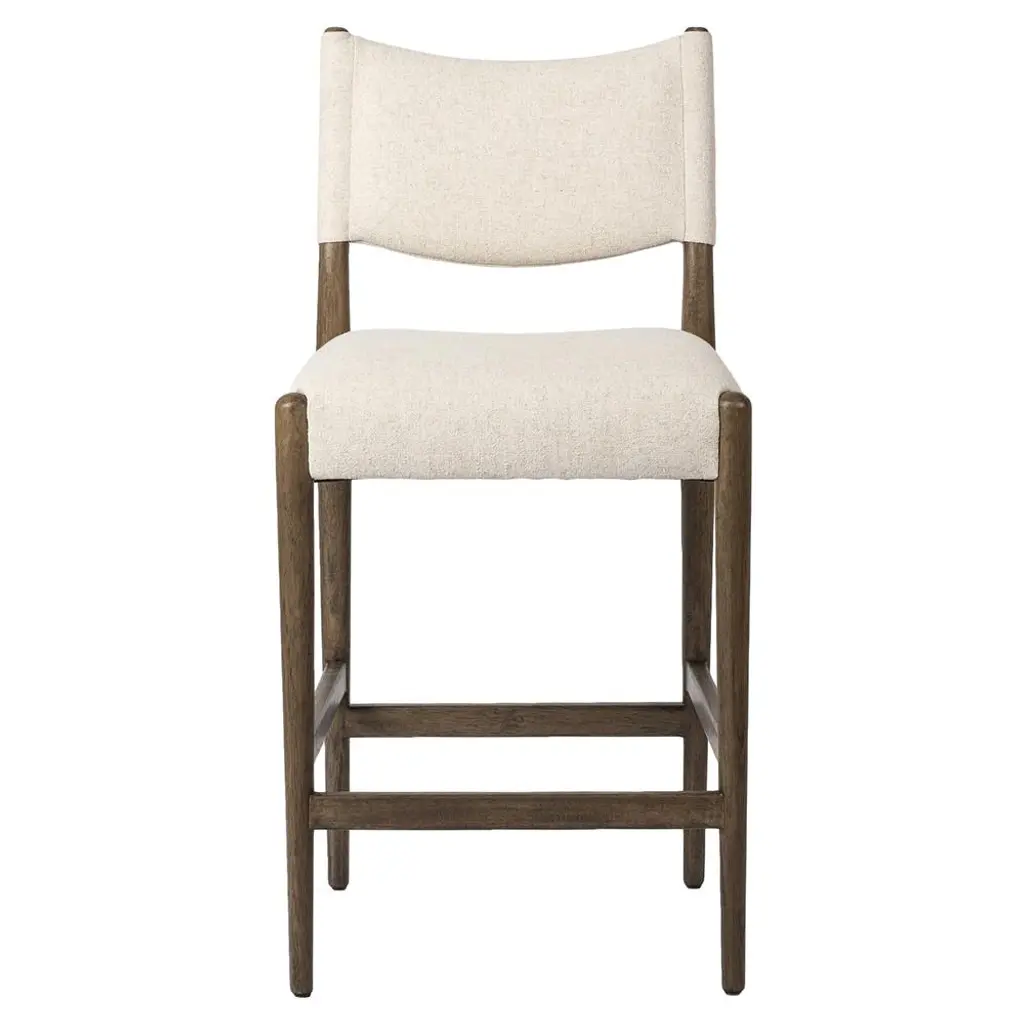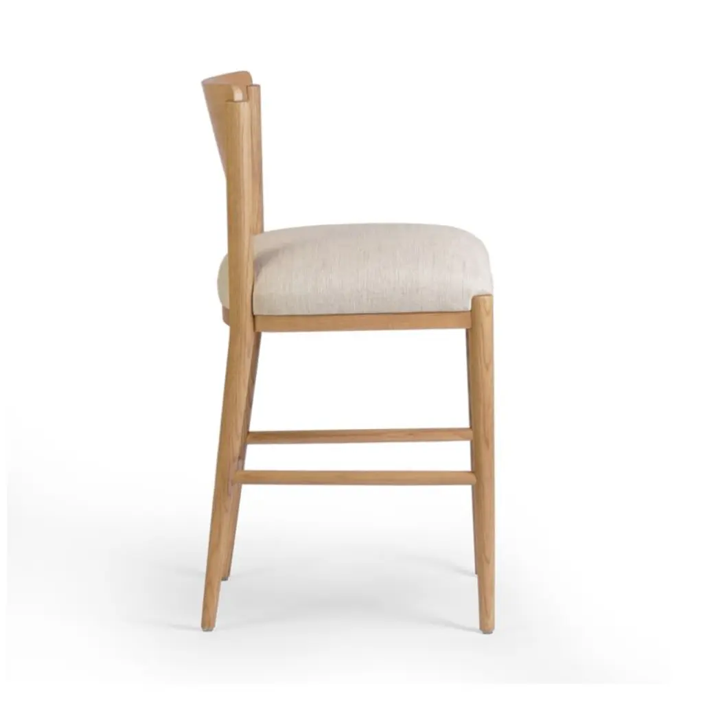 Piran pulls up to a counter or high dining table with a comfortable seat and the beauty of natural wood. Reverse-tapered legs and a natural finish give the solid wood stool its modern attitude. A curved backrest lends support, while the amply padded seat ensures a comfy stay. Neutral upholstery in a linen-cotton blend complements the frame's natural finish.