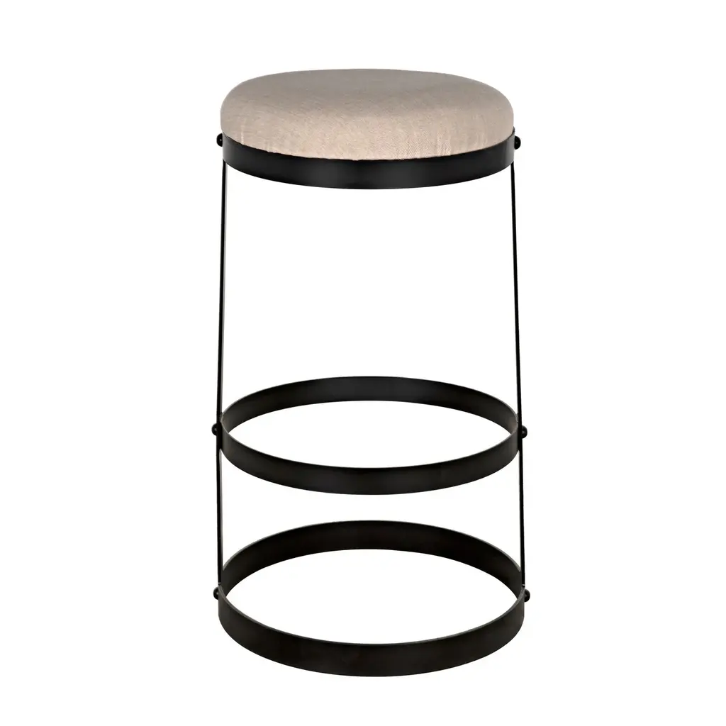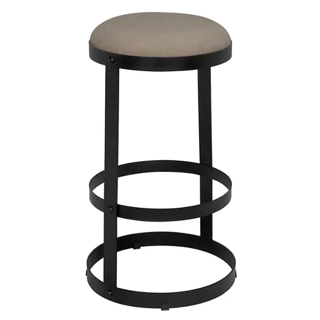 Thick circular bands of metal form this stool's footrest and support its black leather seat. Royally finished in gold with steam-punk inspired rivet details on the leg, this is a chair suitable for any modern monarch.