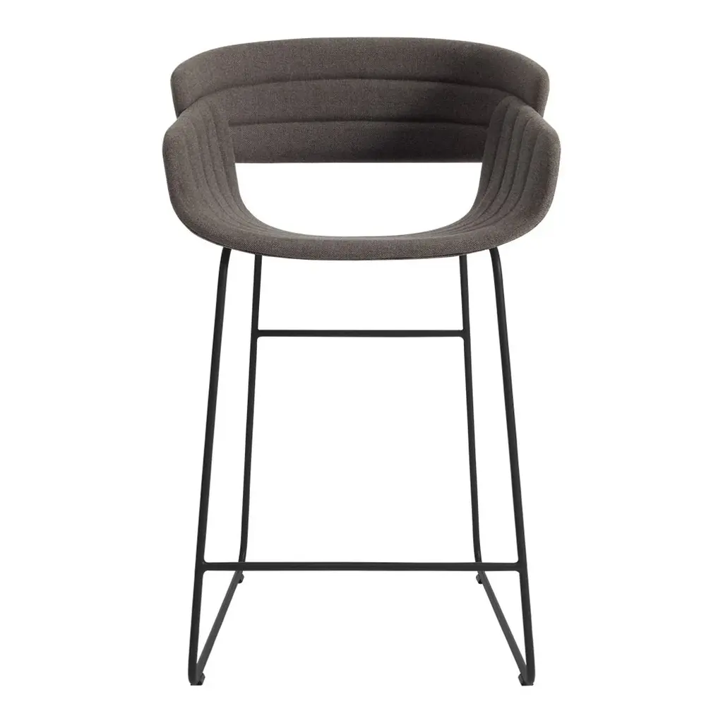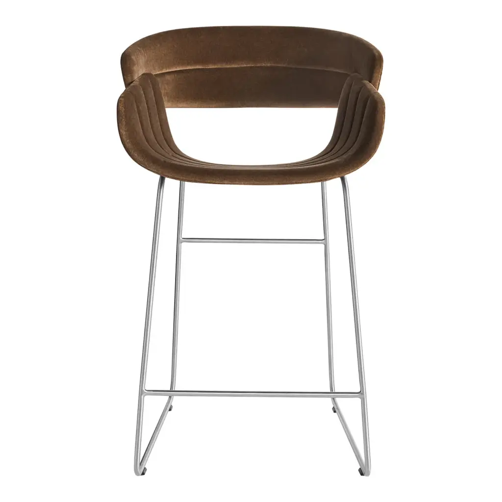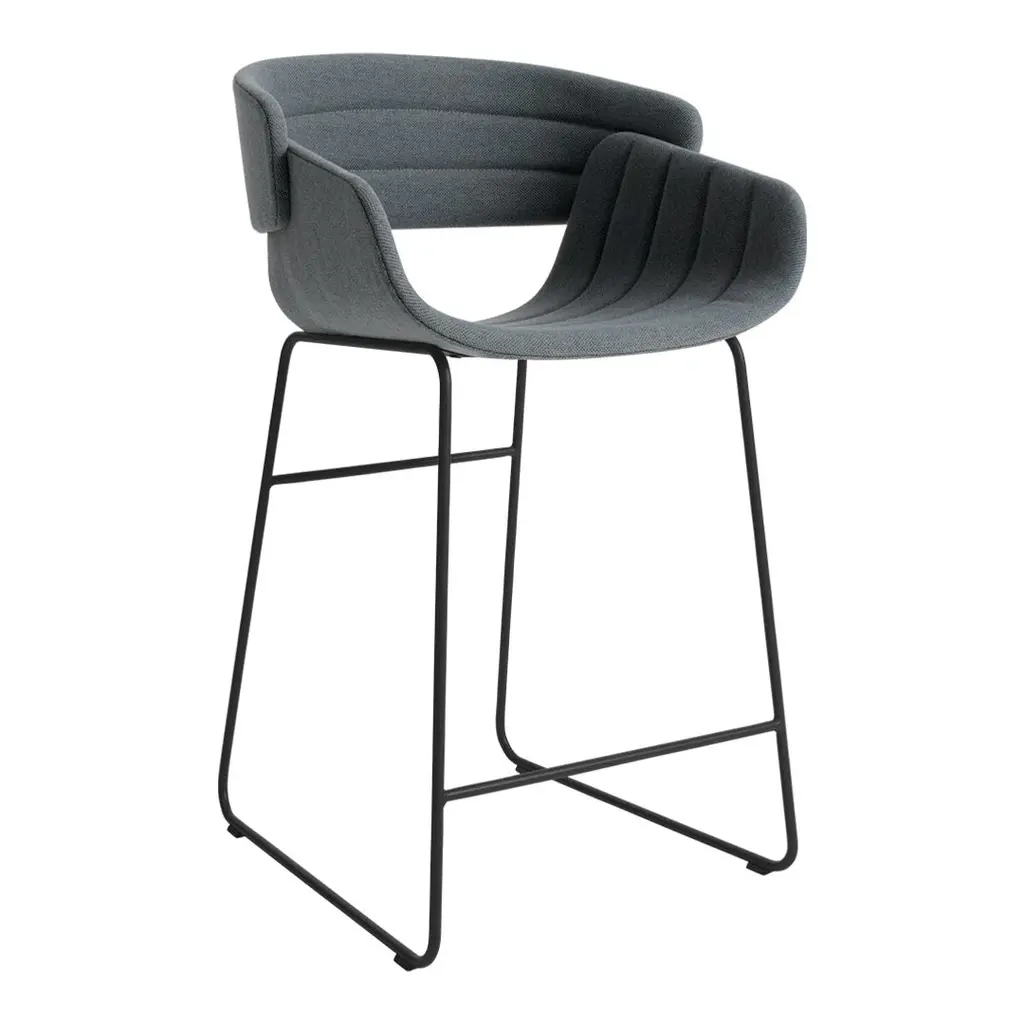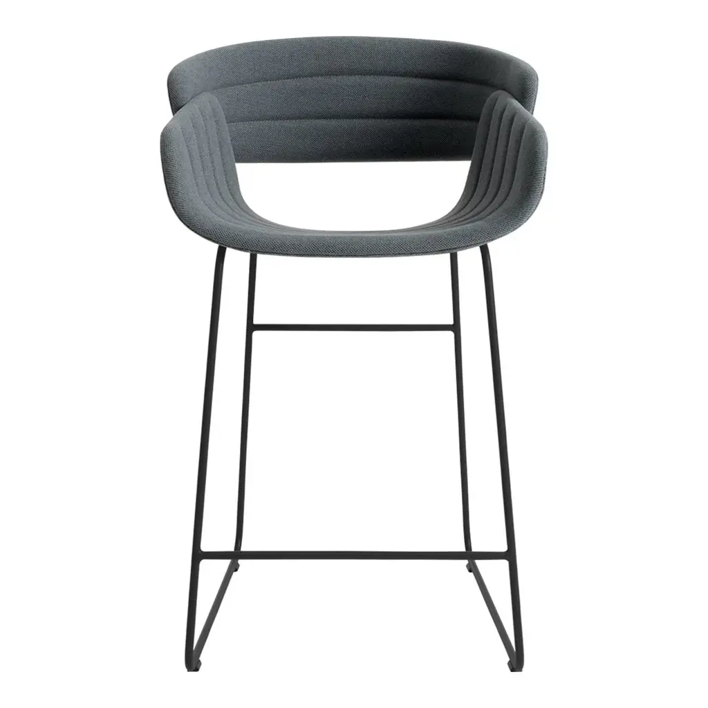 An upholstered seat and back work the curves and overlap just so to create a chair that invites you to sit down and stay awhile. The channel stitch detail may not improve the aerodynamics, but it sure does looks swell. With a color coordinated powder coated steel sled base. Also available in barstool and dining chair.