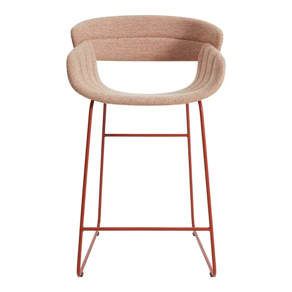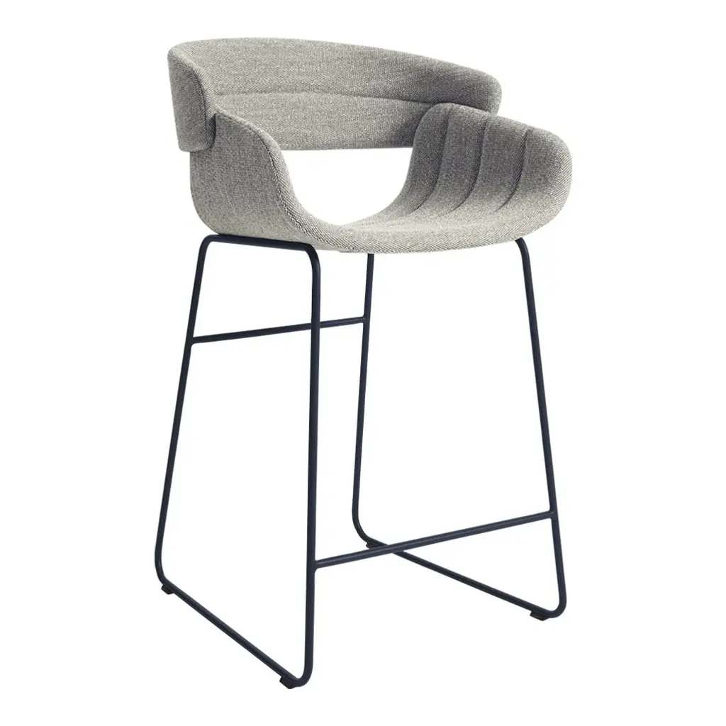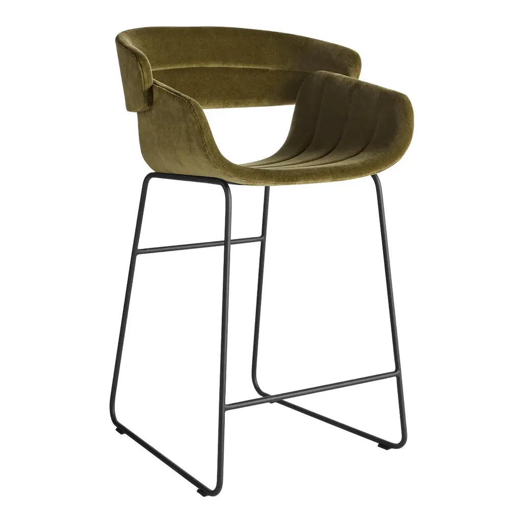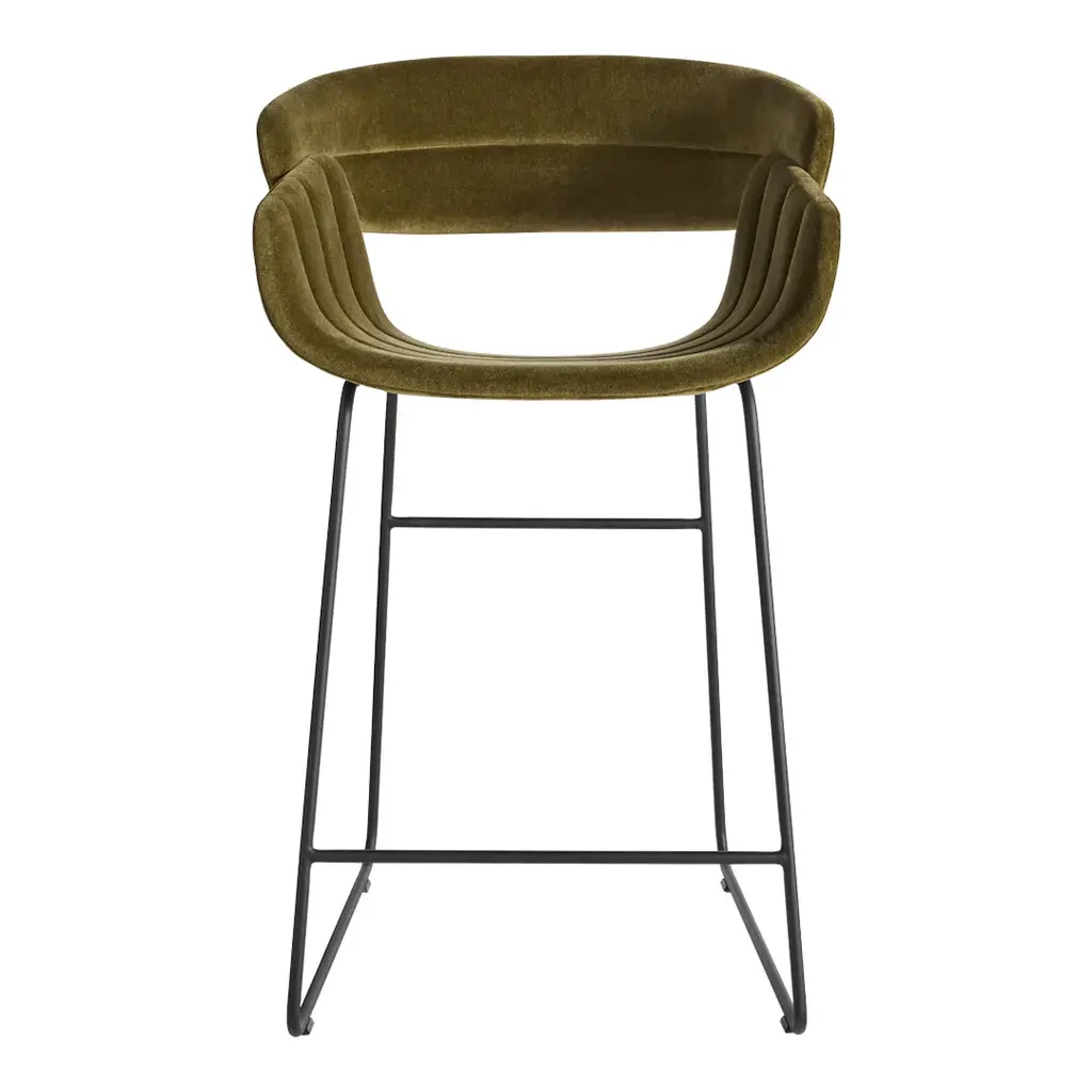An upholstered seat and back work the curves and overlap just so to create a chair that invites you to sit down and stay awhile. The channel stitch detail may not improve the aerodynamics, but it sure does looks swell. With a color coordinated powder coated steel sled base. Also available in barstool and dining chair.