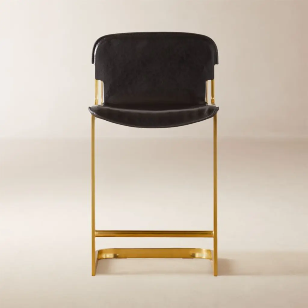 The Rake Black Counter was designed exclusively for CB2 in collaboration with Kravitz Design by Lenny Kravitz. A fashion-forward pairing of supple leather and slick metal. Gleaming brass-plated brushed steel frame is outfitted in a genuine black leather sling. Finished with a raw edge for a handmade and crafted appeal, natural hide will wear beautifully and become even more conditioned over time. Chair's architectural design is thoughtfully engineered to look striking from every angle with a continuous, cantilevered base that adds a little bounce to the sit.