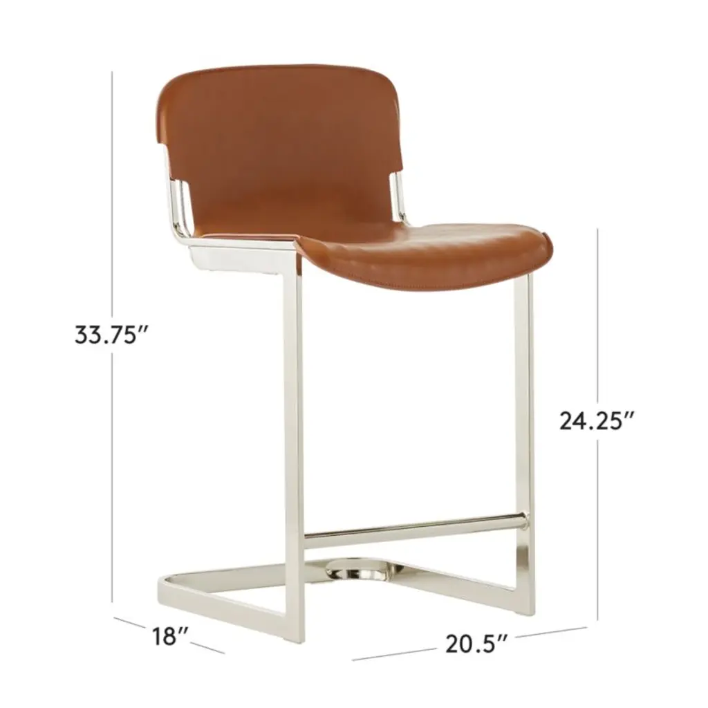 Designed in collaboration with Lenny Kravitz of Kravitz Design, this fashion-forward pairing of supple leather and slick metal is a standout at the bar. Gleaming polished nickel frame is outfitted in a saddle leather sling that slips on and off to create two distinct looks. Finished with a raw edge for a handmade and crafted appeal, natural hide will wear beautifully and become even more conditioned over time. Chair's architectural design is thoughtfully engineered to look striking from every angle with a continuous, cantilevered base that adds a little bounce to the sit. CB2 exclusive.
