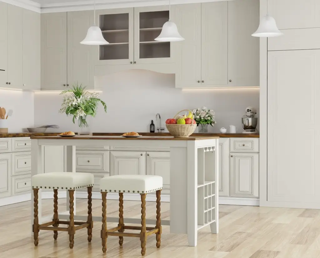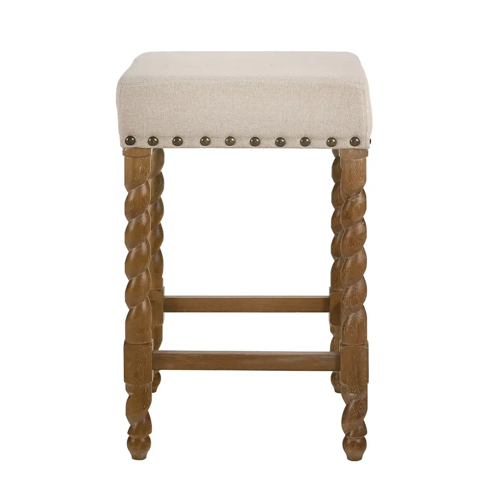 Bring heirloom charm and timeless craftsmanship into your home with our Remick Counter Stool—a perfect blend of elegance, comfort, and rustic character.This sturdy stool features beautifully turned legs with a classic barley twist design, adding an artisan feel to any kitchen or bar area. The cushioned seat is upholstered in a soft, neutral fabric and finished with antique-style nailhead trim for a refined touch. A solid wood frame provides durability, while the convenient footrest ensures relaxed seating at any counter-height space.