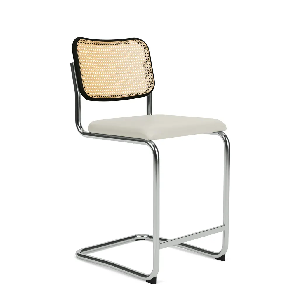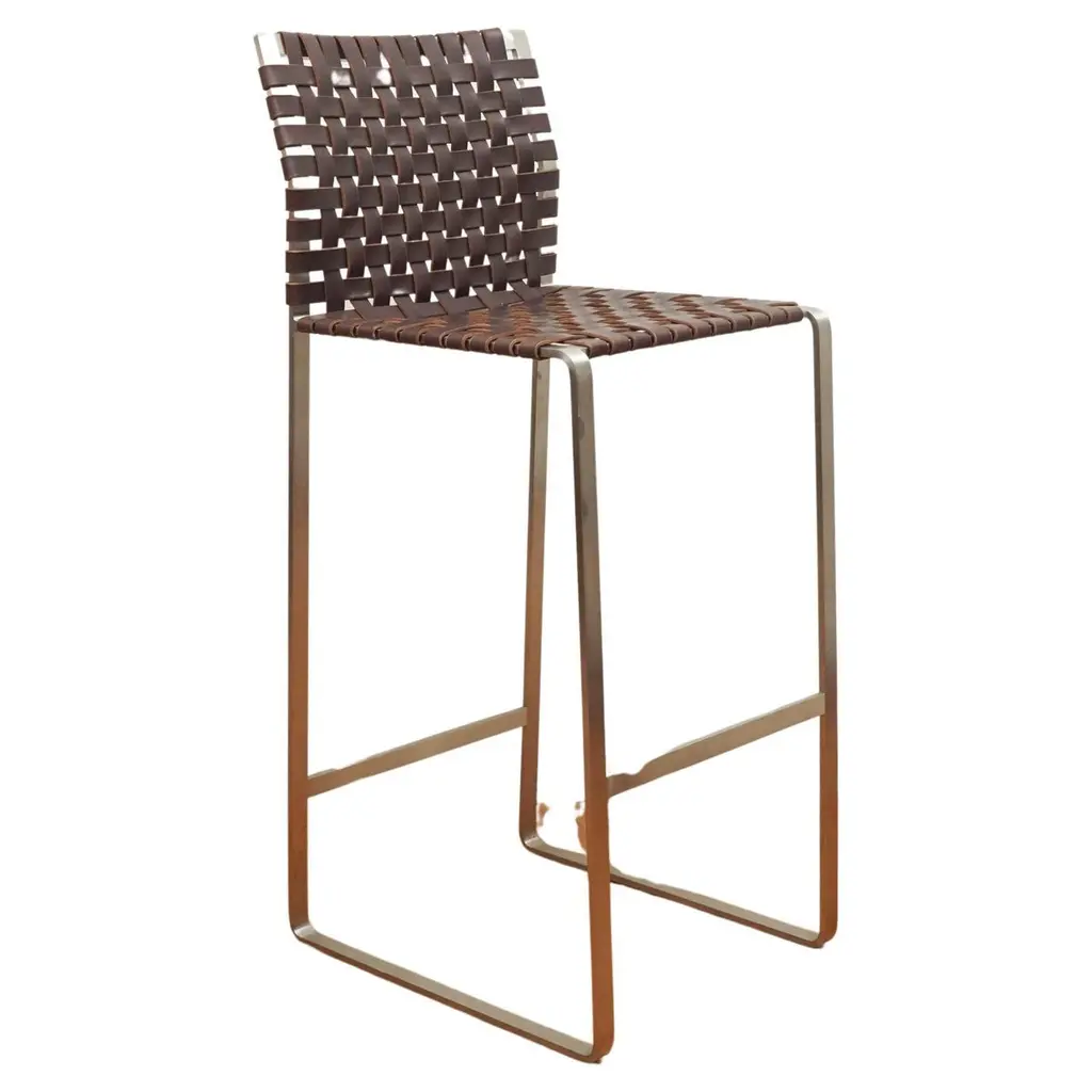 A terrific seat styled in the spirit of the Cesca Chair designed in 1928 by Marcel Breuer. The name Cesca is a tribute to Breuer’s adopted daughter Francesca (nicknamed Cesca). A wood framed back is woven with top grain leather straps over a wood framed woven leather seat elevated on a tubular steel cantilever frame.