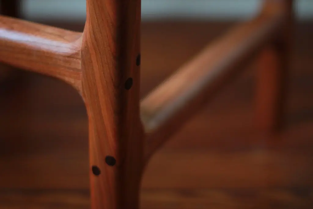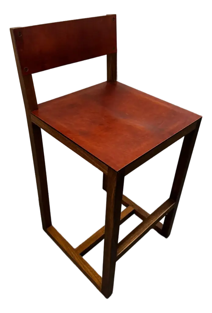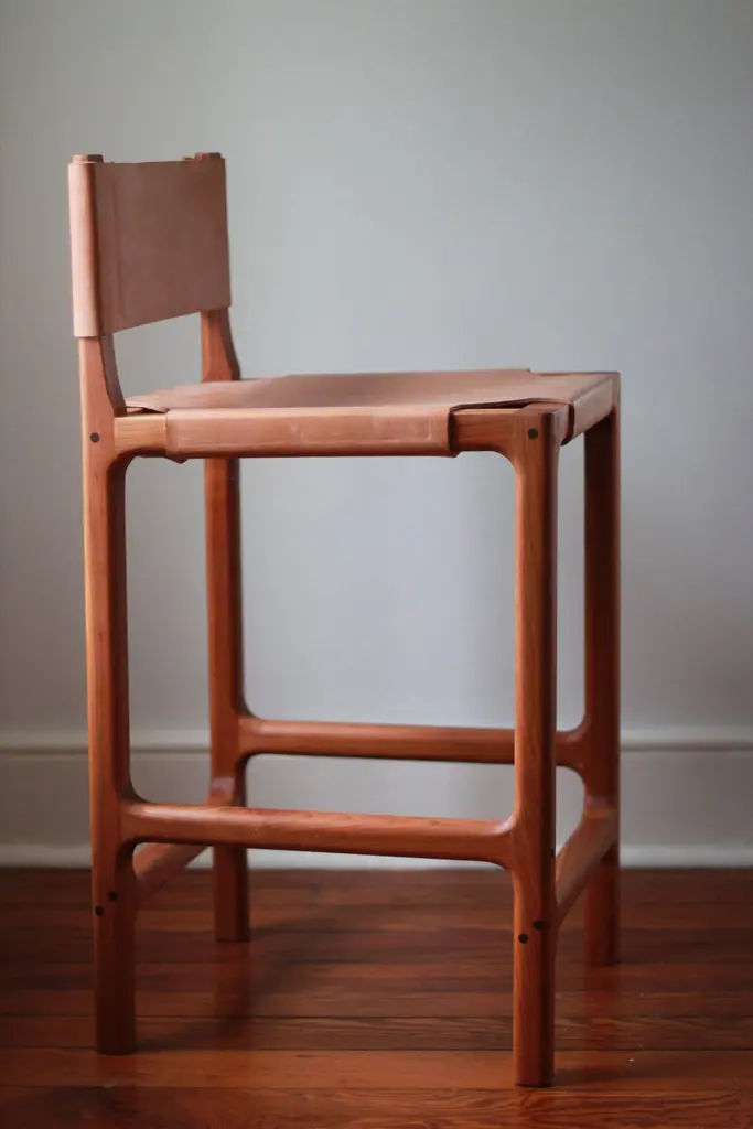 This is a cherry counter stool with a stretched leather seat and back. The frame is solid cherry, with a gentle radius at the interior joints and softly rounded edges. The leather is a natural colored, 10 oz vegetable tanned leather that has been stretched across the frame, providing a seat that adapts to each individual and seems to float you on air.This piece is made to order, and as such I am able to vary the height, the wood, and the color of the leather. Should you have any questions or want to hear more about it, please feel free to contact me.Dimensions are: Seat height 26"; back height 36"; seat dimensions: 18" W x 17" D.