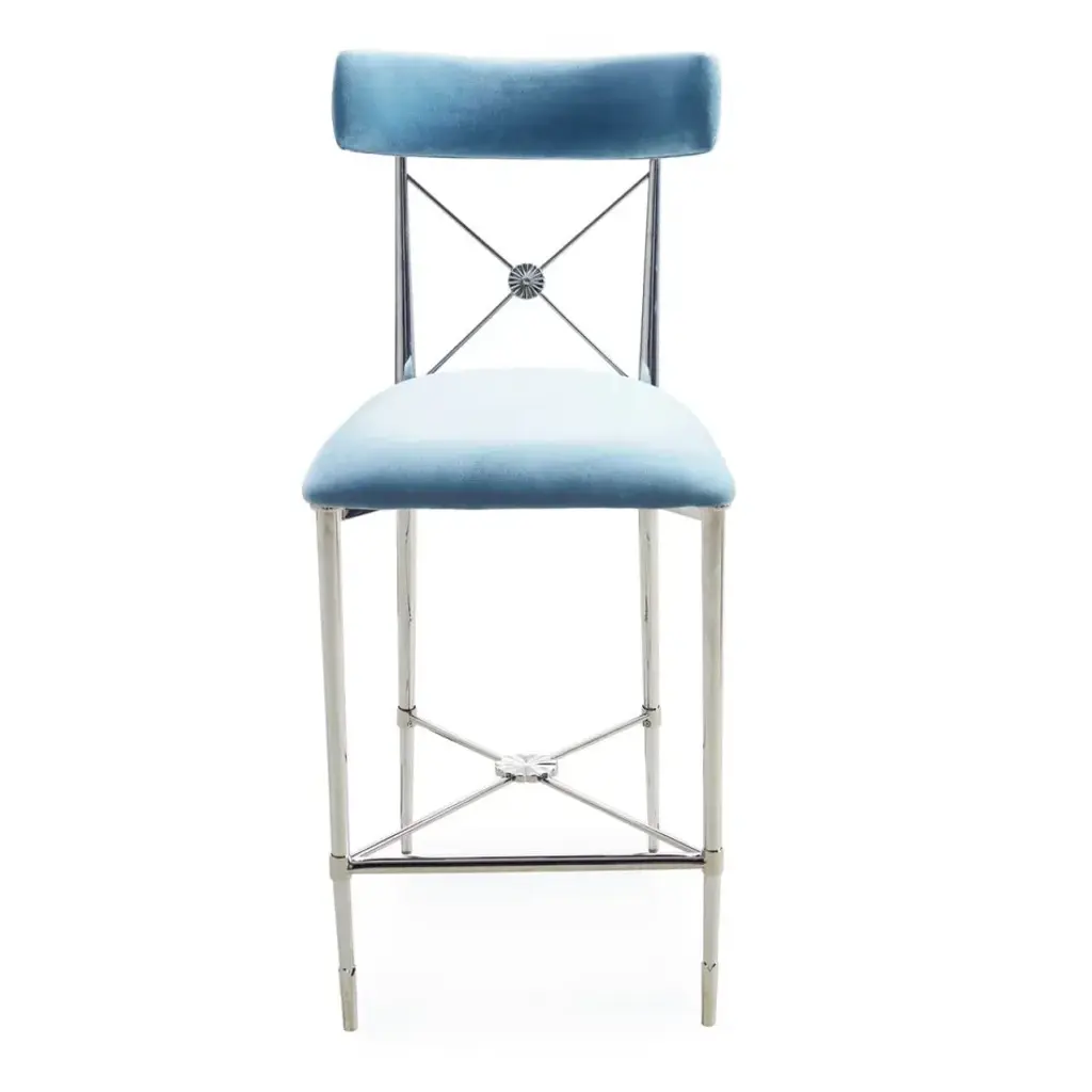 Our modern homage to an Empire-style dining chair, now perfect for your kitchen counter. Our Rider Counter Stool balances Parisian bistro with bar seating—and ultra comfort. Choose from a classic blackened metal frame with brass sabots and escutcheon, or the twinkly glamour of a white or polished nickel frame with nickel accents.