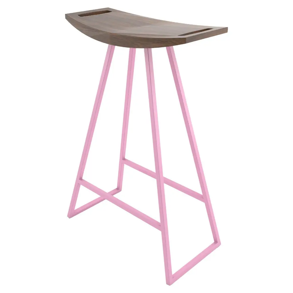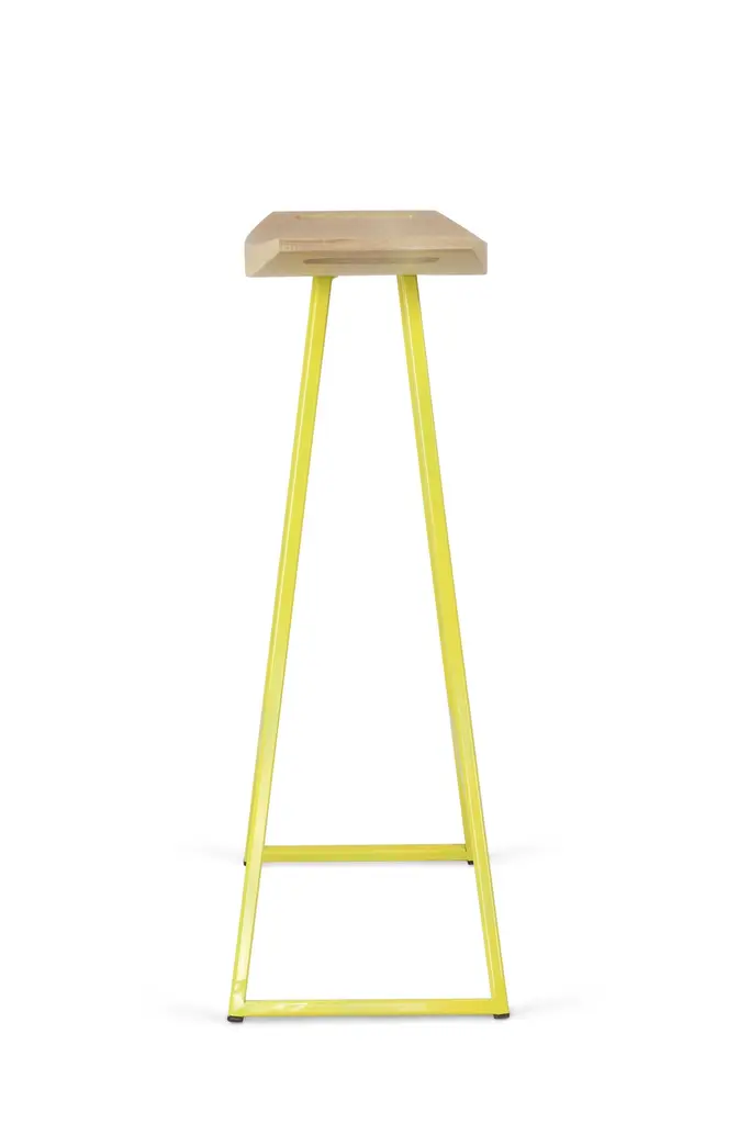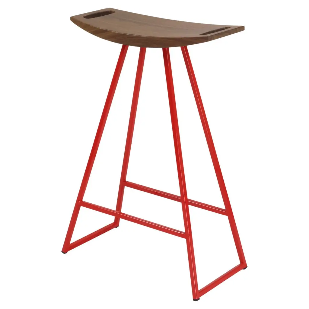This sleek stool has a thin carved wooden seat that rests on a steel tubing base. The elegant seat is curved for seamless comfort while displaying a stunning intersecting diagonal accent inlay. This eye-catching and durable piece will make any kitchen counter, bar or table stand out. The color options for the powder-coated base are red, green, orange, or yellow. Or if you’re not quite that daring we also offer white and black. The seat comes in either Walnut with Maple inlayed, Maple with a Walnut inlay, solid Walnut or solid Maple. The Roberts is available in table, counter and bar height. Measure: 24" H.