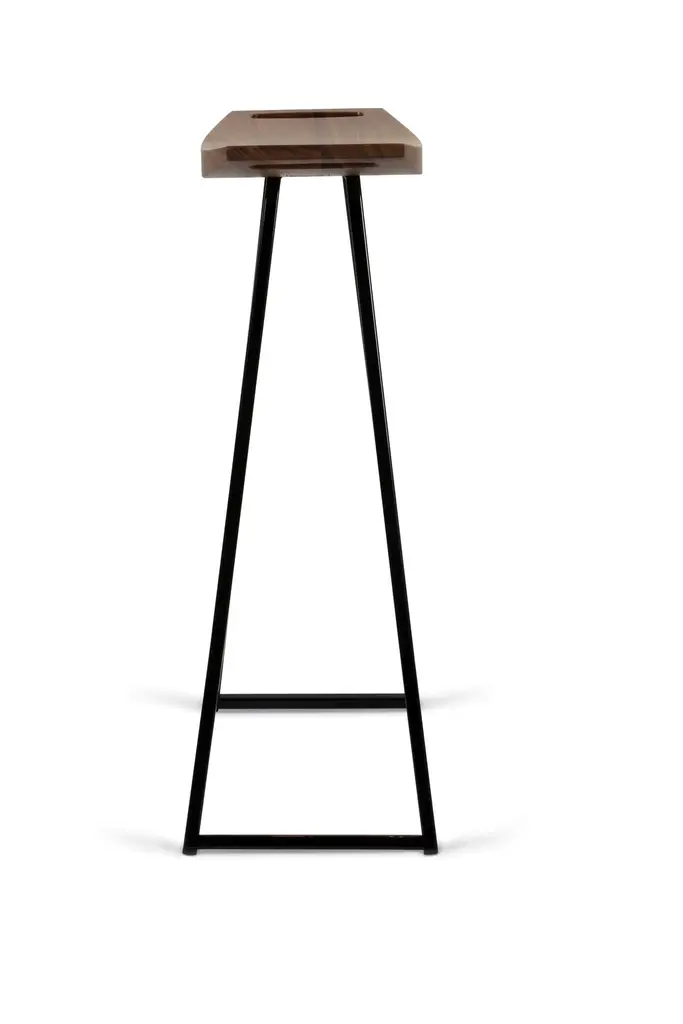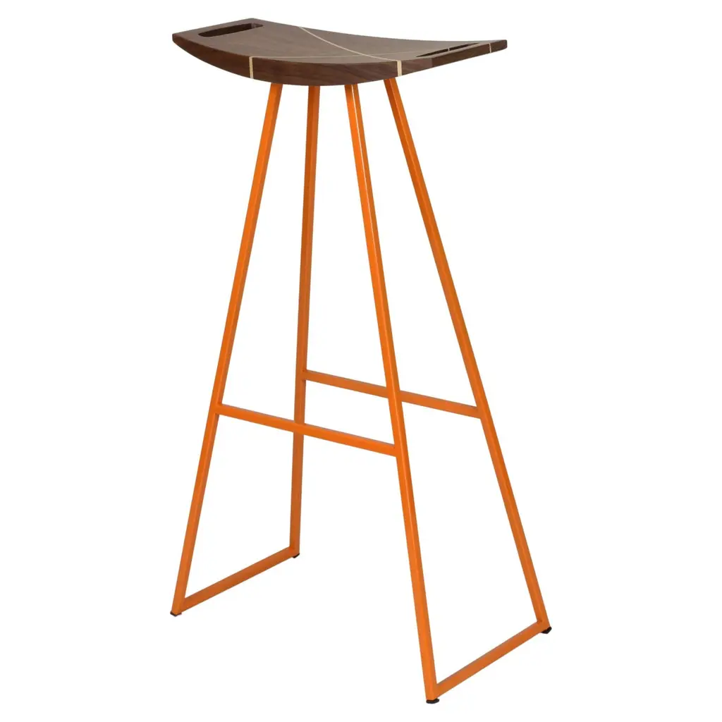 This sleek stool has a thin carved wooden seat that rests on a steel tubing base. The elegant seat is curved for seamless comfort while displaying a stunning intersecting diagonal accent inlay. This eye-catching and durable piece will make any kitchen counter, bar or table stand out. The color options for the powder-coated base are red, green, orange, or yellow. Or if you’re not quite that daring we also offer white and black. The seat comes in either Walnut with Maple inlayed, Maple with a Walnut inlay, solid Walnut or solid Maple. The Roberts is available in table, counter and bar height. Measure: 24"H.
