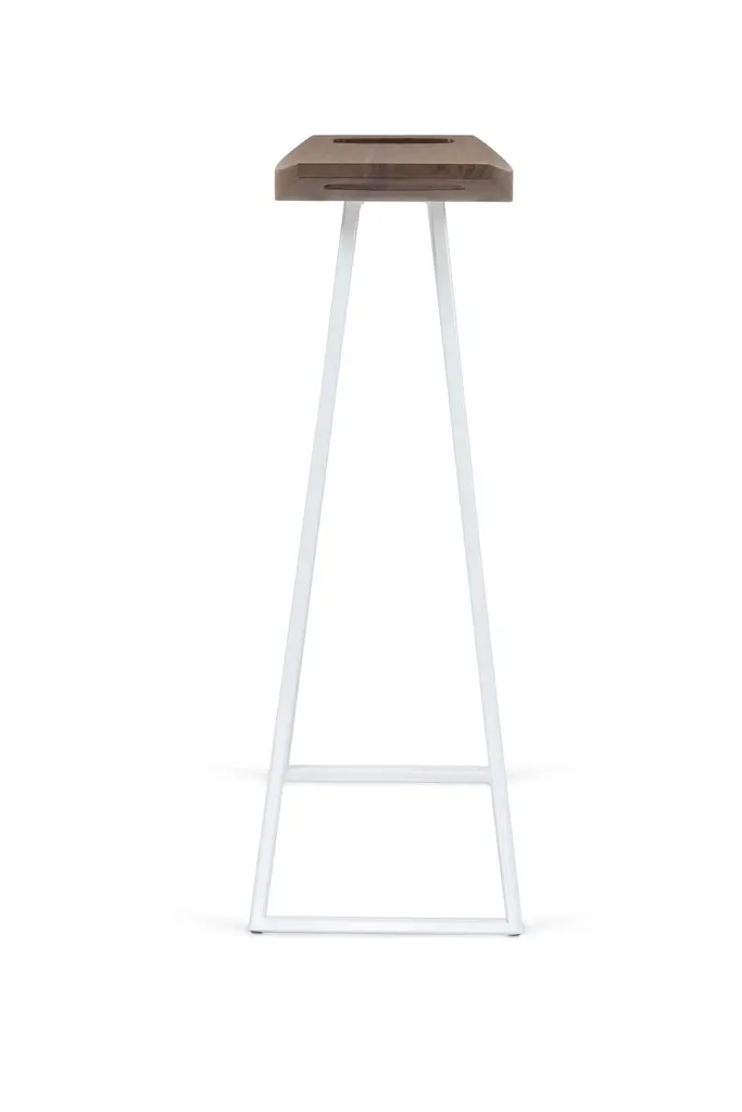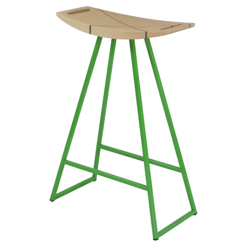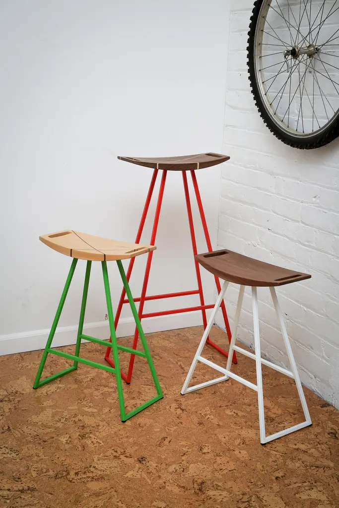 This sleek stool has a thin carved wooden seat that rests on a steel tubing base. The elegant seat is curved for seamless comfort while displaying a stunning intersecting diagonal accent inlay. This eye-catching and durable piece will make any kitchen counter, bar or table stand out. The color options for the powder-coated base are red, green, orange, or yellow. Or if you’re not quite that daring we also offer white and black. The seat comes in either Walnut with Maple inlayed, Maple with a Walnut inlay, solid Walnut or solid Maple. The Roberts is available in table, counter and bar height. Measure:24" H.
