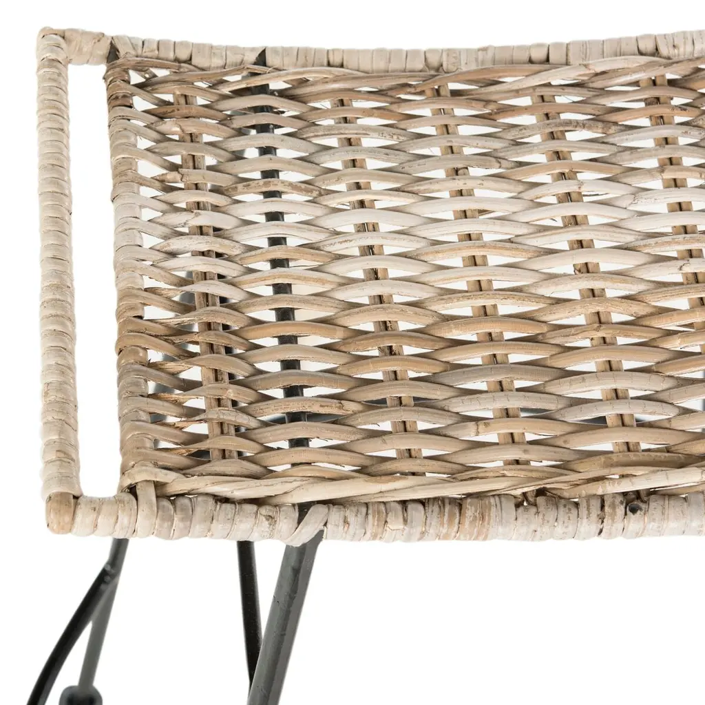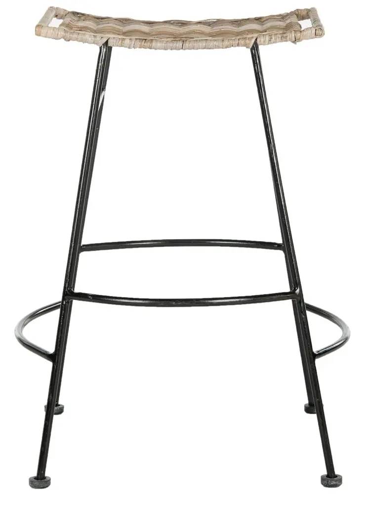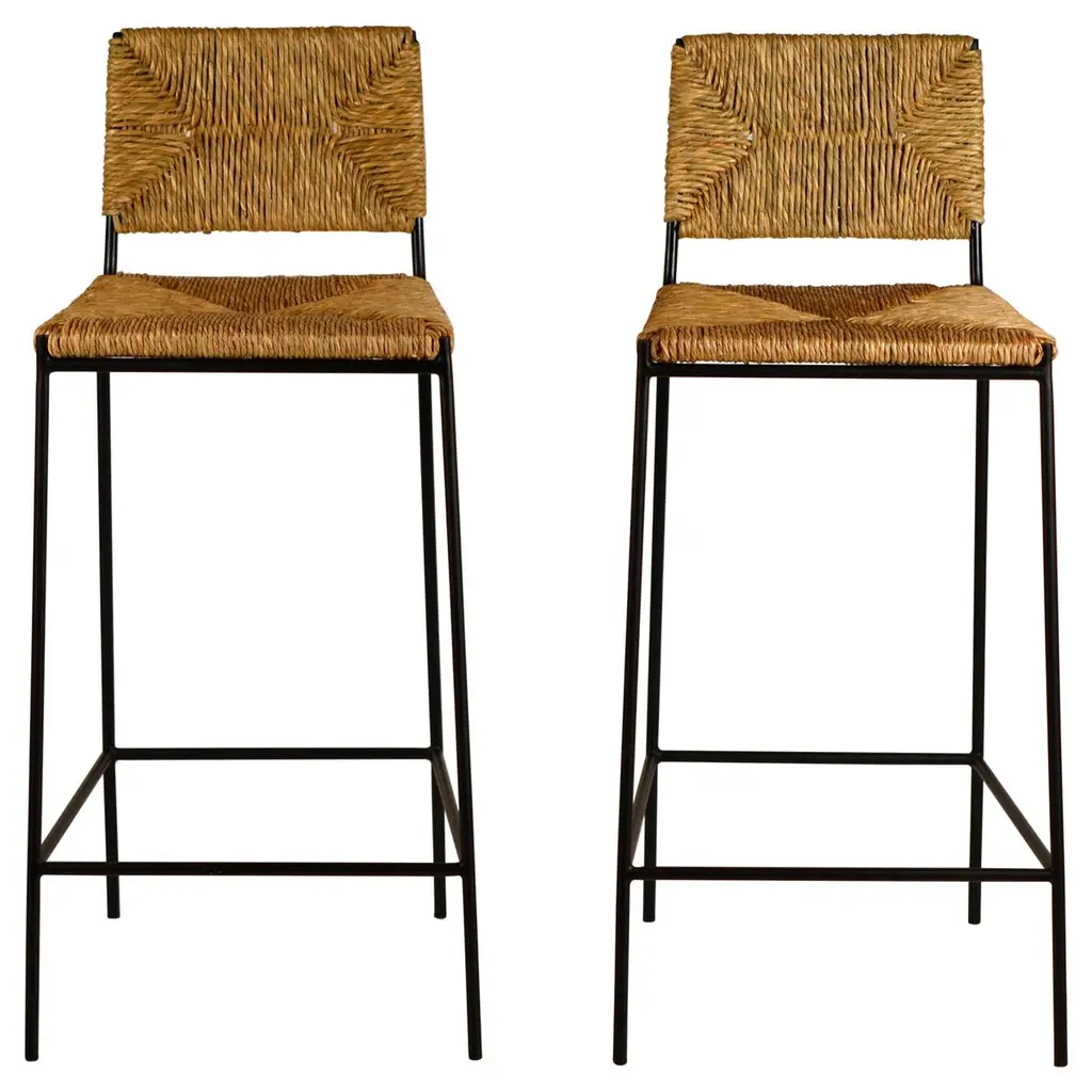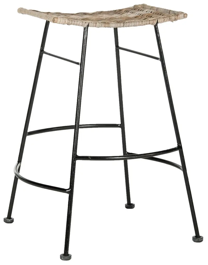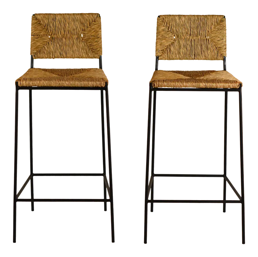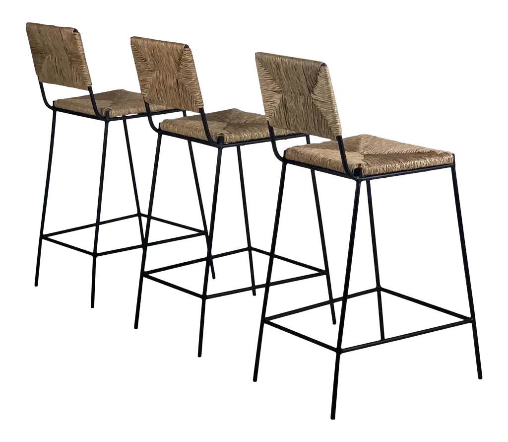 Woven rattan adds an element of hearty texture to the otherwise sleek and airy framework of these ebonized iron counter stools.