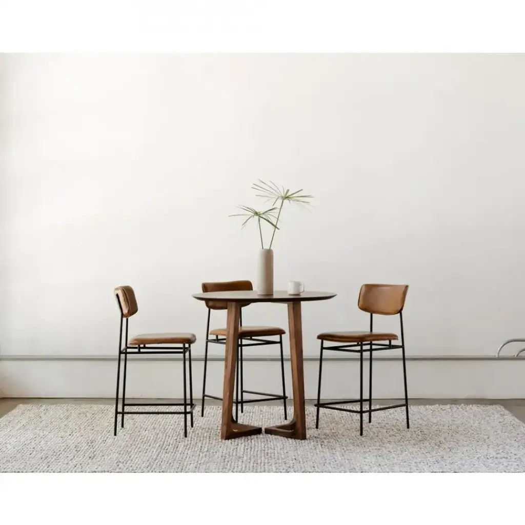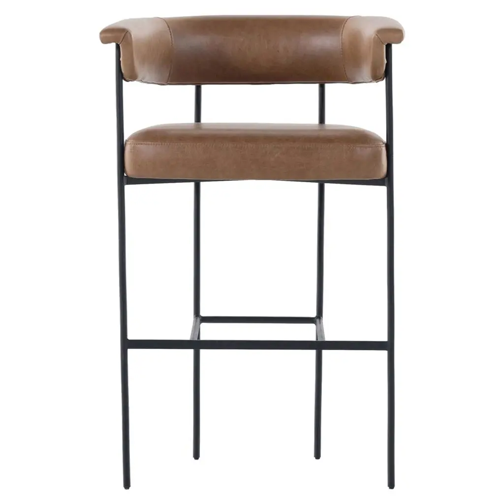 Accentuated by a slender iron frame, the Sailor counter stool epitomizes modern design with an air of sophistication, placing comfort front and center with a plush, padded seat and a low backrest upholstered in top-grain leather. Whether paired with the kitchen island, dining counter, or home bar, this piece sits at the perfect height.