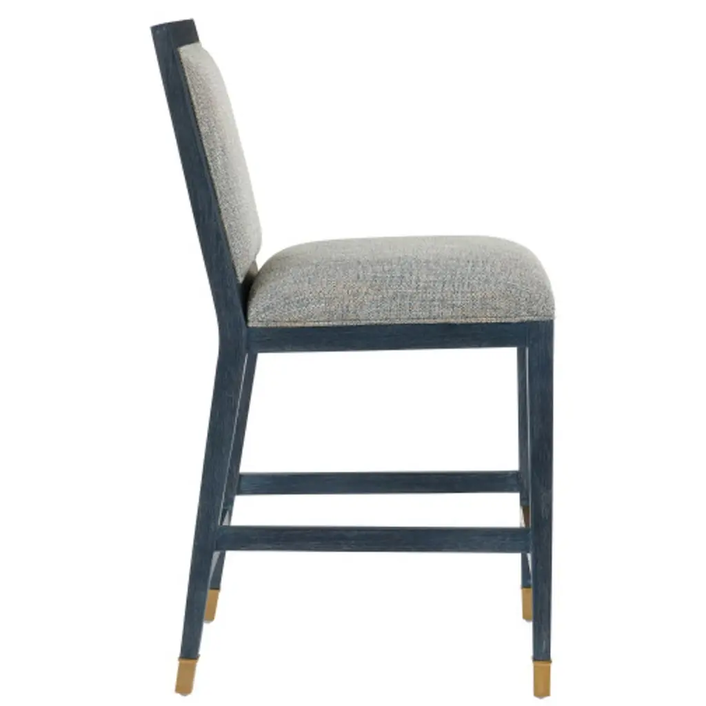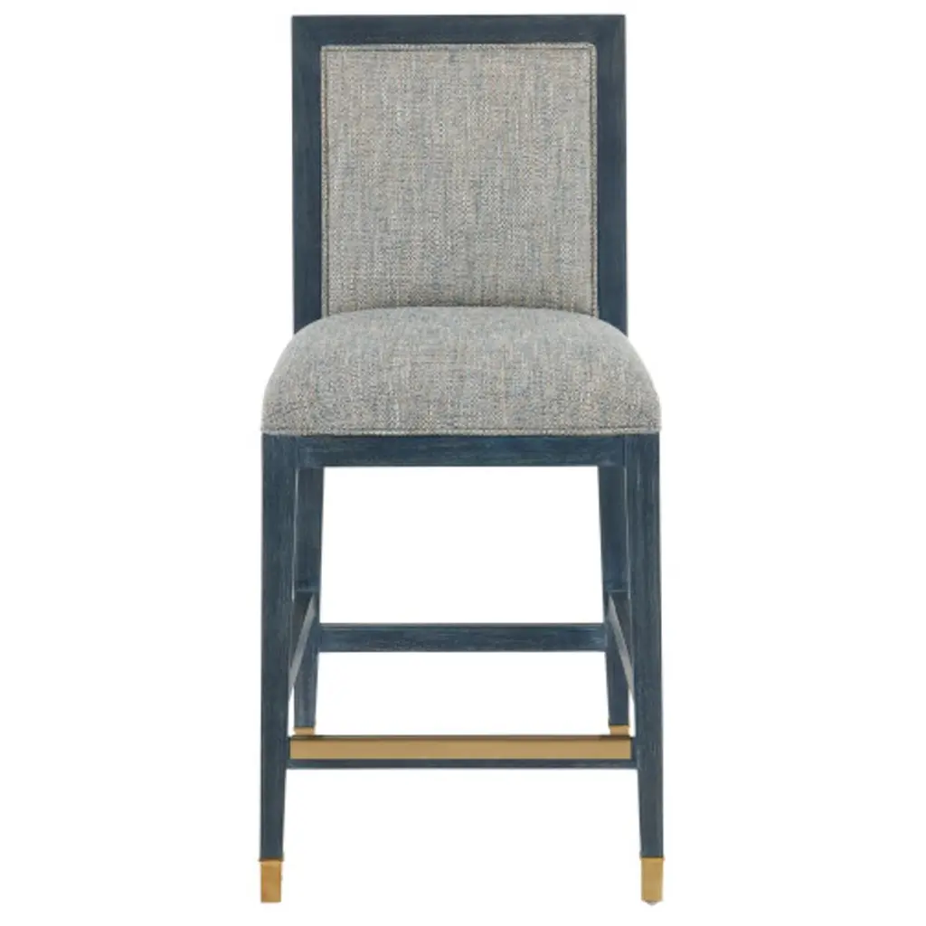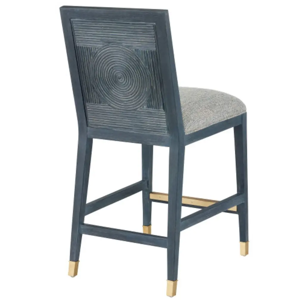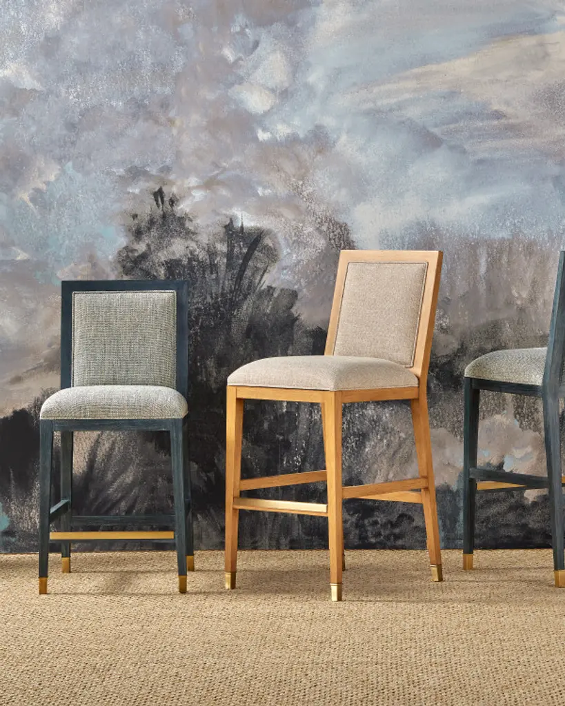 The Santos Counter Stool features a handcrafted split rattan pattern on the back, applied to a solid mahogany frame. The natural material is complemented by a refined finish that covers the back, frame, and legs. Upholstered in a premium material, the stool is enhanced with brass ferrules and a capped step, adding sophistication to its overall design.
