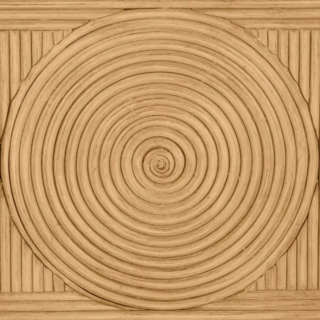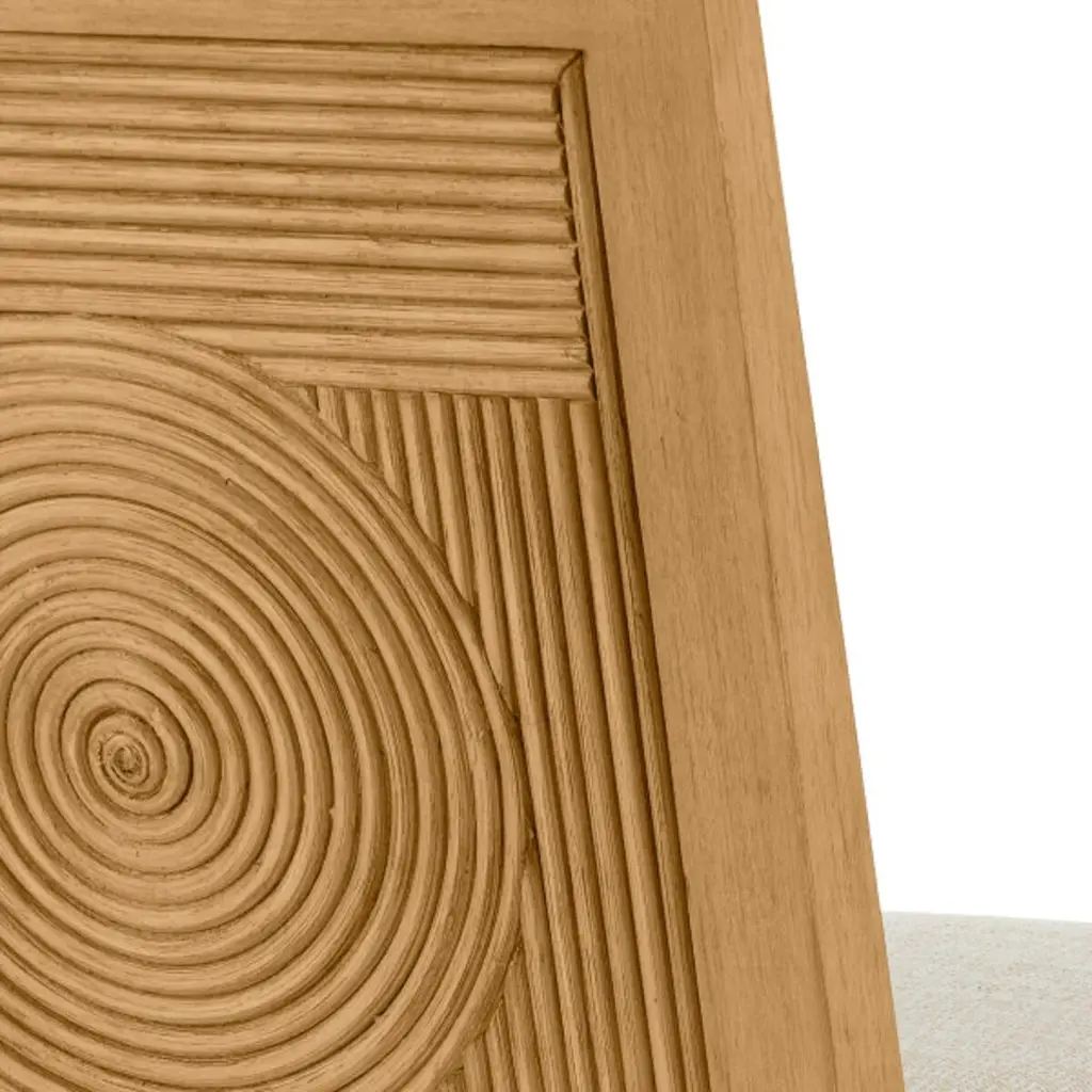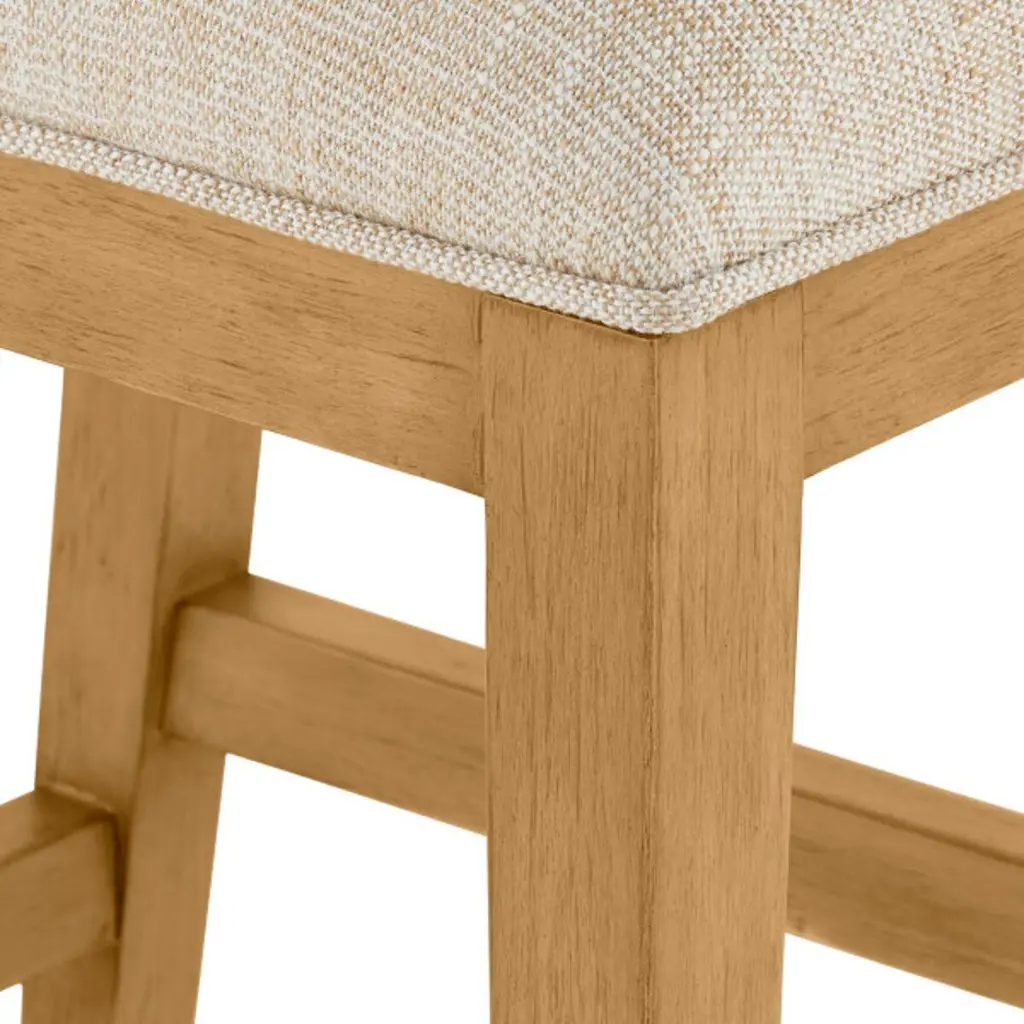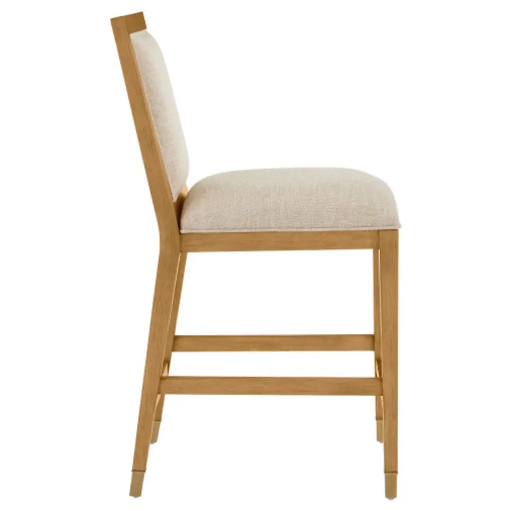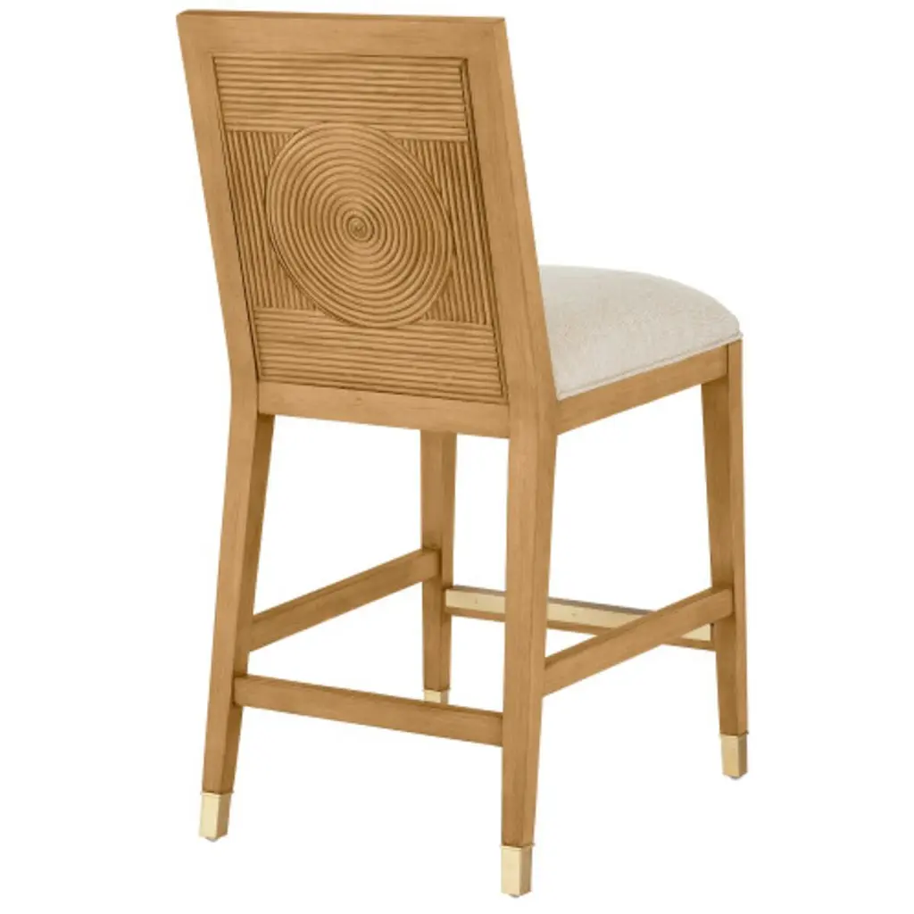The Santos Counter Stool features a handcrafted split rattan pattern on the back, applied to a solid mahogany frame. The natural material is complemented by a refined finish that covers the back, frame, and legs. Upholstered in a premium material, the stool is enhanced with brass ferrules and a capped step, adding sophistication to its overall design.