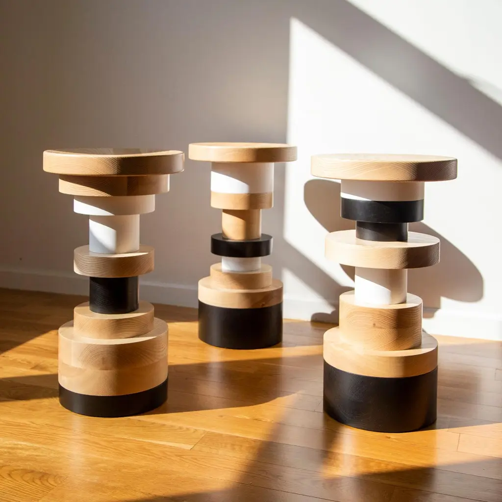 This listing is for 1 Sass Stool from Souda. We offer three different shapes (A, B, & C). This listing is for 'B', which is the stool in the first image.The Sottsass inspired “Sass Stools” are simple, sculptural accents for any interior space. Made from stacked wooden bases and a carved out seat, Sass stools are perfect individually or in groups. Each stool has a small dished out top for comfort.Made in the USA Each stool is solid wood.