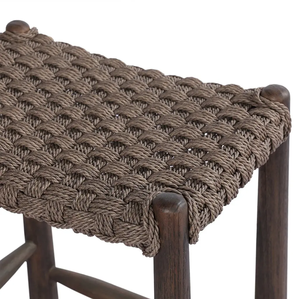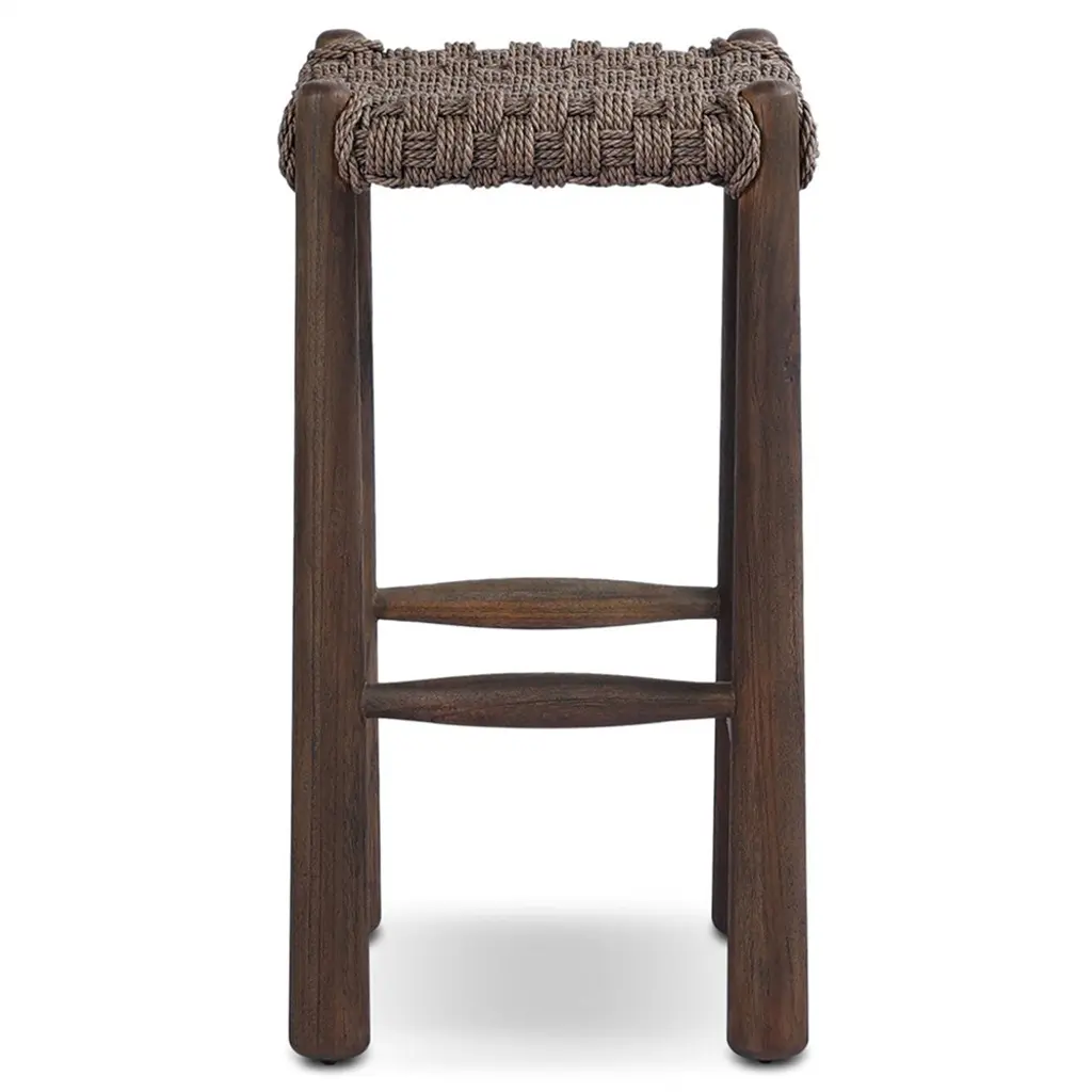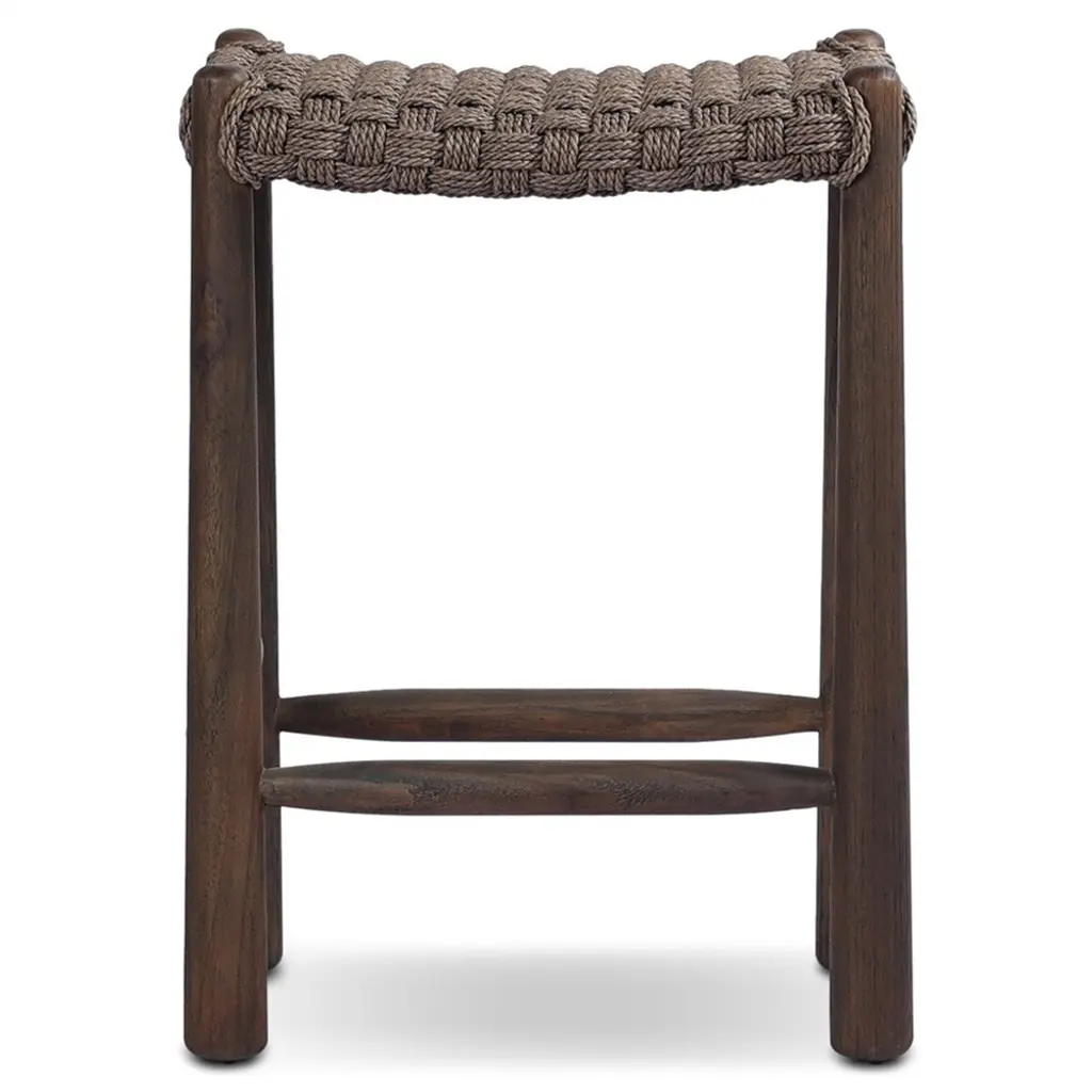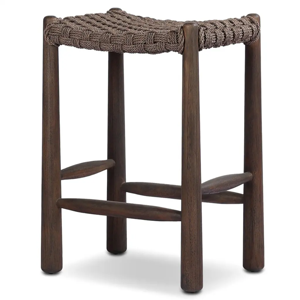A design collaboration by Amber Lewis and Four Hands. Exaggerated tapered legs support the saddle-style seat of this outdoor counter stool, finished with a chunky box weave. Cover or store inside during inclement weather and when not in use.
