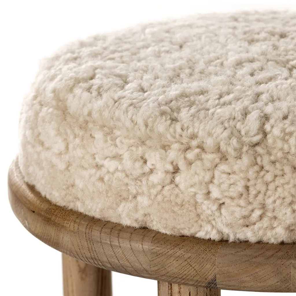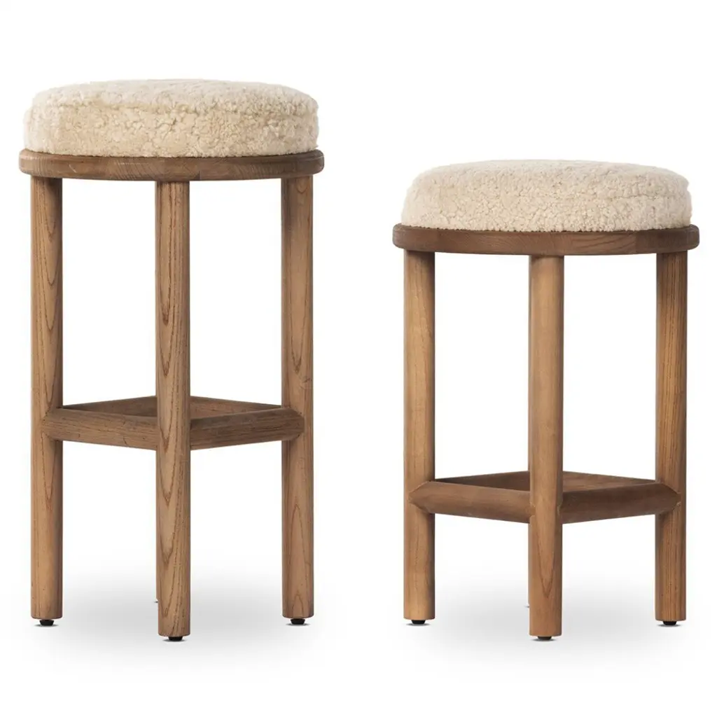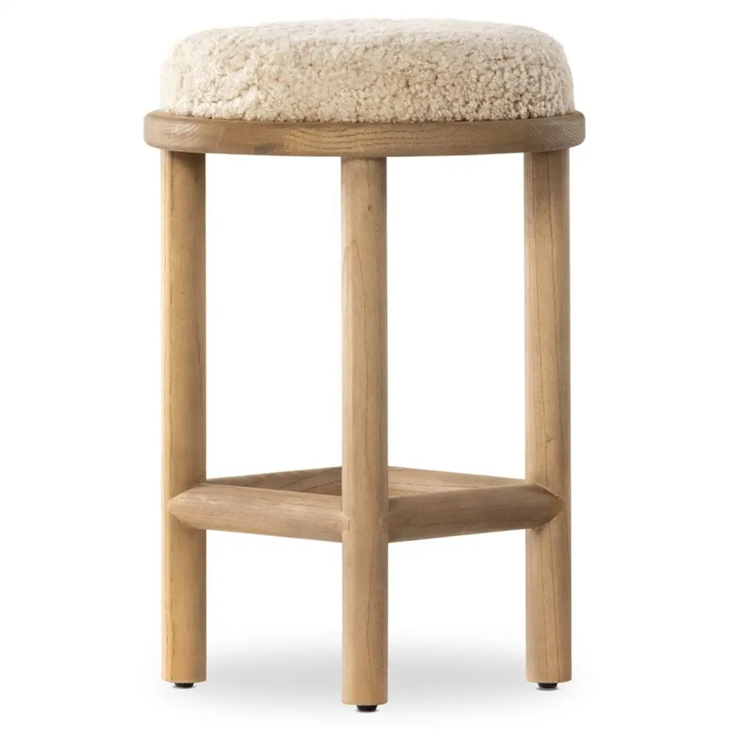 The Sawyer counter stool highlights serene hues and organic materials, bringing a touch of rustic charm to your kitchen. Blonde-finished nettlewood provides an elegant framework for the plush seat, upholstered in soft beige shearling.