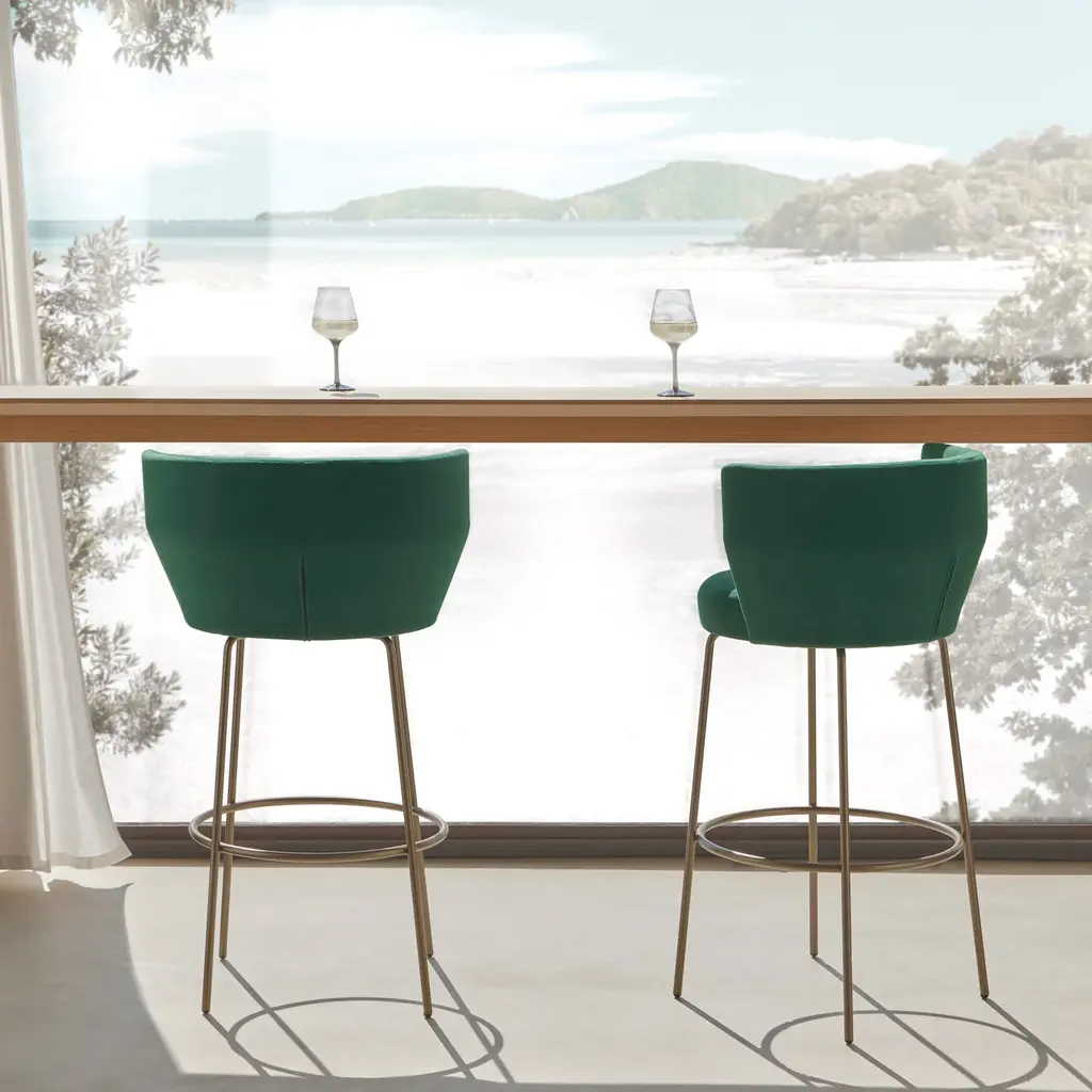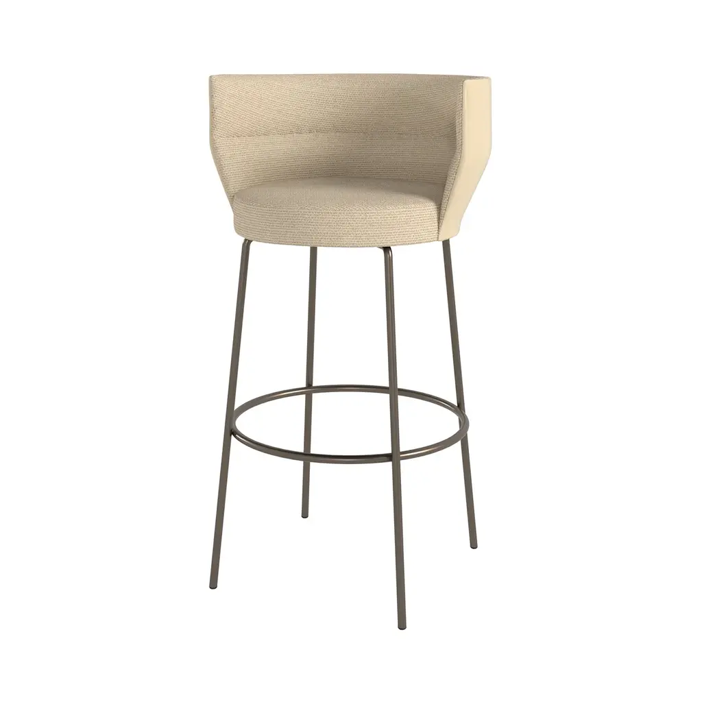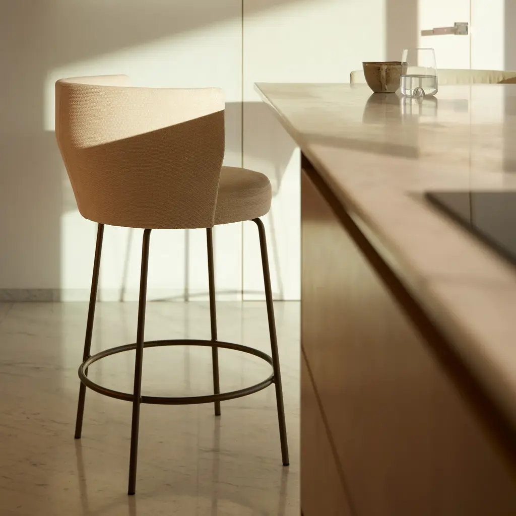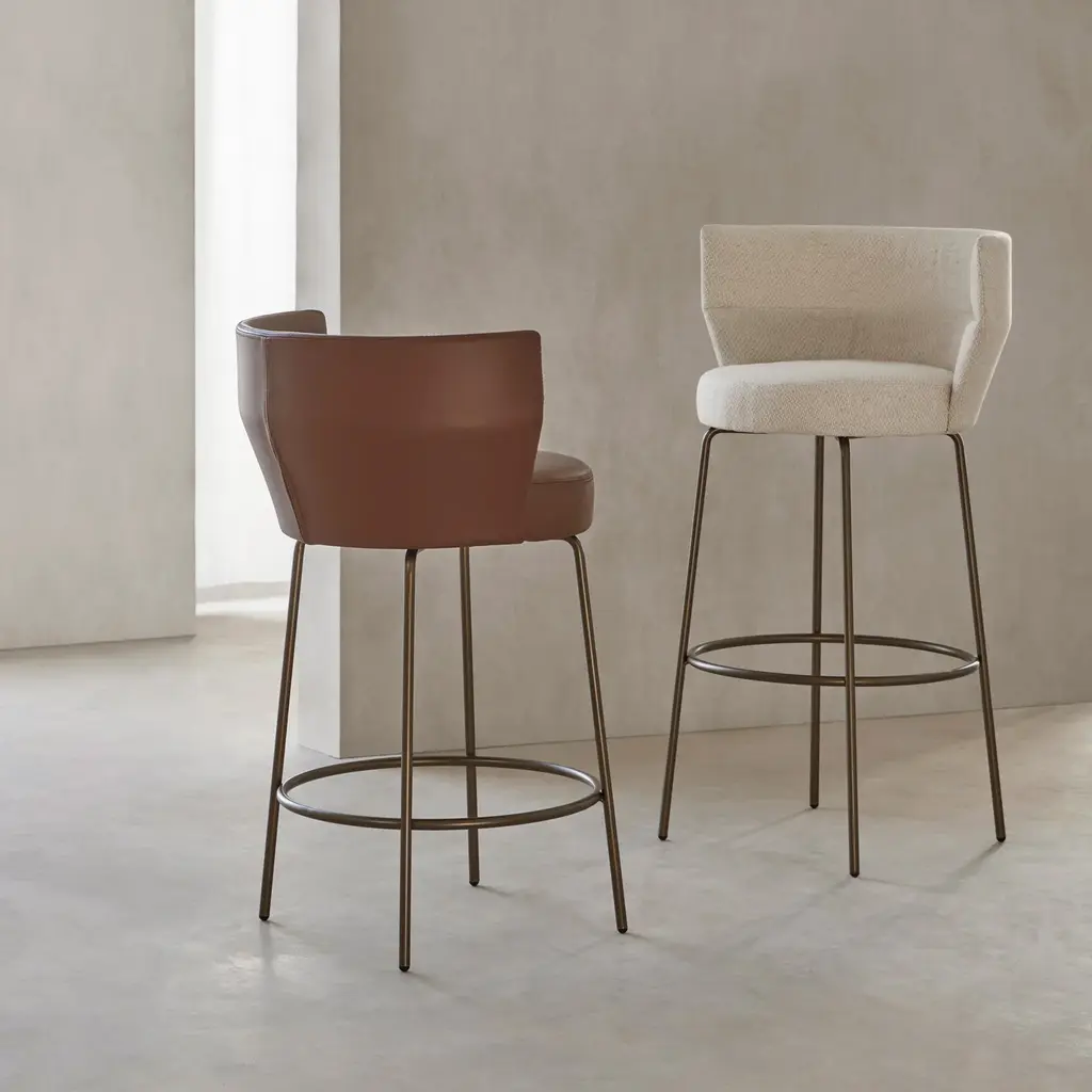 The Sena Stools are distinguished by their elegant, curved lines that provide both comfort and style. The curved backrest and seat are crafted from beech plywood, and covered with fire-retardant polyurethane for enhanced safety and comfort. The stools are available with lacquered aluminum metal legs featuring a 360º rotation system. Plastic or felt feet are included to protect flooring surfaces. These stools are suitable for various environments, including residential and hospitality settings.