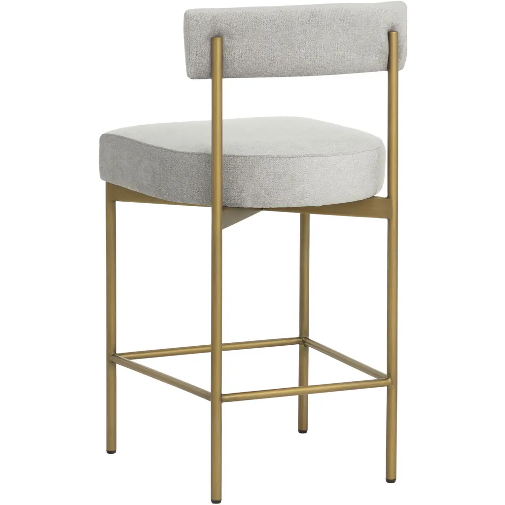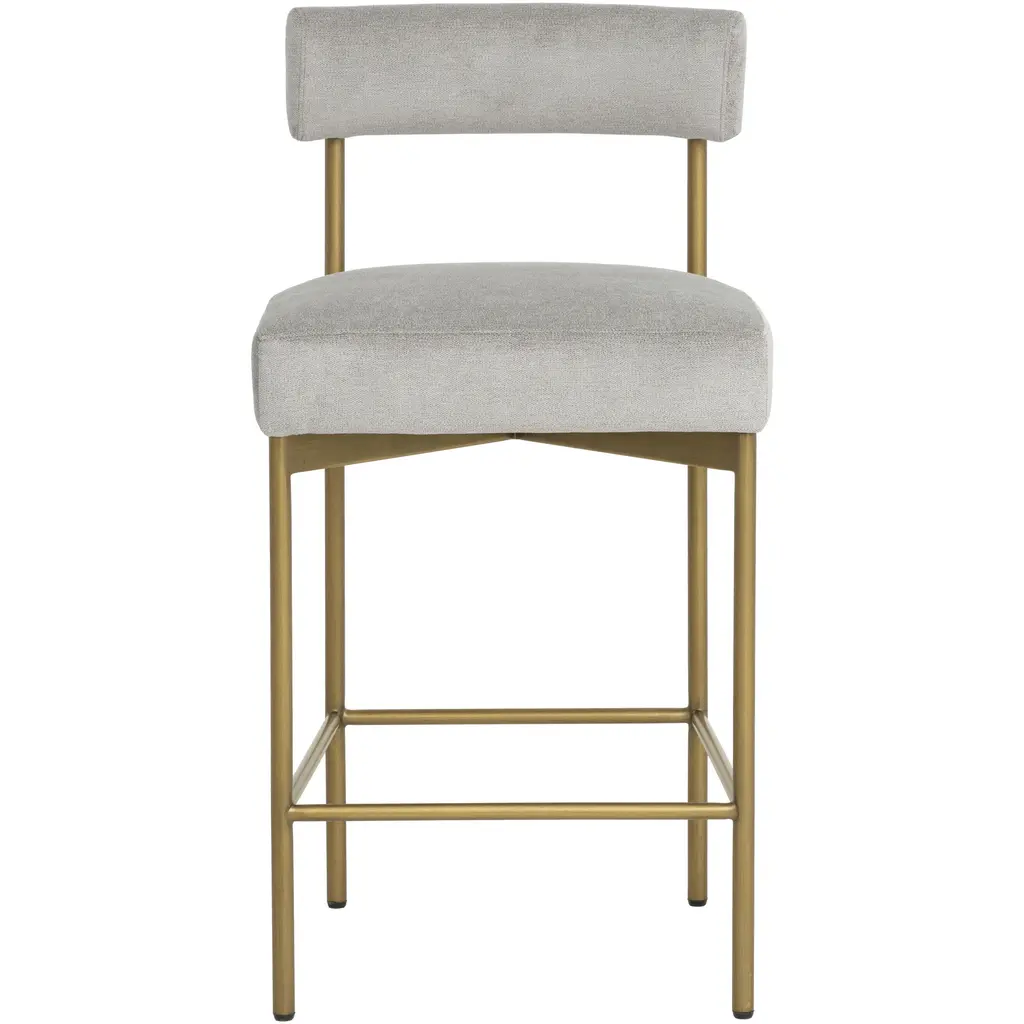 Exude modern style this open back counter stool. Stocked in polo club stone fabric with an antique brass steel frame.