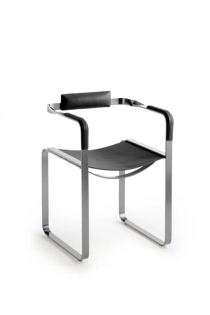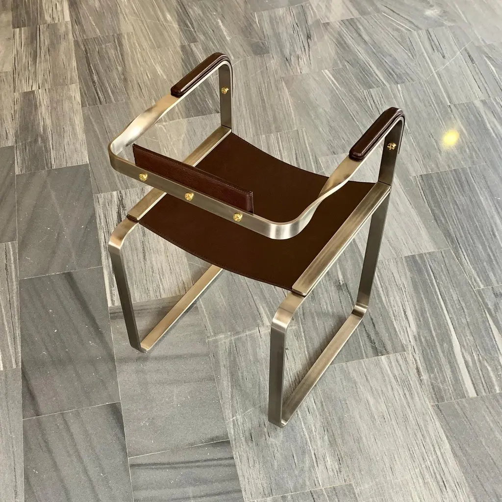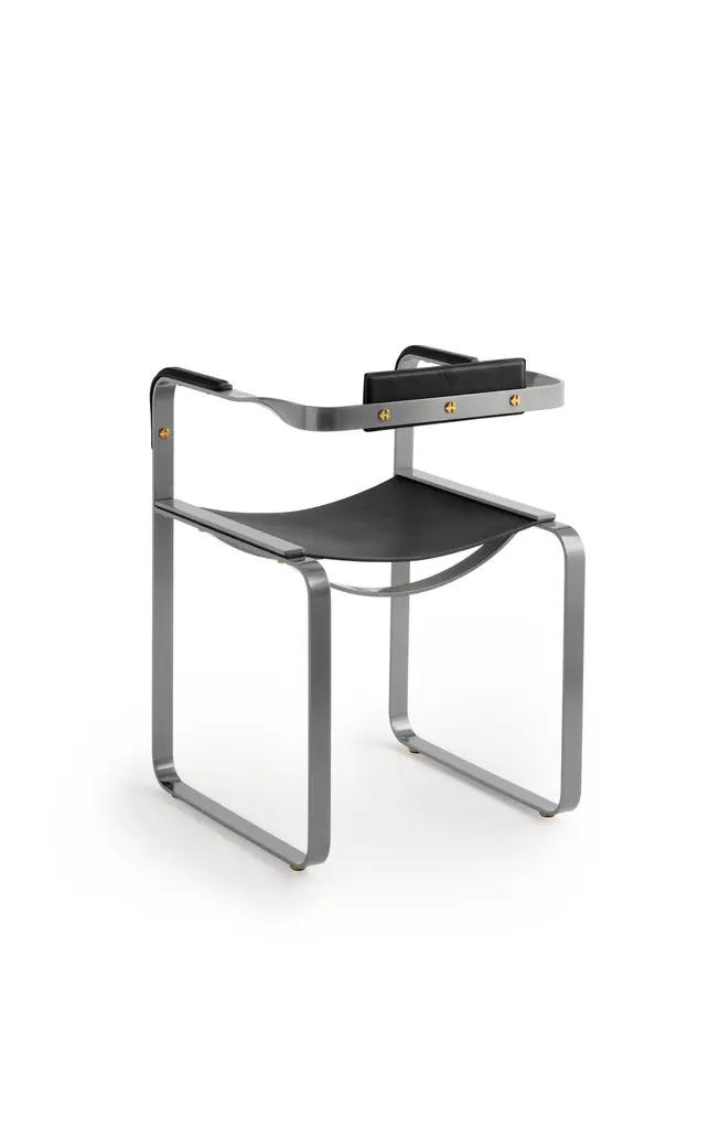The Wanderlust contemporary armchair belongs to a collection of minimalist and serene pieces where exclusivity and precision are shown in small details such as the hand-turned metal nuts and bolts that fix the leather surfaces, that go unnoticed at first sight.The robustness of the steel structure is combined with the delicacy of the rounded edges. The matte metal finishes evoke the passage of time and are complemented by vegetable tanned cowhide leathers that age gracefully with its use.The Wanderlust counter stool is designed and conceived as a tribute of Bauhaus tribute, the phrases "Less is more" and "God is in the detail" from the German American architect and industrial designer Mies van der Rohe, one of the pioneers of modernist architecture, define this collection.All pieces are done with cold bended steel rods, polished, nickel plated, colored by electrolysis, and lacquered. The process of polishing and lacquering the steel, goes through a manual and delicate chroming process, which gives its final and unique metal color finish. This precise technique gives a uniform metallic finish of minimum 50 microns over the entire Surface. Our metal finishing has successfully passed a corrosion resistance test in a salt spray chamber according to UNE-EN ISO 9227: 2017 and UNE-EN ISO 1456: 2010. Our signature screws are made with brass turning lathed, polished, and lacquered, these are the pieces that fix the saddle leather to the metal frame.Leathers are Spanish hides vegetable tanned. We use premium saddles in multiple colors to adjust to your taste and interior needs. This traditional vegetable dying and tanning method is an organic technique that relies on natural tannings from bark or plant tissues. The use of oils and natural fats give the leather a distinctive flexibility and texture, allowing it to be molded, retain its shape and age graciously.All skins are carefully selected from food industry sub-products, with a minimum thickness of 3.5 mm / 0,02 in, using the part of the animal's shoulder, which allows for larger pieces and uniformity, even though signature wrinkle from the animal’s neck may be recognizable. The vegetable tanning is a traditional and artisan treatment, which is respectful to the environment. Even with careful selection natural marks as a result of the contact with other animals, the age, origin and characteristics of the skin, or even the season in which the tanning takes place cannot be avoided. We still believe that these factors only add authenticity and uniqueness to every piece. Our leather parts are made with double saddles, always showing the top side of the hides that presents the better quality.Customization options.With the aim of creating customized pieces, clients can select from the various metal finishes, and leather colors to create pieces that complement their home décor. Leather colors available, black, navy, dark brown, cognac and natural tobacco, and steel polished finishing available, aged brass, black smoke and aged silver.Normally we use tone on tone threats for stitches, but client can select a contrast option, being possible to select any color to make a unique piece for the project it belongs. The finish on the edges of our leather components are sanded and hand painted. We have the option of select an alternative color if not tone on tone will be applied.Please consult in case you are interested on having a particular heat embossing stamp on the leather with your own branding. Our collections are made to full fill home spaces where to gather and enjoy great conversation with families and friends. Occasional furniture for exquisite homes, from cottages to exclusive resorts. Our product is understood as a sculptural piece of design, as an art object to be displayed at different house spaces as library, bar, living, foyer, bedroom, powder, meeting, grand or great room.The different finishes options make the furniture perfect combinations on diverse styles, from rustic mountain home, a small cottage, a ski lodge retreat, or industrial a minimalist look.